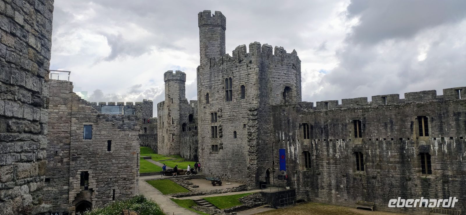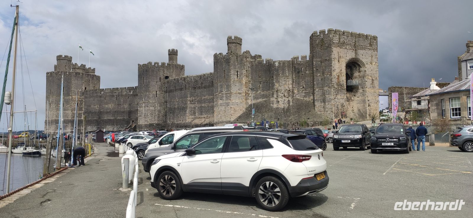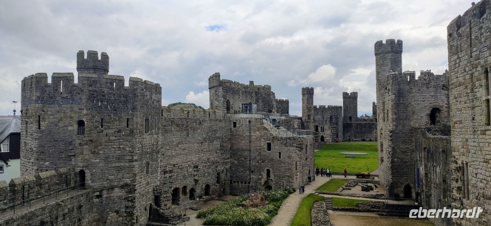 Über die Britannia Bridge fahren wir anschließend wieder zurück aufs Festland und nach Caernarfon. Gemeinsam gehen wir durch das Stadttor hinein in die Stadt und hinüber zu den hohen Mauern der mächtigen Burg. Wir besichtigen diese gewaltige Anlage, mit ihren Ausstellungen in den verschiedenen Türmen und Gebäuden. Die schwarzen, rund angeordnete Steinplatten in der Mitte des Rasens im Schlosshof war die Bühne für die Krönung von Charles zum Prince of Wales im Jahre 1969. Er ist jetzt König und sein Sohn William Prince of Wales, muss aber auch noch hier gekrönt werden.