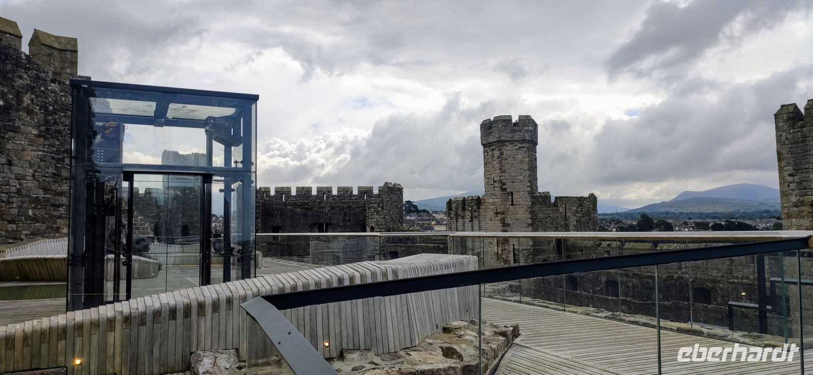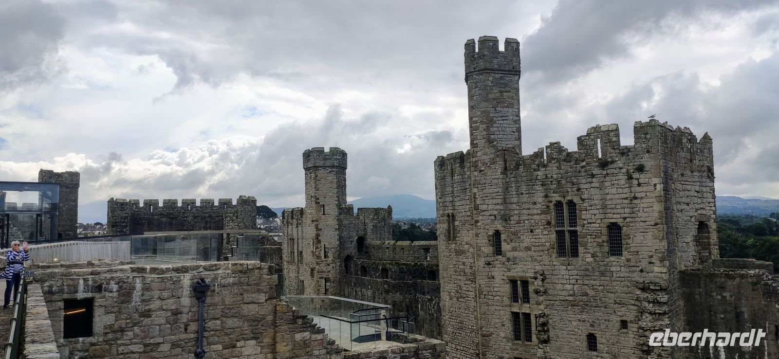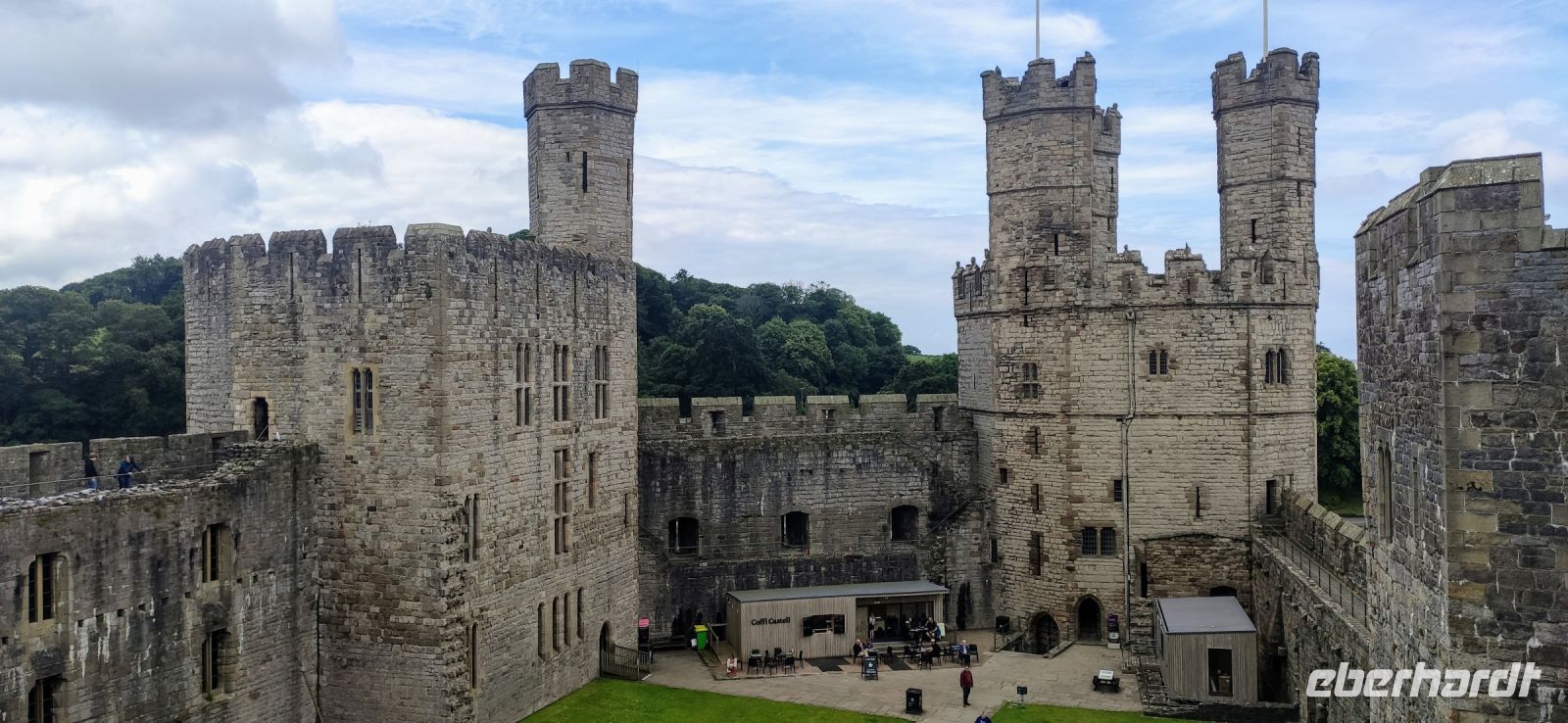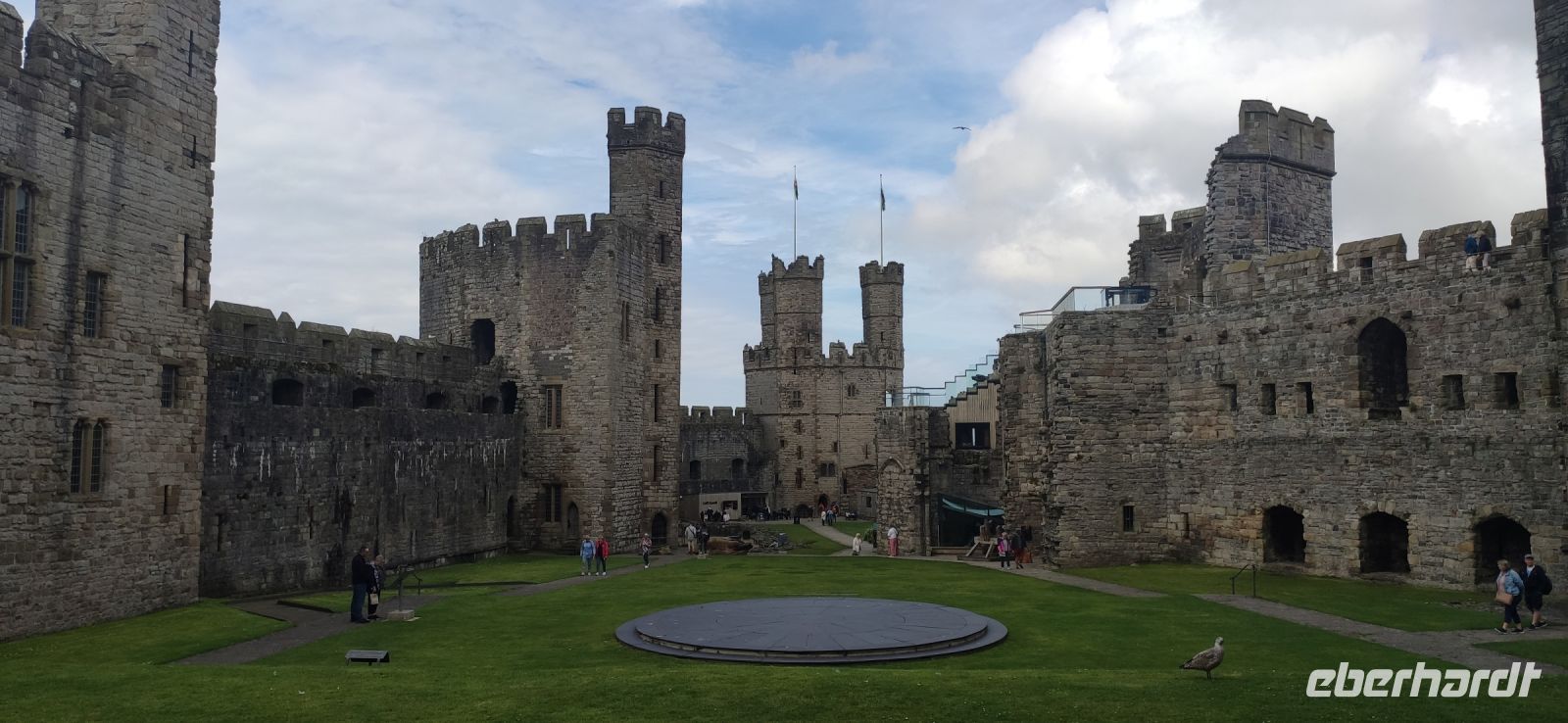 Über die Britannia Bridge fahren wir anschließend wieder zurück aufs Festland und nach Caernarfon. Gemeinsam gehen wir durch das Stadttor hinein in die Stadt und hinüber zu den hohen Mauern der mächtigen Burg. Wir besichtigen diese gewaltige Anlage, mit ihren Ausstellungen in den verschiedenen Türmen und Gebäuden. Die schwarzen, rund angeordnete Steinplatten in der Mitte des Rasens im Schlosshof war die Bühne für die Krönung von Charles zum Prince of Wales im Jahre 1969. Er ist jetzt König und sein Sohn William Prince of Wales, muss aber auch noch hier gekrönt werden.
