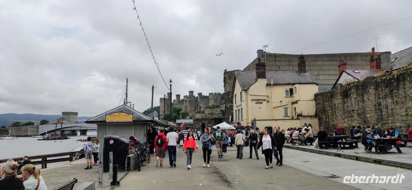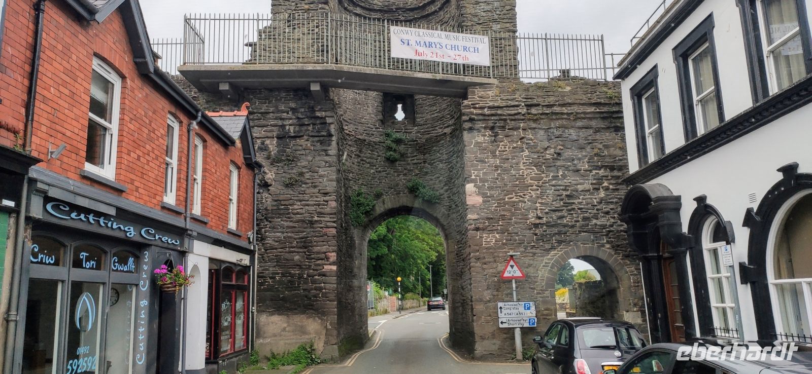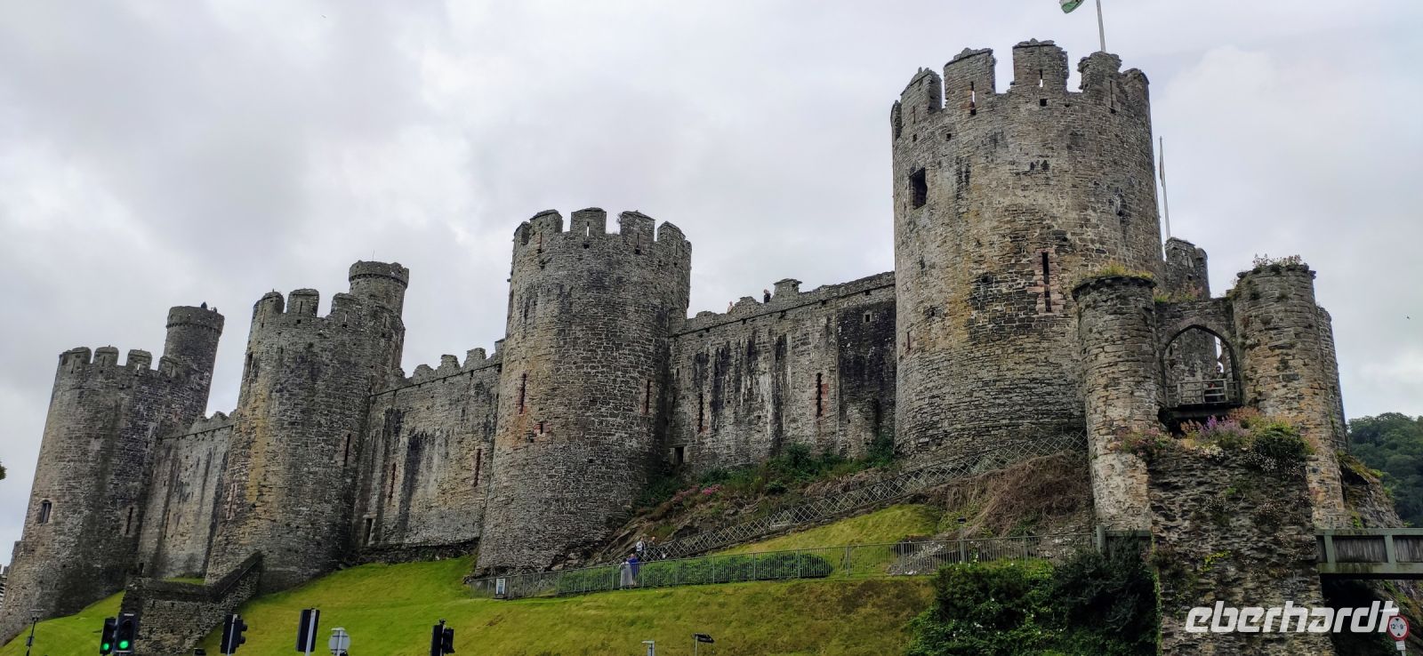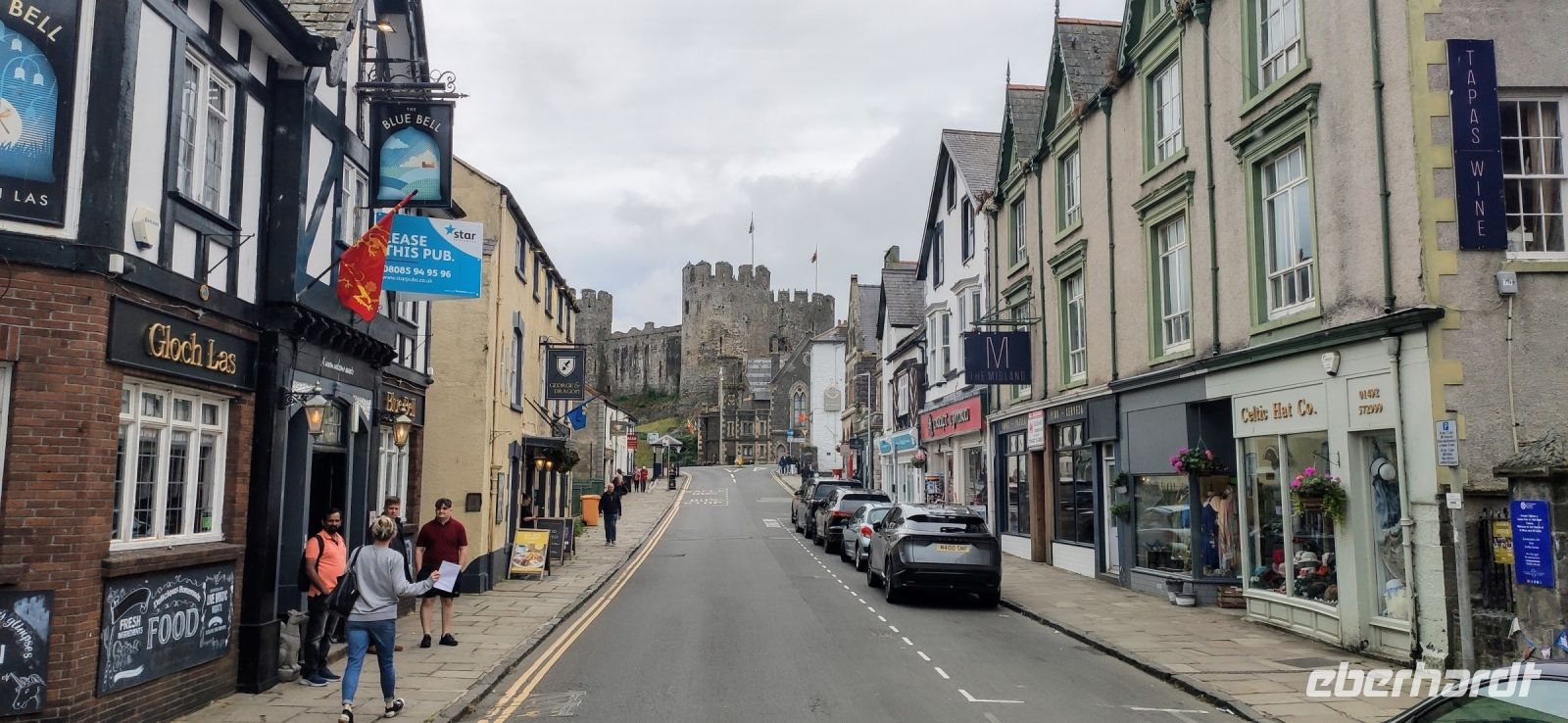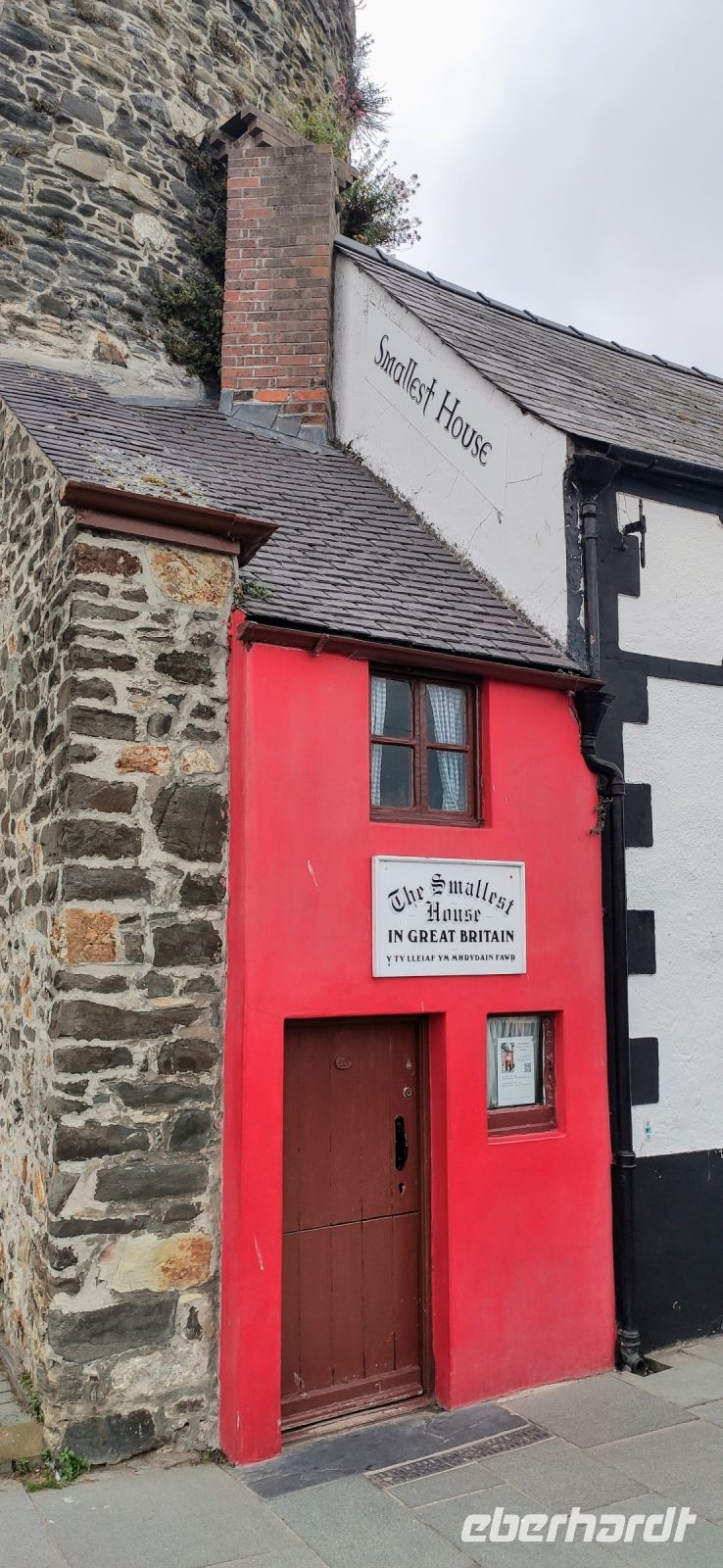 Unser Bus fährt inzwischen zum Bahnhof in Blaneau und ist da, als wir ankommen. Die Schutthalden der Llechwedd Slate Caverns, dem Schieferbergwerk, prägen die Landschaft um den Ort. Wir fahren daran vorbei und über den Pass in das schöne Conwy-Tal und von hier direkt weiter nach Conwy mit seiner gewaltigen Burg. Wir spazieren durch das hübsche Städtchen hinunter zum Hafentor, wo sich unweit das schmalste Haus Großbritanniens an die Stadtmauer schmiegt.