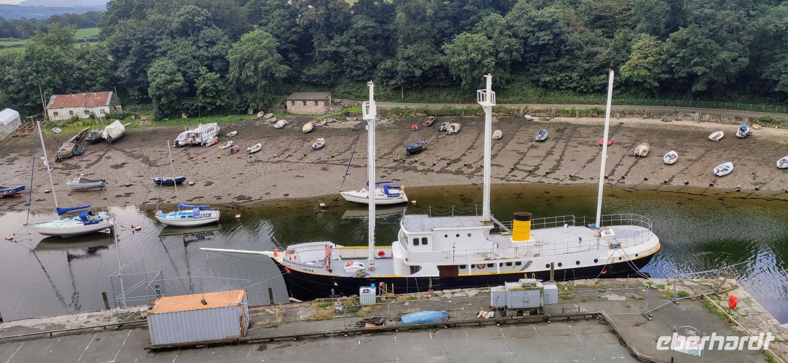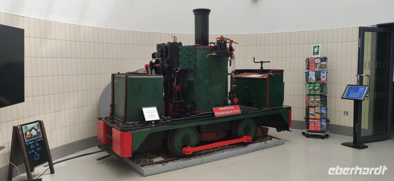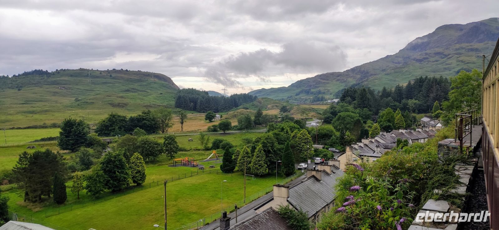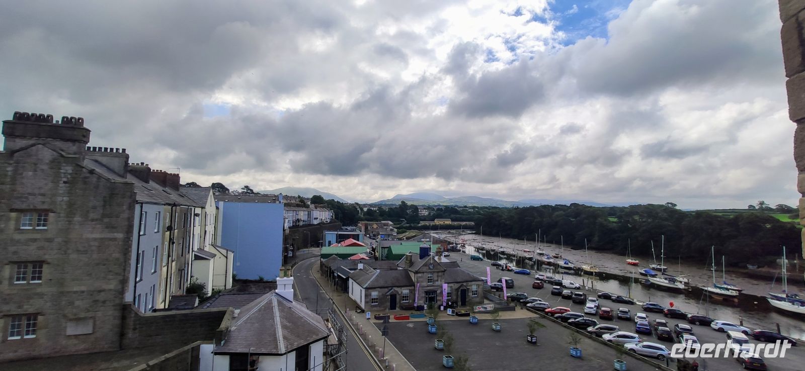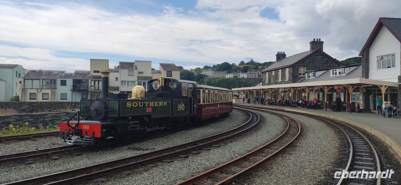 Unser Bus fährt inzwischen zum Bahnhof in Blaneau und ist da, als wir ankommen. Die Schutthalden der Llechwedd Slate Caverns, dem Schieferbergwerk, prägen die Landschaft um den Ort. Wir fahren daran vorbei und über den Pass in das schöne Conwy-Tal und von hier direkt weiter nach Conwy mit seiner gewaltigen Burg. Wir spazieren durch das hübsche Städtchen hinunter zum Hafentor, wo sich unweit das schmalste Haus Großbritanniens an die Stadtmauer schmiegt.