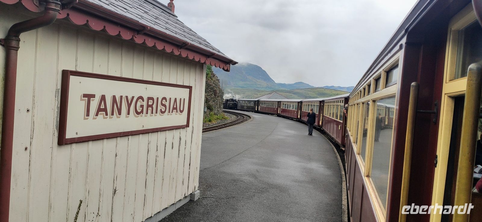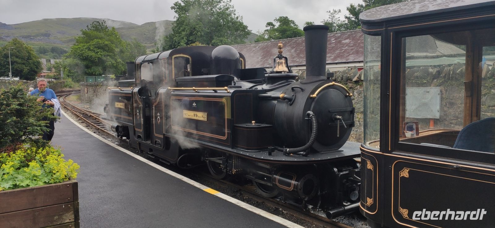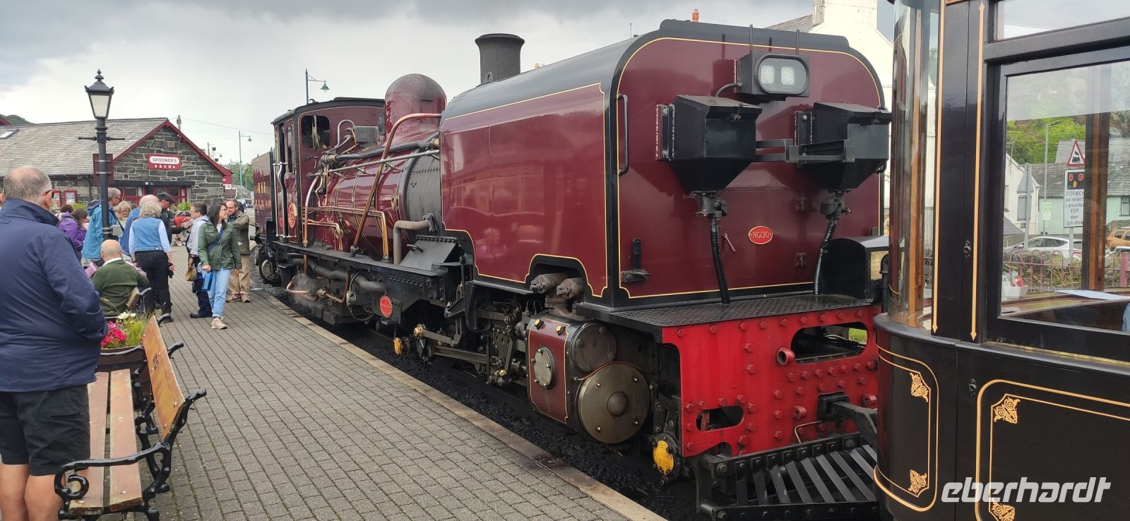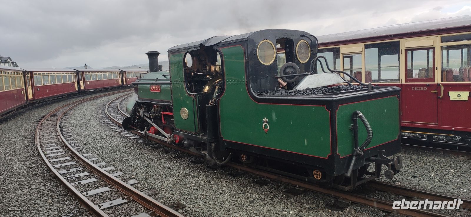 In Beddgelert zieht uns kurz die Legende vom begrabenen Hund Gelert in ihren Bann. Dann in Porthmadog angekommen, steigen wir in die Ffestiniog Railway um. Für die Gruppe ist ein ganzer Wagen reserviert, Nr. 108. Wir haben noch ausreichend Zeit für Fotos und schauen zu wie Wasser und Kohlen in die Lok übernommen werden. Auch ein Zug der Welsh Highland Railway steht im Bahnhof. Leider beginnt es jetzt zu Regnen.