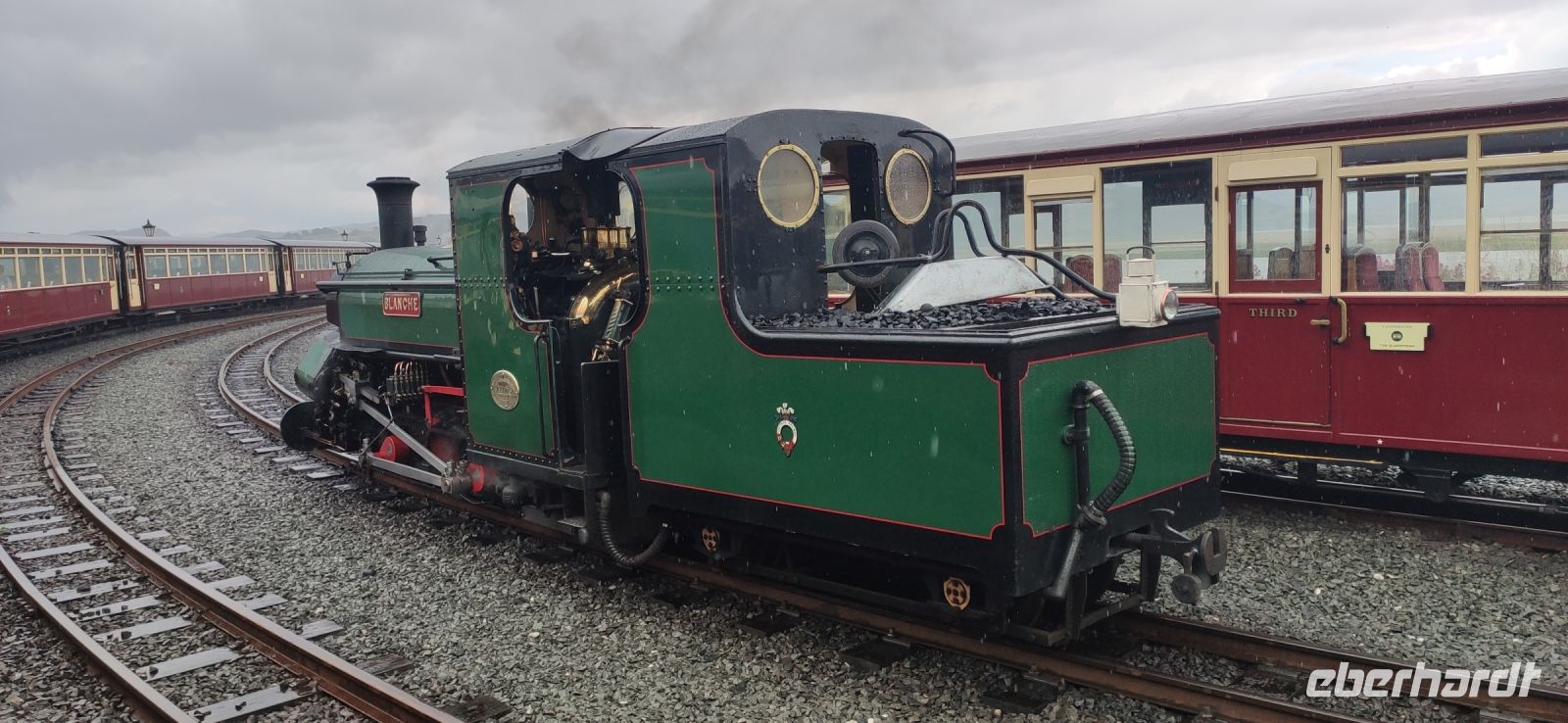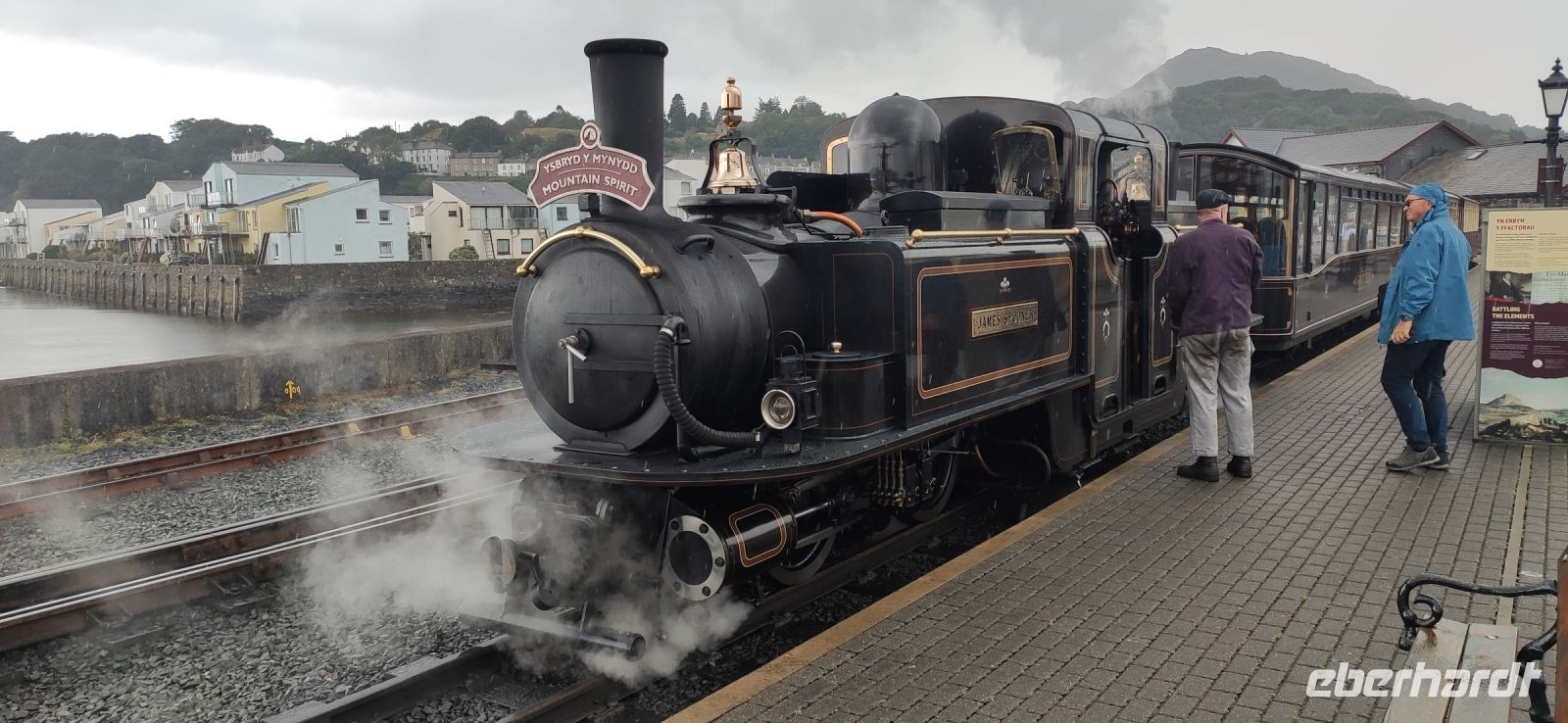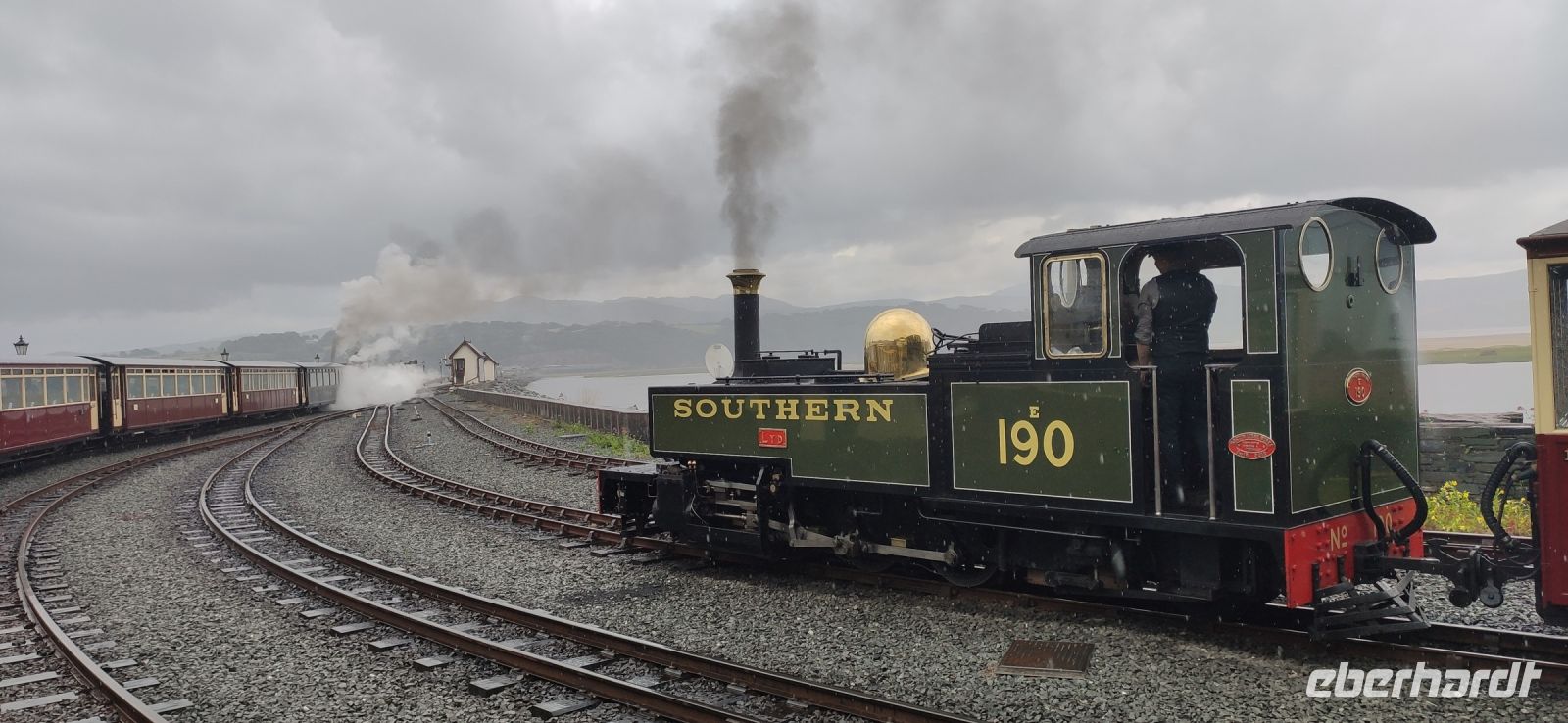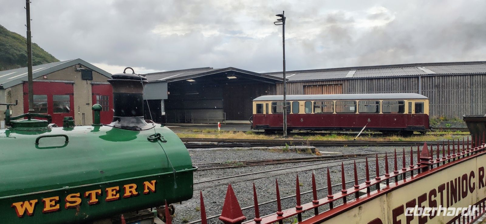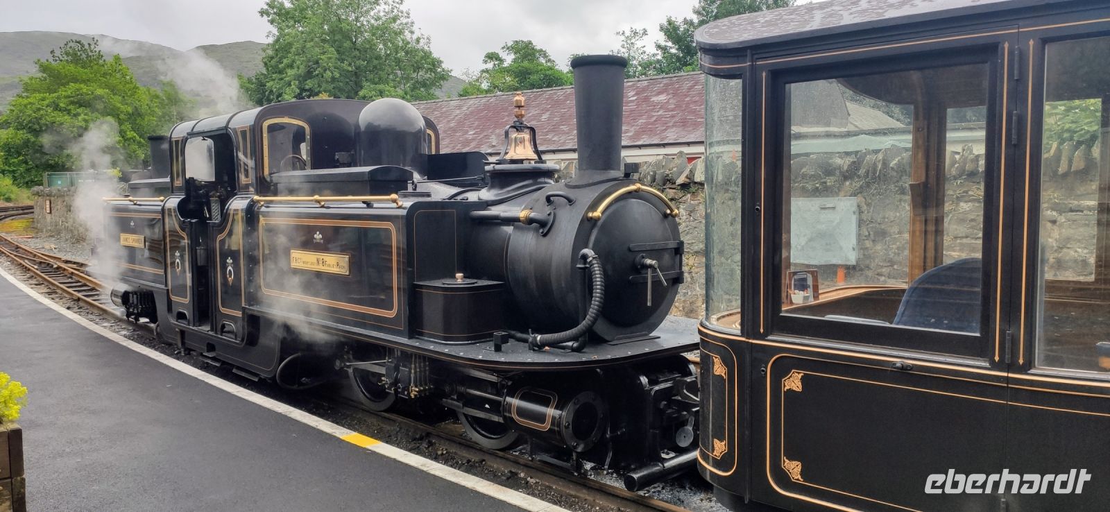 In Beddgelert zieht uns kurz die Legende vom begrabenen Hund Gelert in ihren Bann. Dann in Porthmadog angekommen, steigen wir in die Ffestiniog Railway um. Für die Gruppe ist ein ganzer Wagen reserviert, Nr. 108. Wir haben noch ausreichend Zeit für Fotos und schauen zu wie Wasser und Kohlen in die Lok übernommen werden. Auch ein Zug der Welsh Highland Railway steht im Bahnhof. Leider beginnt es jetzt zu Regnen.