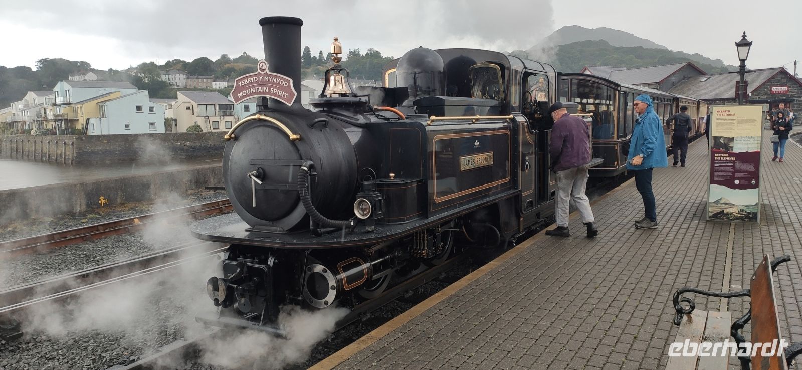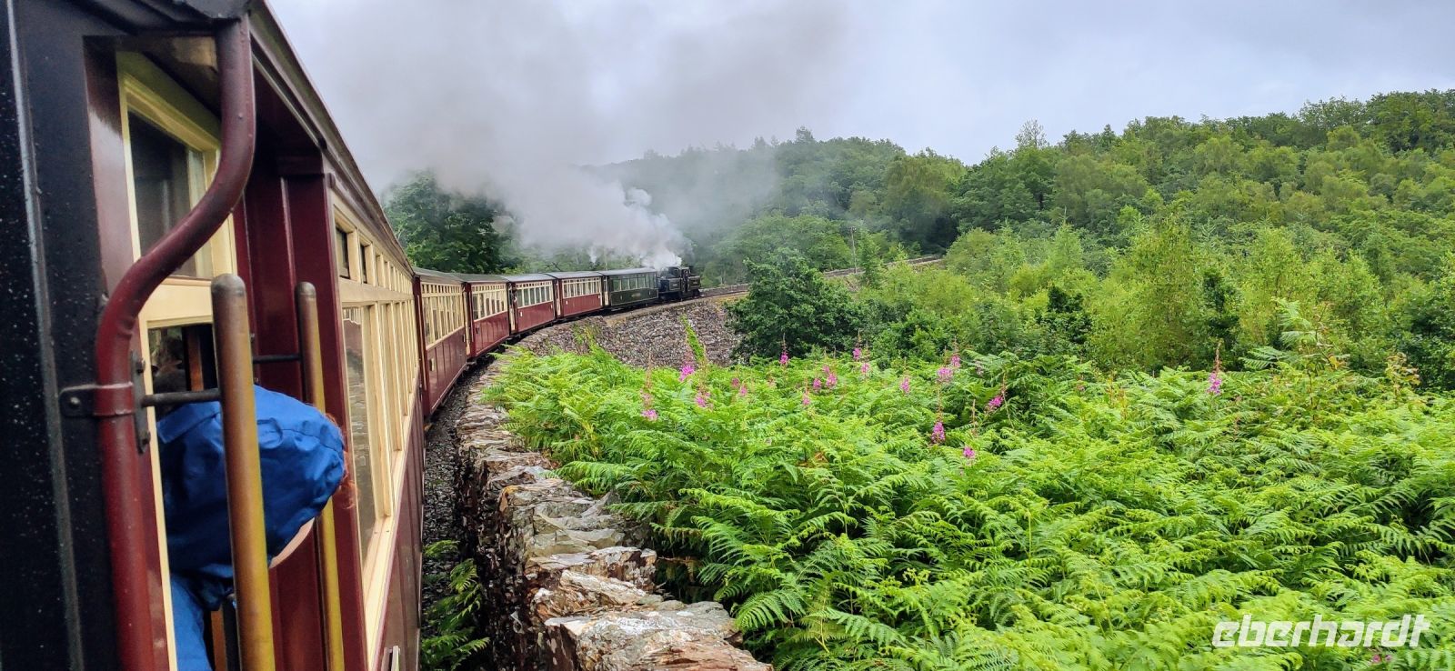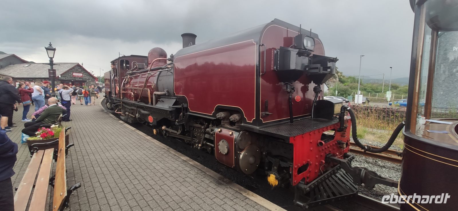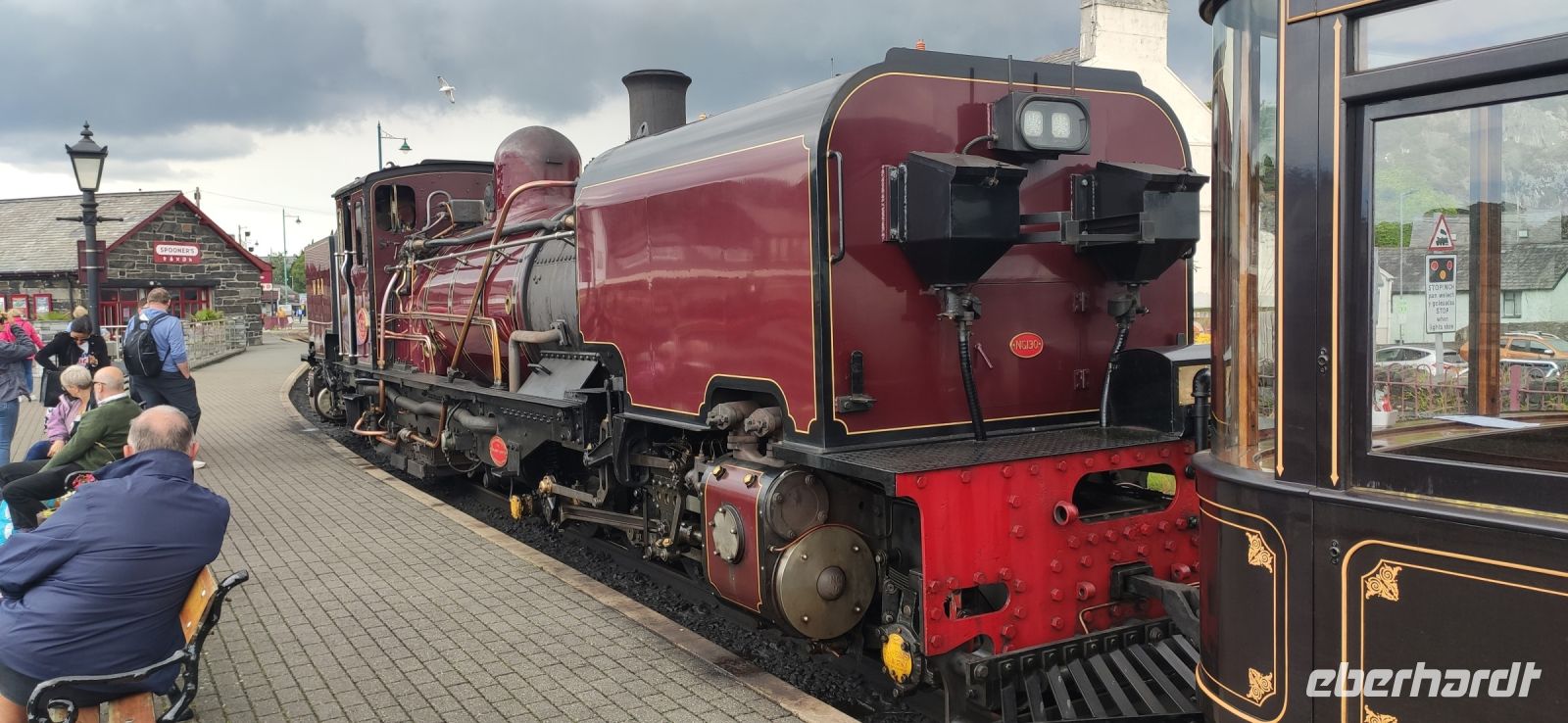 In Beddgelert zieht uns kurz die Legende vom begrabenen Hund Gelert in ihren Bann. Dann in Porthmadog angekommen, steigen wir in die Ffestiniog Railway um. Für die Gruppe ist ein ganzer Wagen reserviert, Nr. 108. Wir haben noch ausreichend Zeit für Fotos und schauen zu wie Wasser und Kohlen in die Lok übernommen werden. Auch ein Zug der Welsh Highland Railway steht im Bahnhof. Leider beginnt es jetzt zu Regnen.