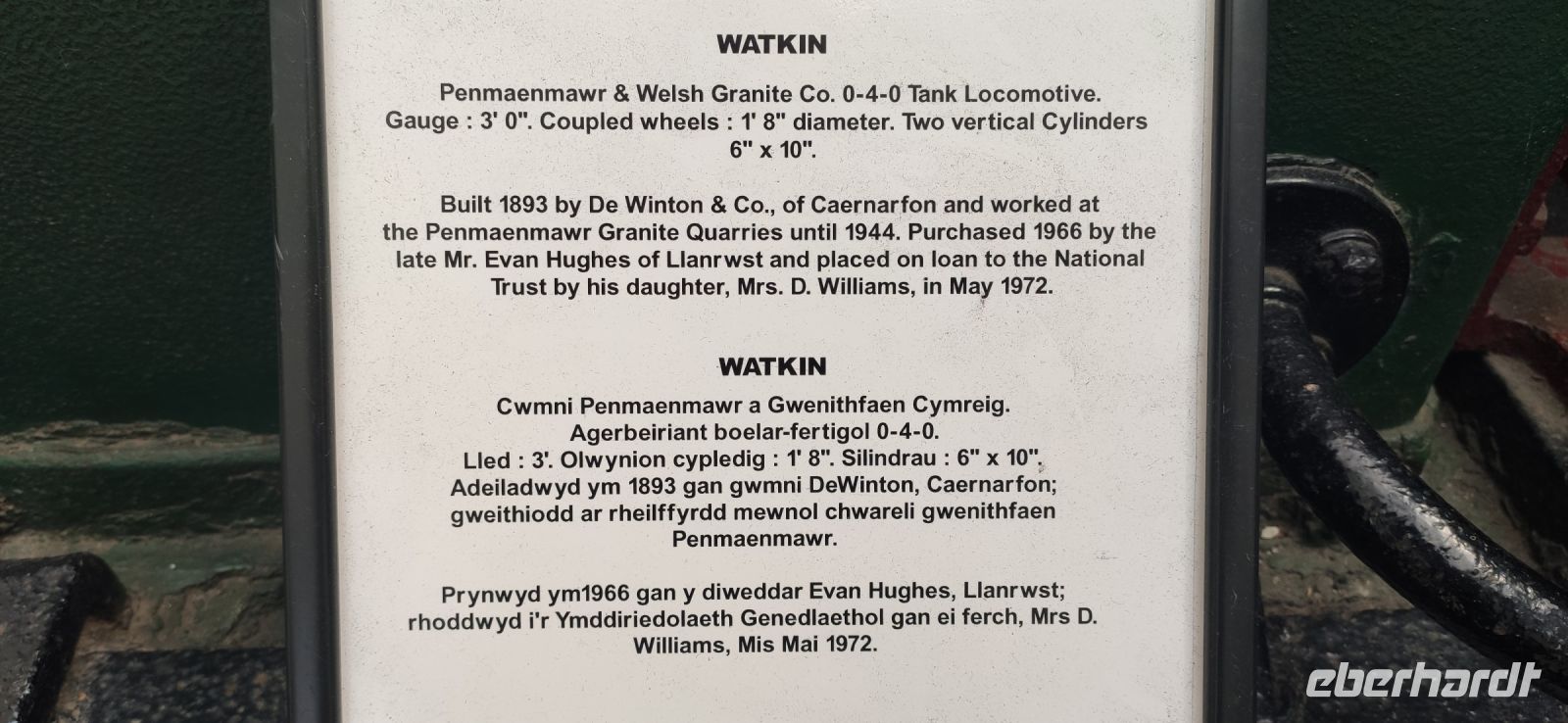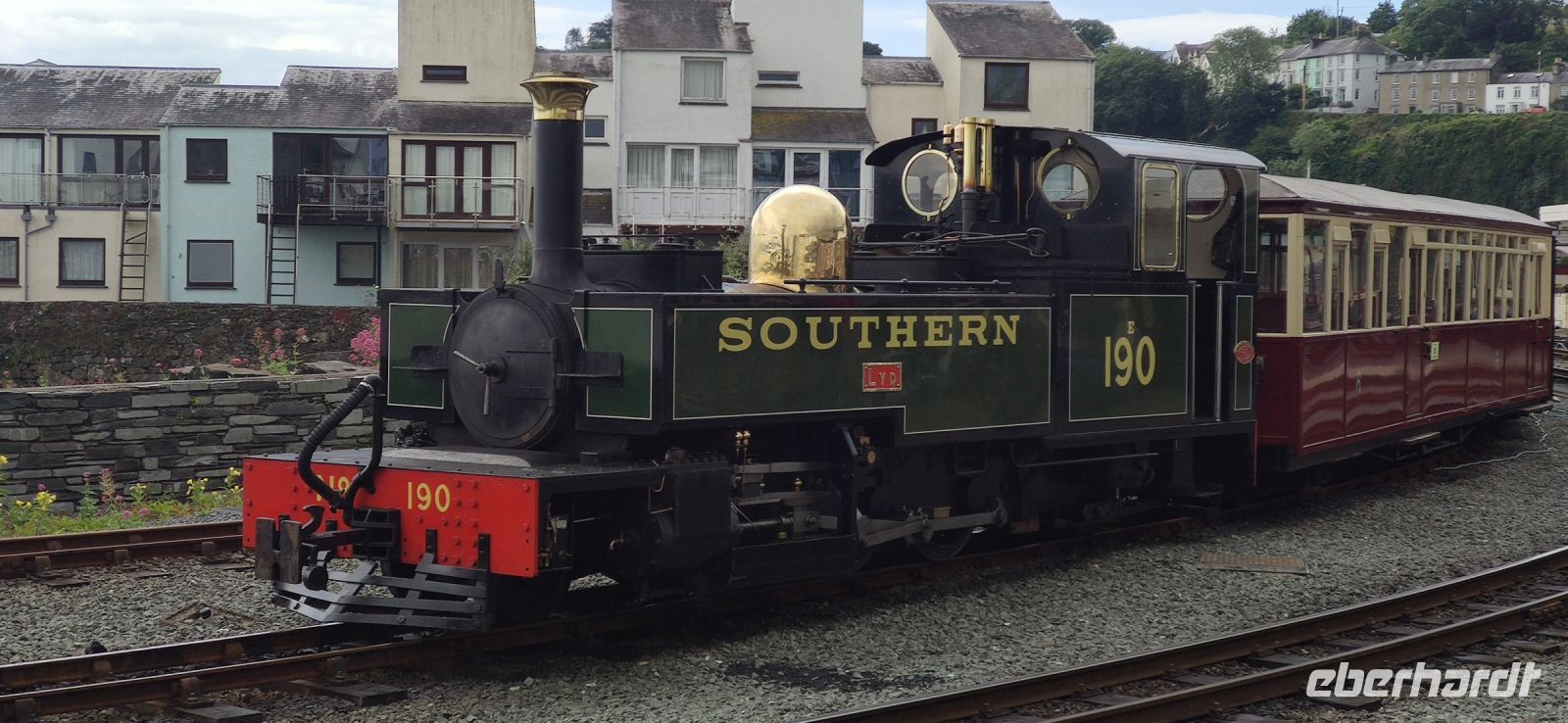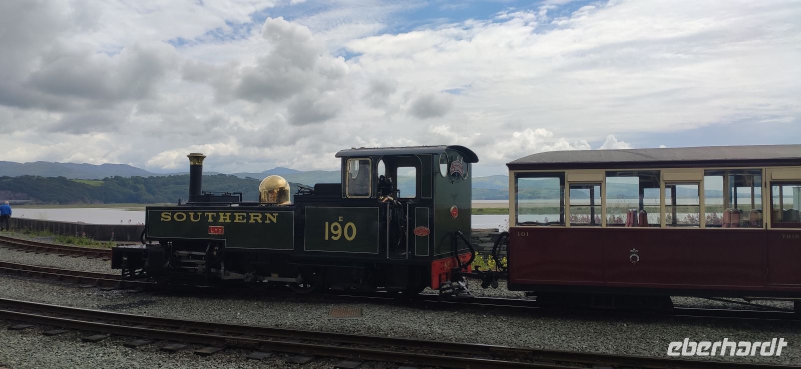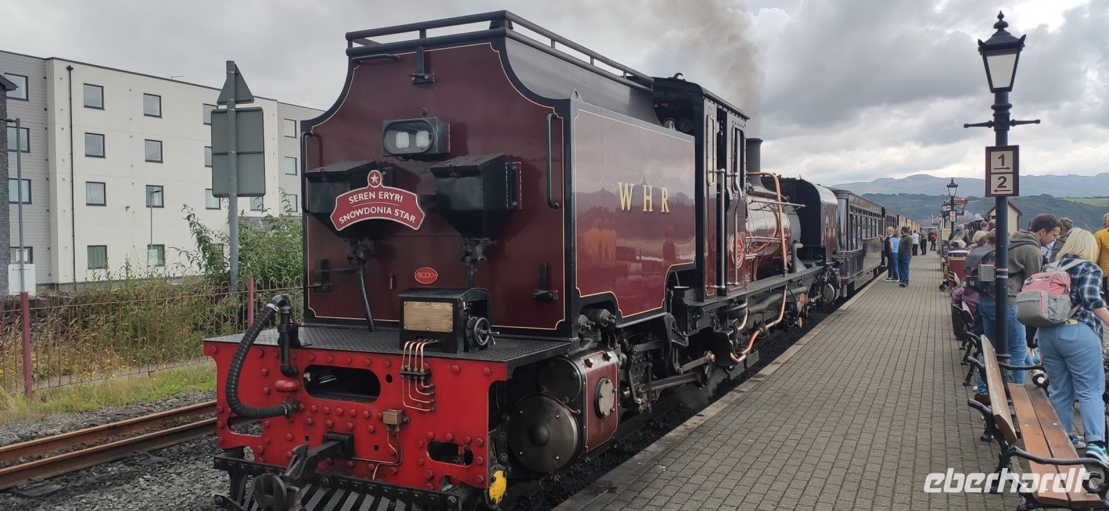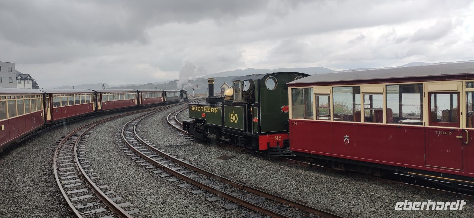 In Beddgelert zieht uns kurz die Legende vom begrabenen Hund Gelert in ihren Bann. Dann in Porthmadog angekommen, steigen wir in die Ffestiniog Railway um. Für die Gruppe ist ein ganzer Wagen reserviert, Nr. 108. Wir haben noch ausreichend Zeit für Fotos und schauen zu wie Wasser und Kohlen in die Lok übernommen werden. Auch ein Zug der Welsh Highland Railway steht im Bahnhof. Leider beginnt es jetzt zu Regnen.