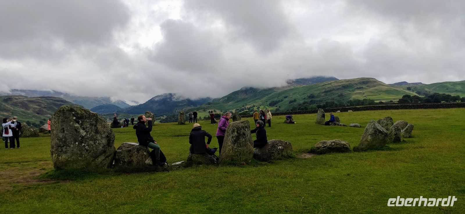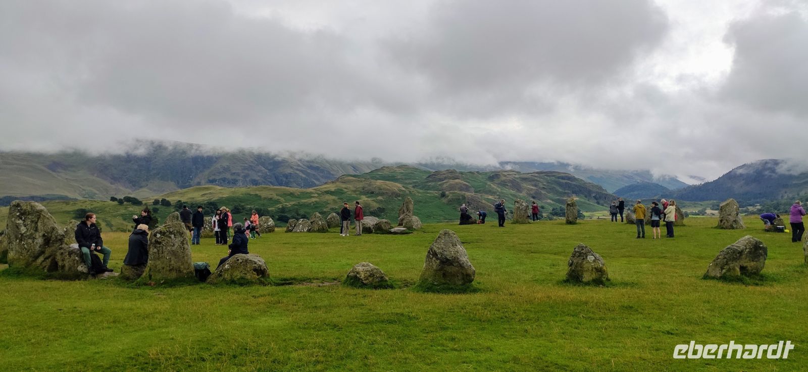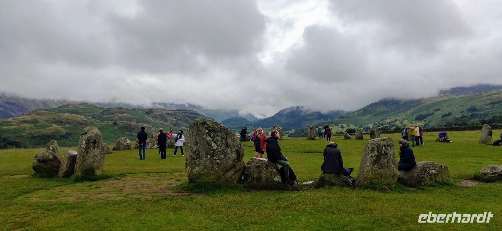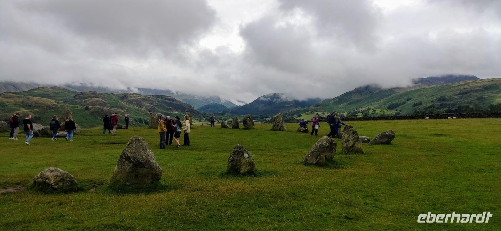 An der Schiffsanlegestelle steigen wir aus und müssen nicht lange auf unser Ausflugsschiff warten. Leider regnet es weiter, auch als wir auf das Ausflugsschiff steigen. Gemächlich schippern wir nach Ambleside am nördlichen See-Ende. Nach einer kleinen Pause fahren wir hinein ins Gebirge, Richtung Keswick und zum Steinkreis von Castlerigg, wo wir bei einem Fotostopp die schöne Aussicht genießen, umgeben von einigen der höchsten Berge des Lake Disticts. Hier machen wir auch Mittag.