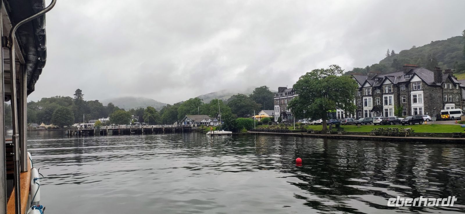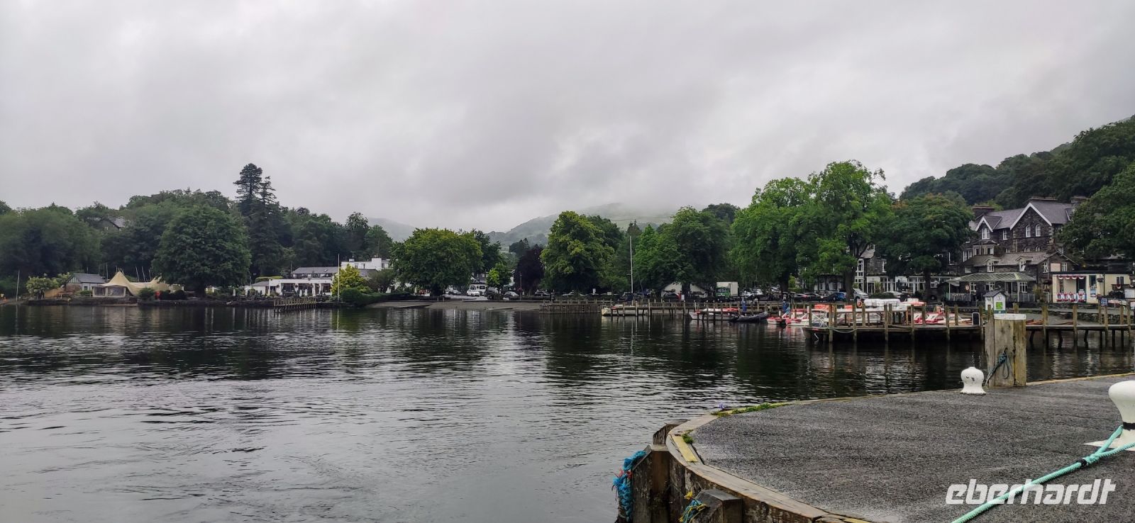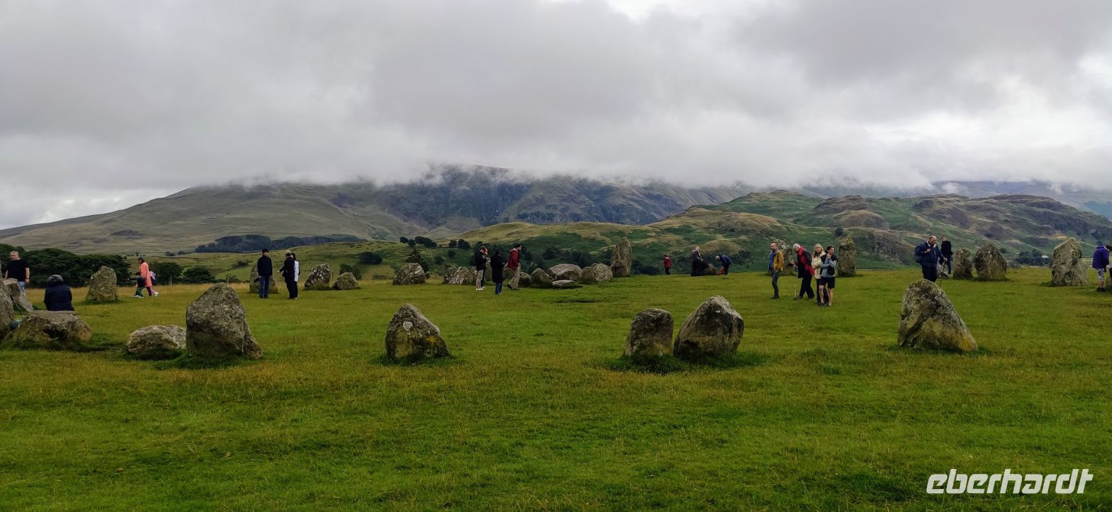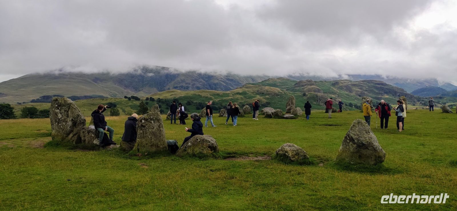 An der Schiffsanlegestelle steigen wir aus und müssen nicht lange auf unser Ausflugsschiff warten. Leider regnet es weiter, auch als wir auf das Ausflugsschiff steigen. Gemächlich schippern wir nach Ambleside am nördlichen See-Ende. Nach einer kleinen Pause fahren wir hinein ins Gebirge, Richtung Keswick und zum Steinkreis von Castlerigg, wo wir bei einem Fotostopp die schöne Aussicht genießen, umgeben von einigen der höchsten Berge des Lake Disticts. Hier machen wir auch Mittag.