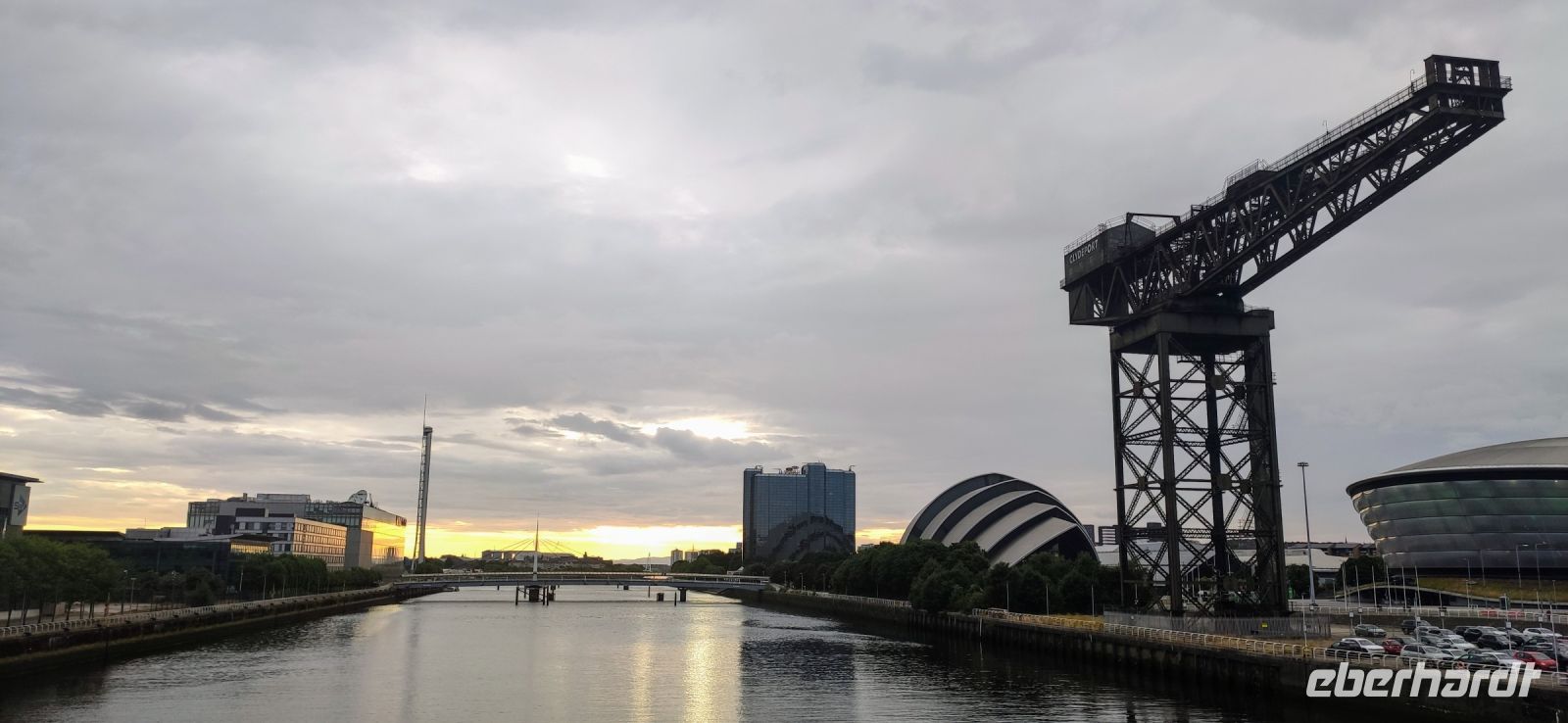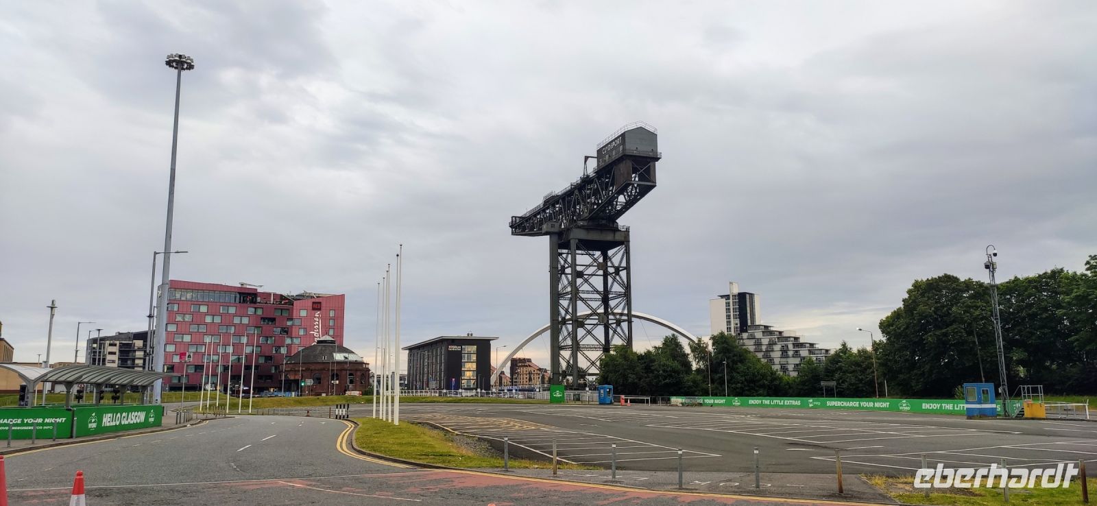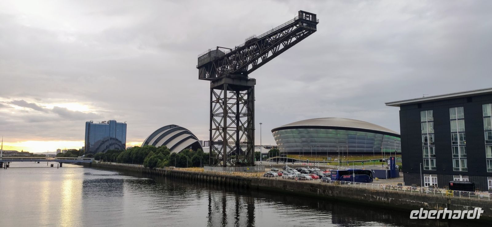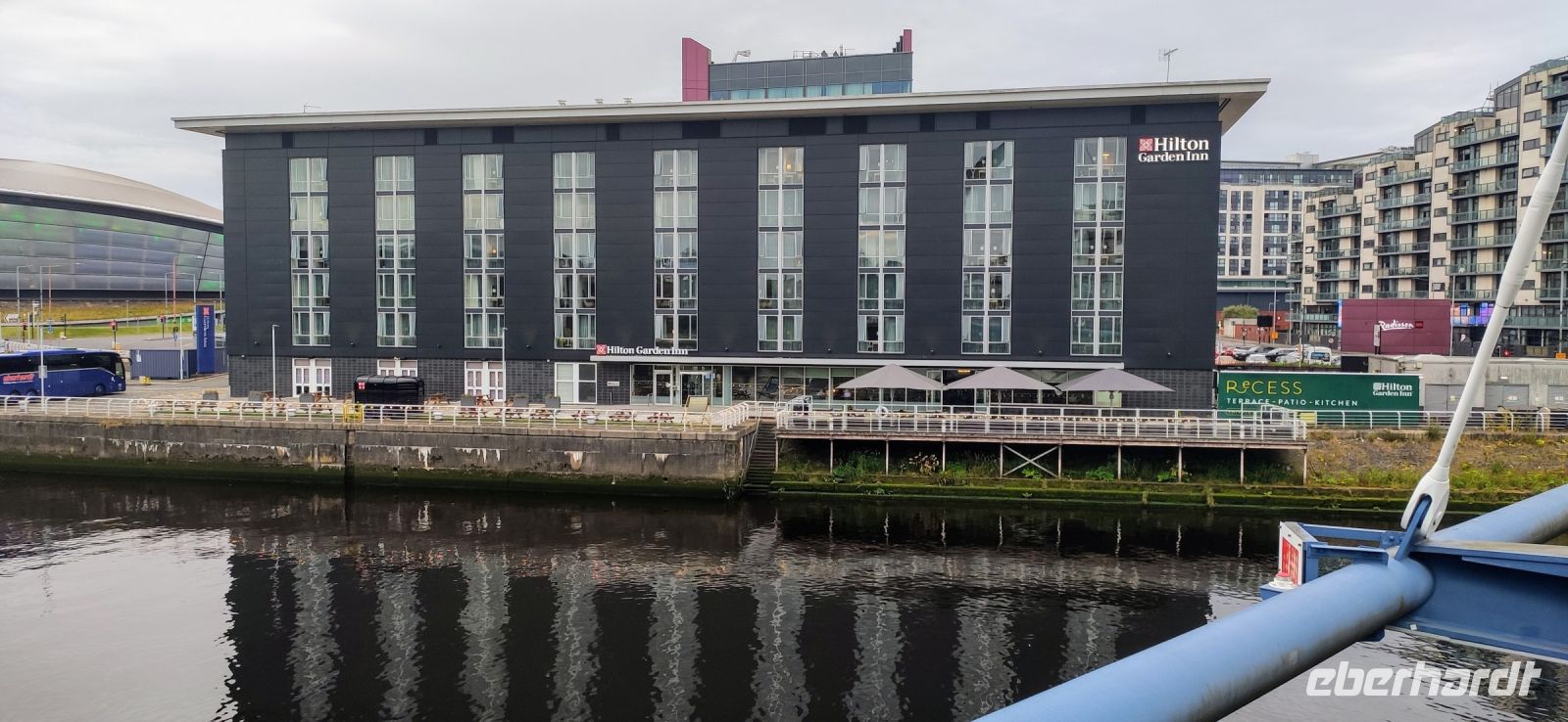Das Hilton Hotel Park Inn liegt direkt im neuen City Centre. Daneben das „Gürteltier“ von Sir Norman Foster und das OVO Hydro sowie der alte Werftkran Finnieston Crane.