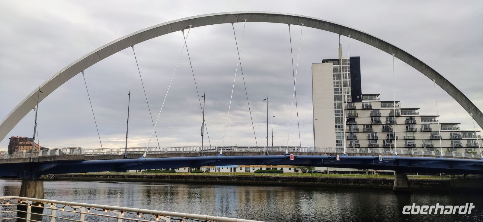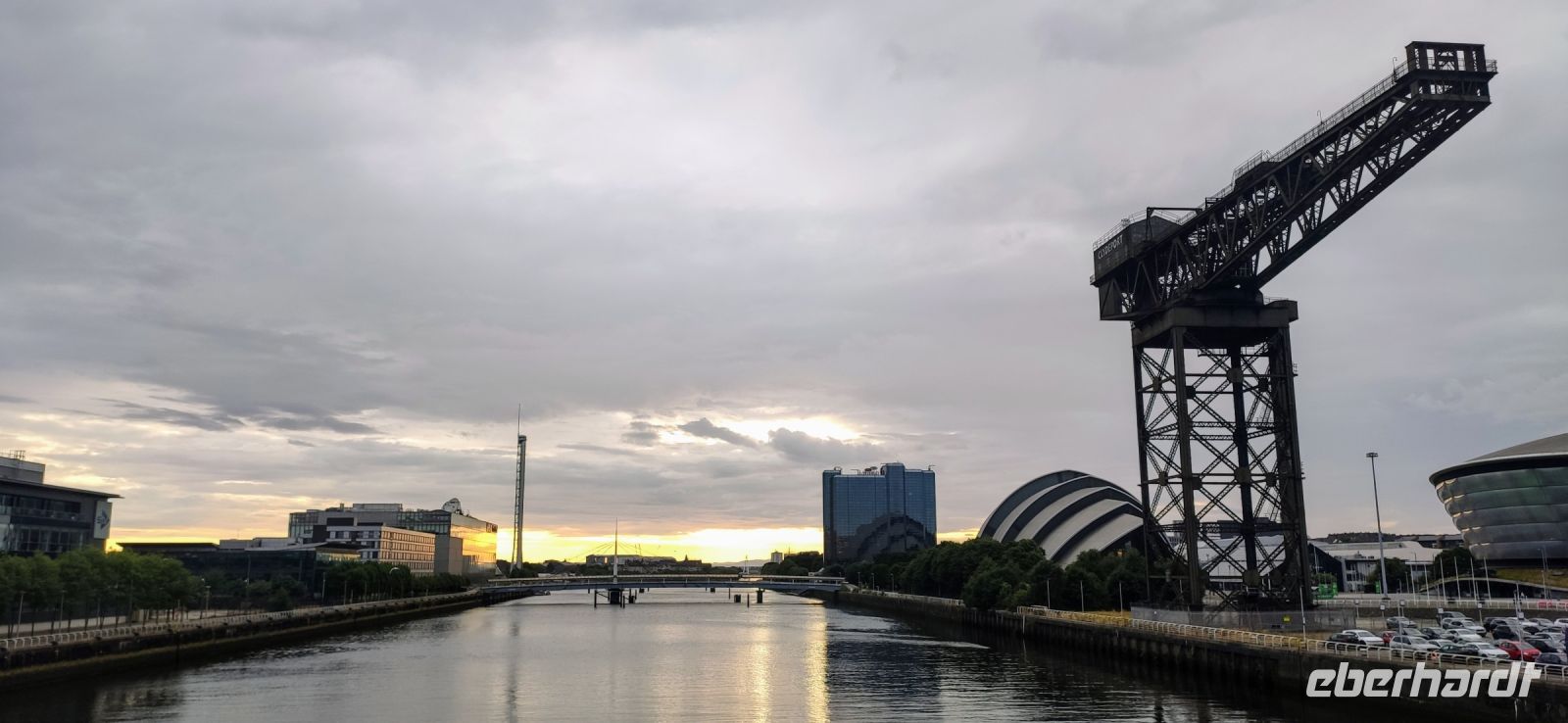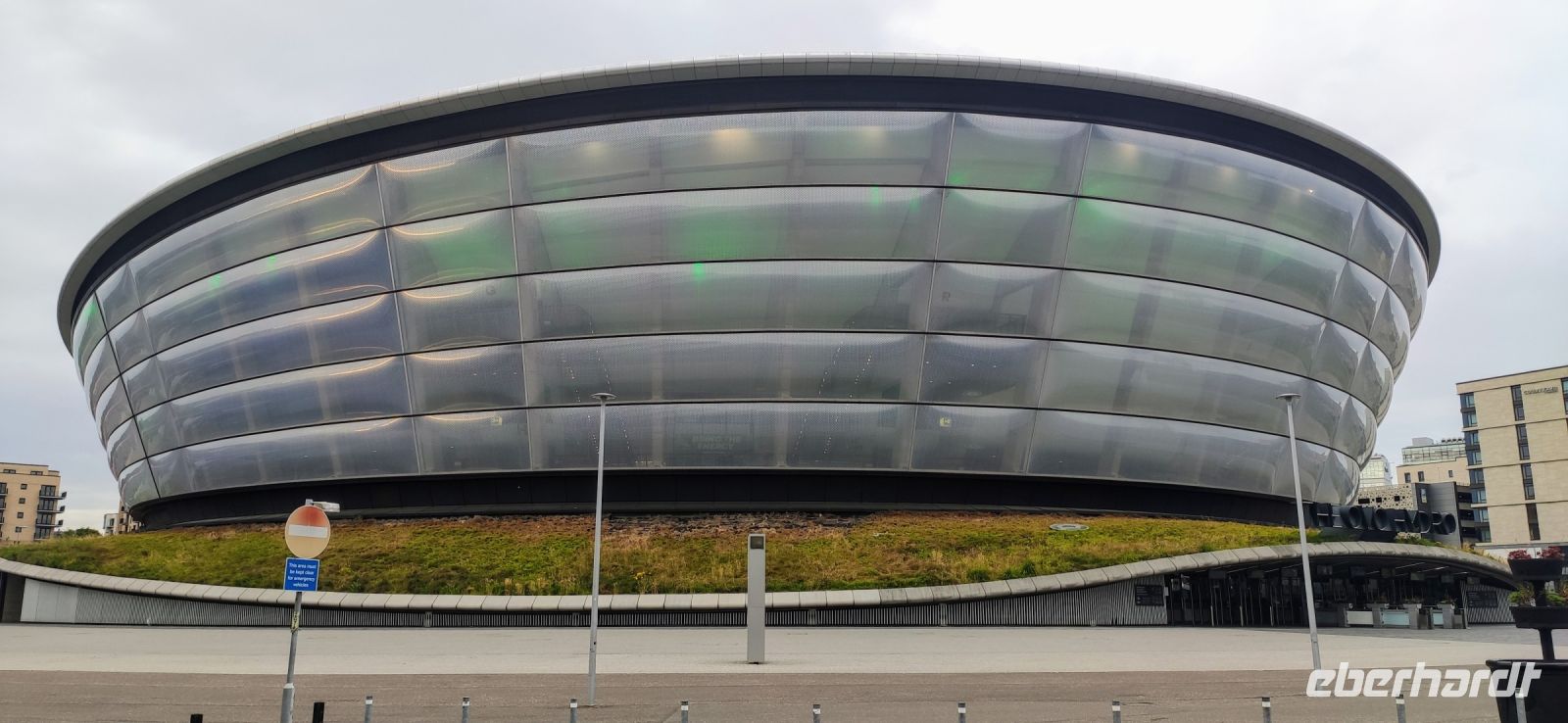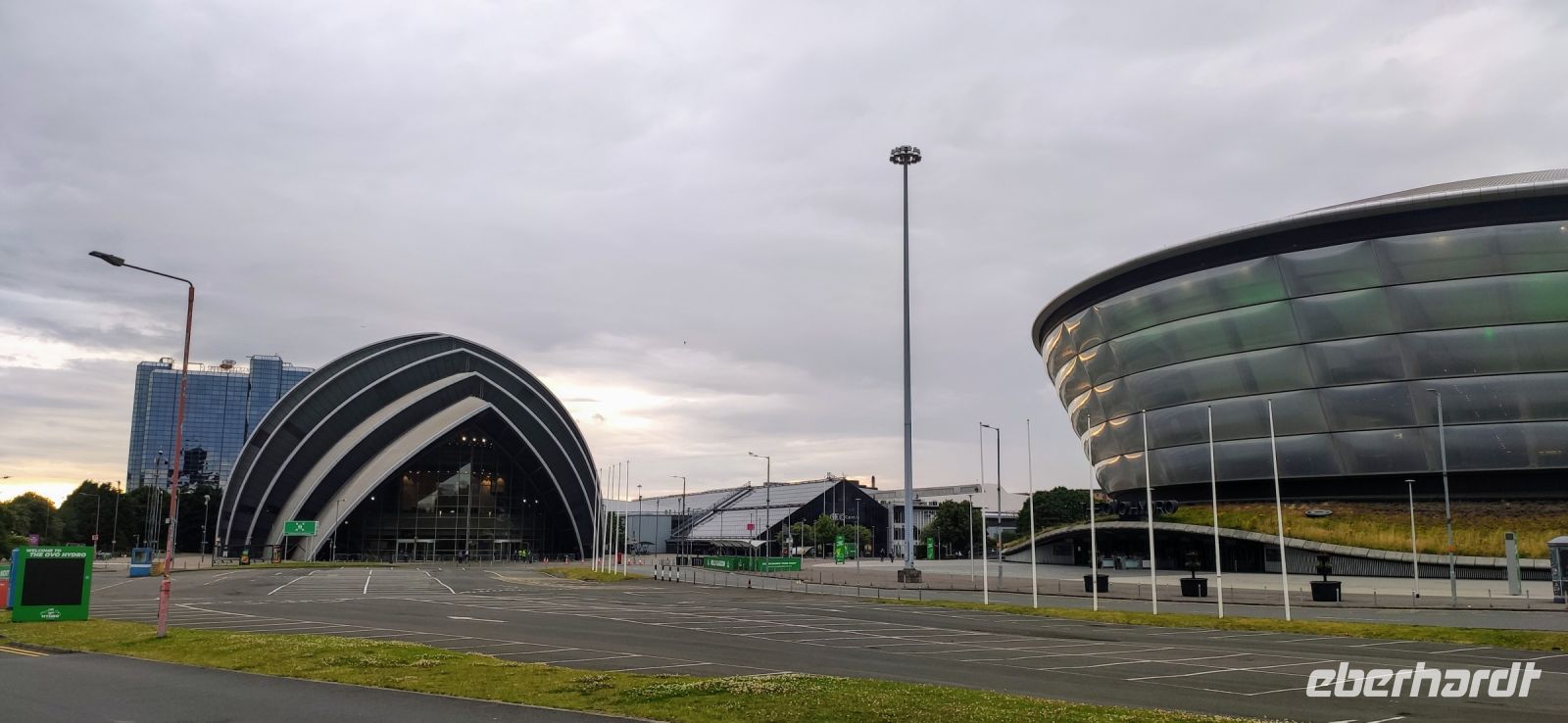 Das Hilton Hotel Park Inn liegt direkt im neuen City Centre. Daneben das „Gürteltier“ von Sir Norman Foster und das OVO Hydro sowie der alte Werftkran Finnieston Crane.