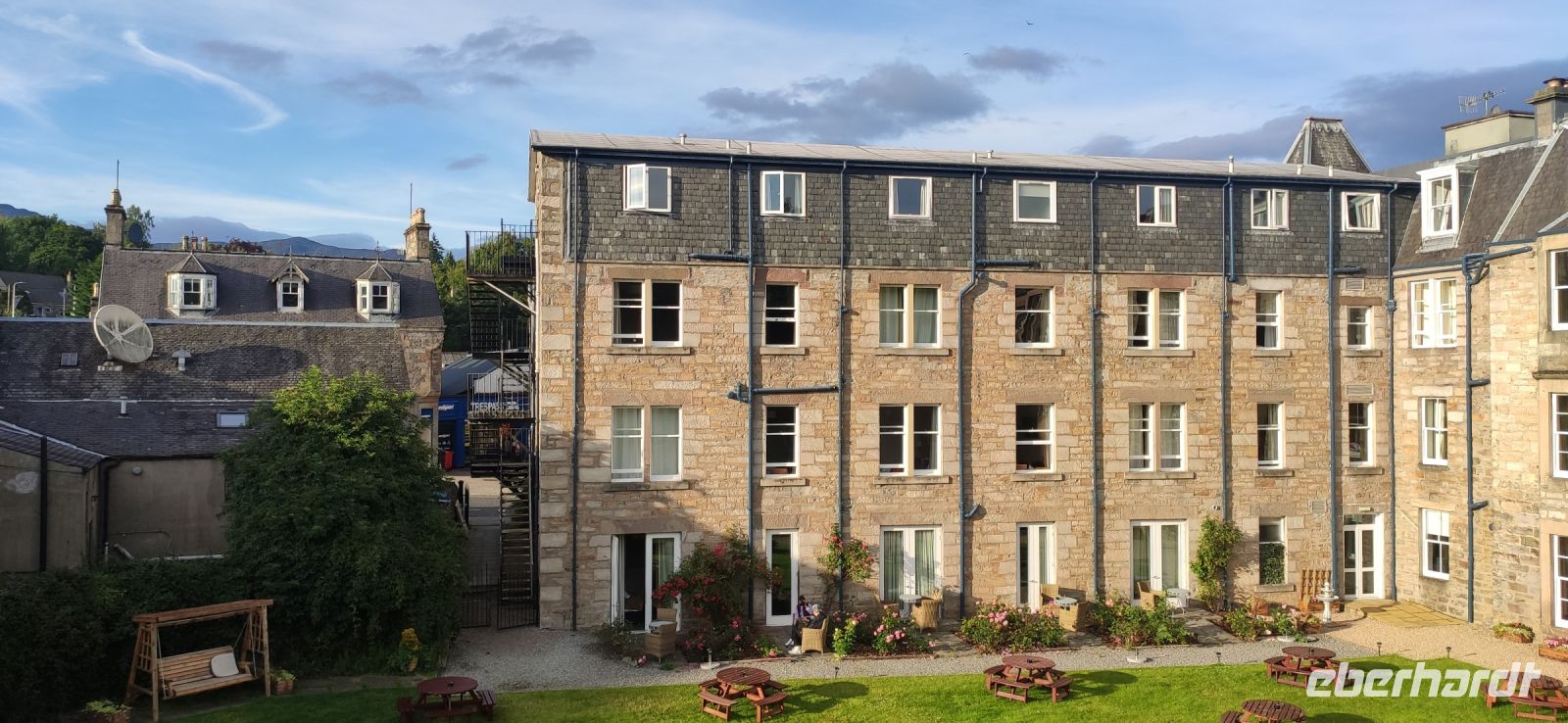 Am Nachmittag fahren wir am See weiter hinauf, durch Inverness (schöne Stadtansicht bei Brückenüberfahrt) und erreichen wir den nördlichsten Punkt der Reise. Nun geht es wieder südwärts und in den Cairngorm Nationalpark. Nach dem Pass der Grampian Mountains fahren wir hinunter nach Pitlochry. Kurzer Fotostopp noch am Blair Castle und dann erreichen wir gleich Fishers Hotel im Stadtzentrum von Pitlochry.
