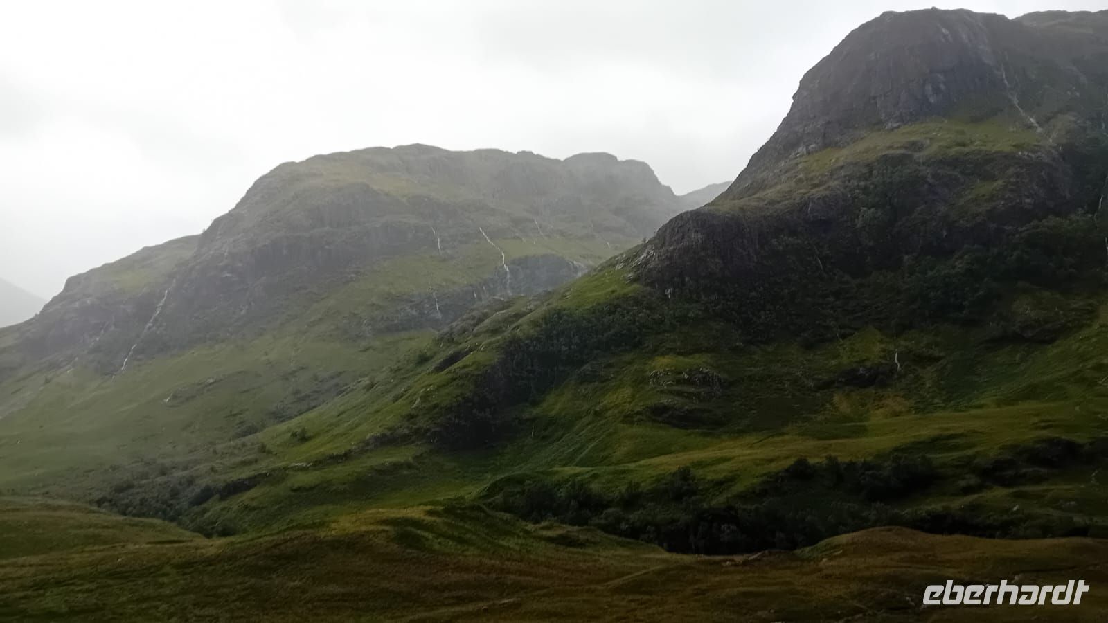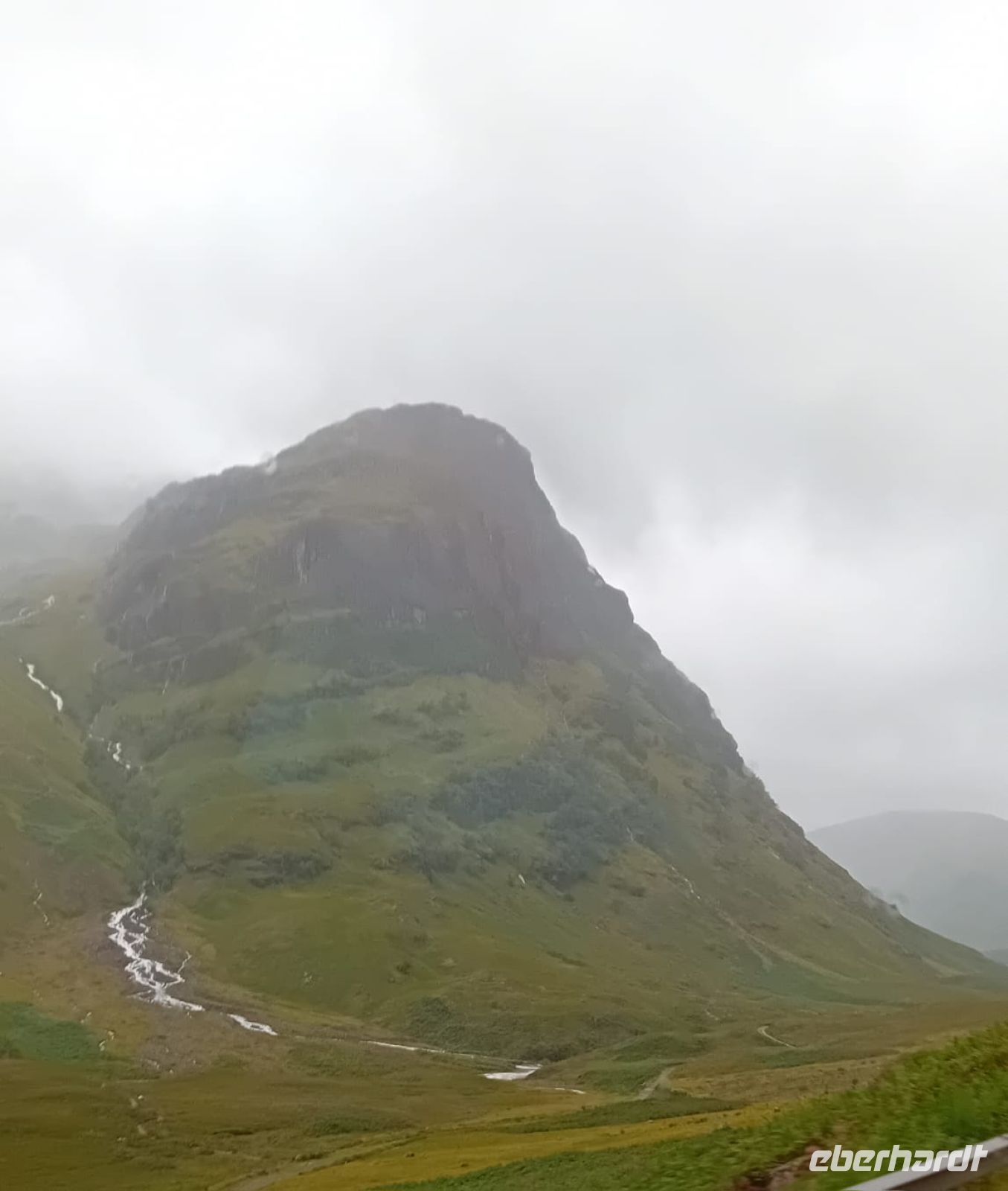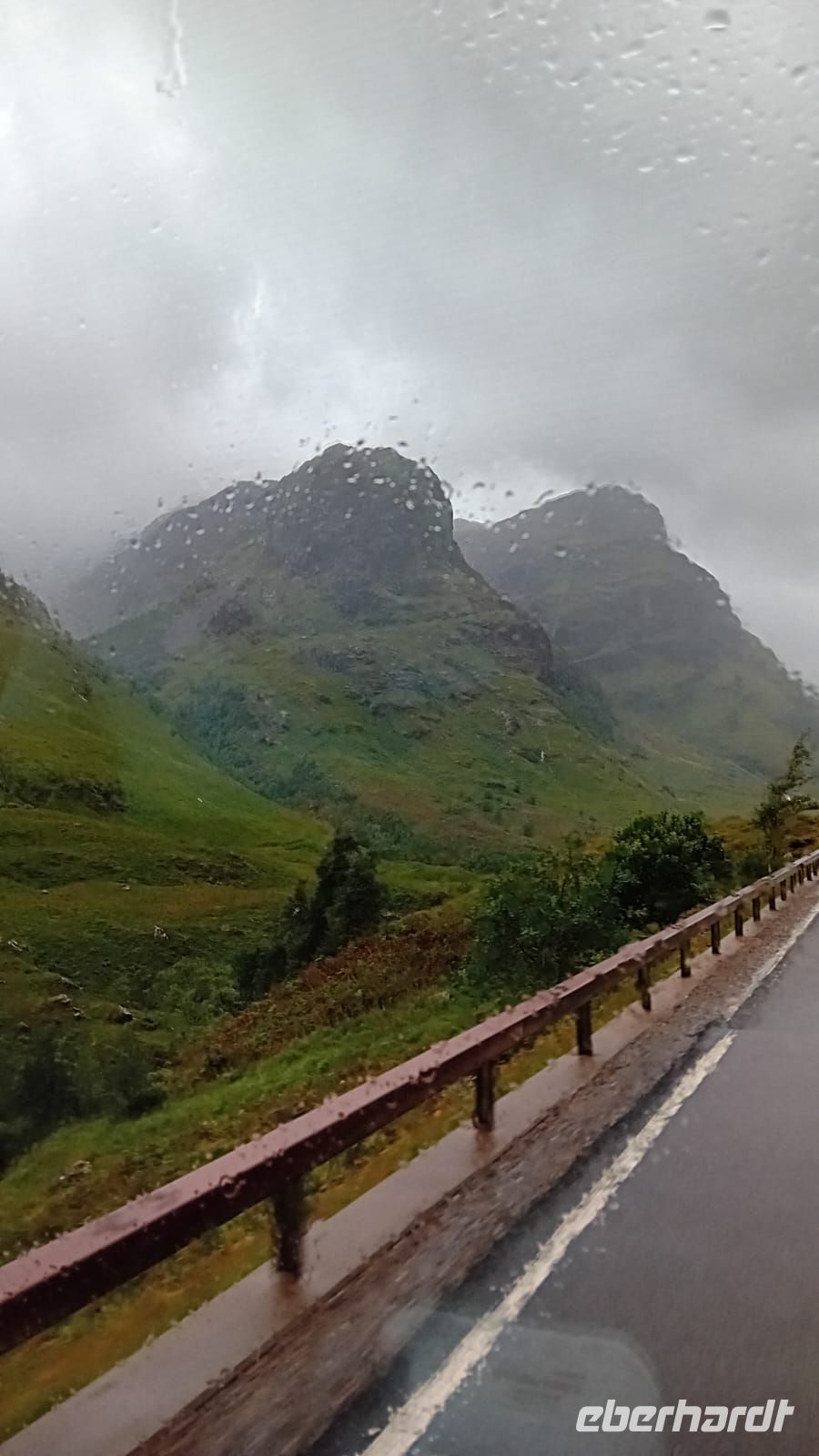 Weiter ging es in das berühmte Glen Coe, eines der dramatischsten Täler Schottlands. Das stürmische Wetter verstärkte den Eindruck der wilden, ungezähmten Natur, die hier allgegenwärtig ist. Besonders beeindruckend war der Blick auf die „Three Sisters“, deren markante Gipfel sich trotz der Wolken majestätisch gegen den Himmel abzeichneten.