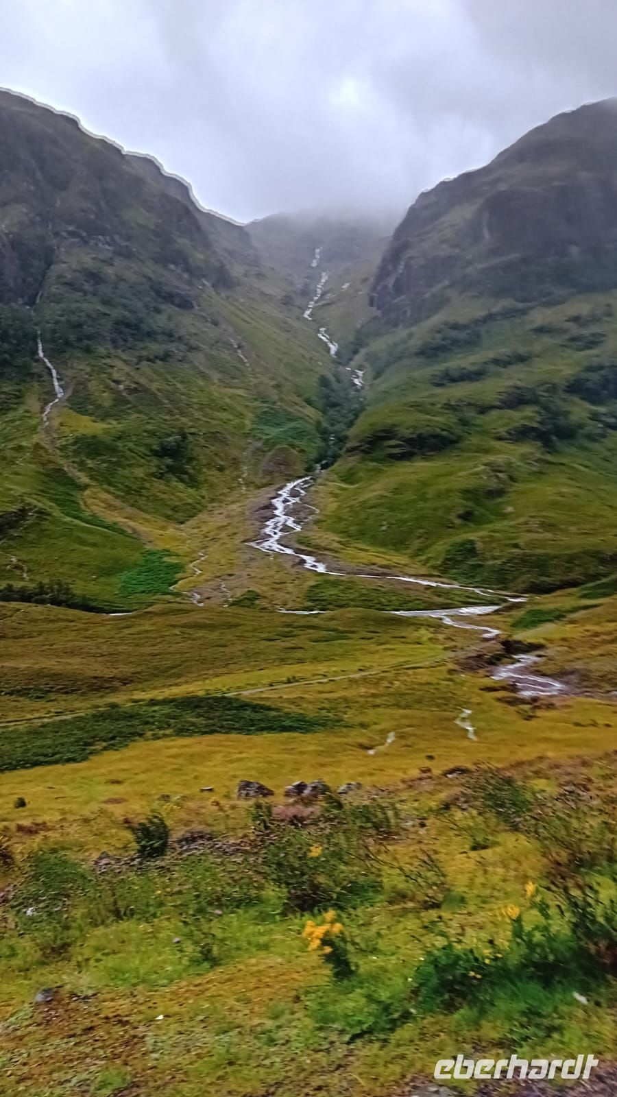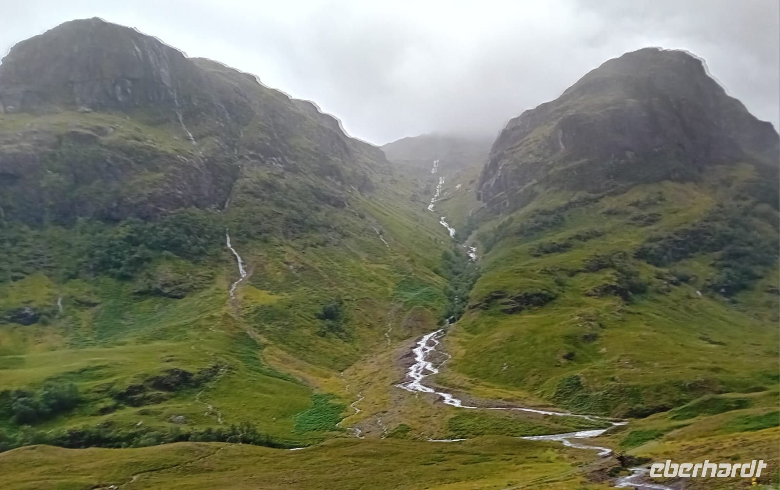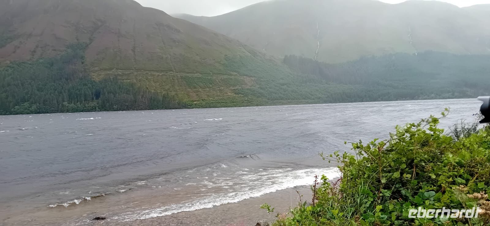 Weiter ging es in das berühmte Glen Coe, eines der dramatischsten Täler Schottlands. Das stürmische Wetter verstärkte den Eindruck der wilden, ungezähmten Natur, die hier allgegenwärtig ist. Besonders beeindruckend war der Blick auf die „Three Sisters“, deren markante Gipfel sich trotz der Wolken majestätisch gegen den Himmel abzeichneten.