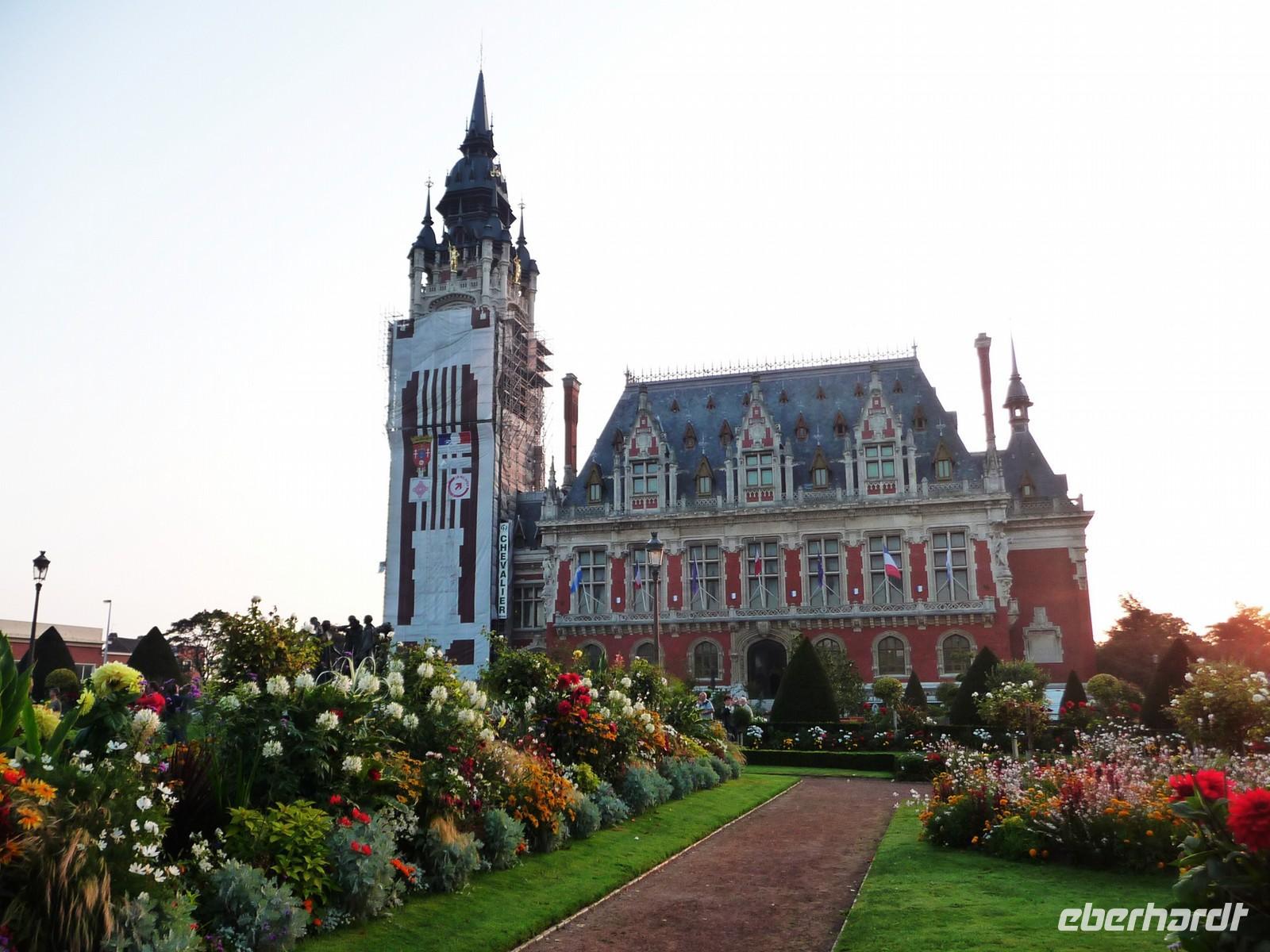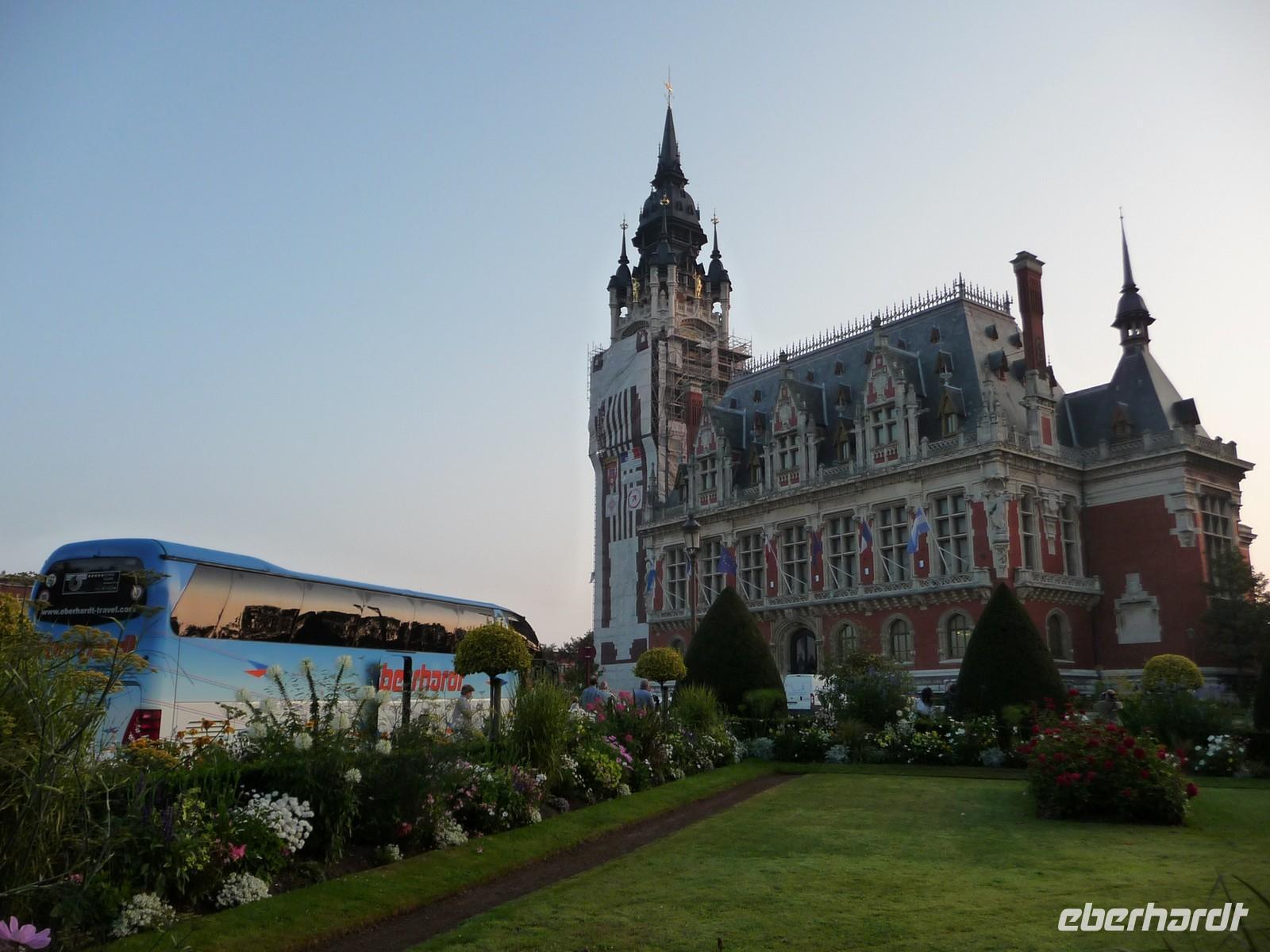 Nach gutem Frühstück und bei sehr schönem Wetter starteten wir 7:30 Uhr zum Fährhafen, fuhren durch die Innenstadt von Calais, vorbei am Theater zum Rathaus, einer ersten schönen Sehenswürdigkeit, die mit den umgebenden Grünanlagen im Blumenschmuck toll wirkte.