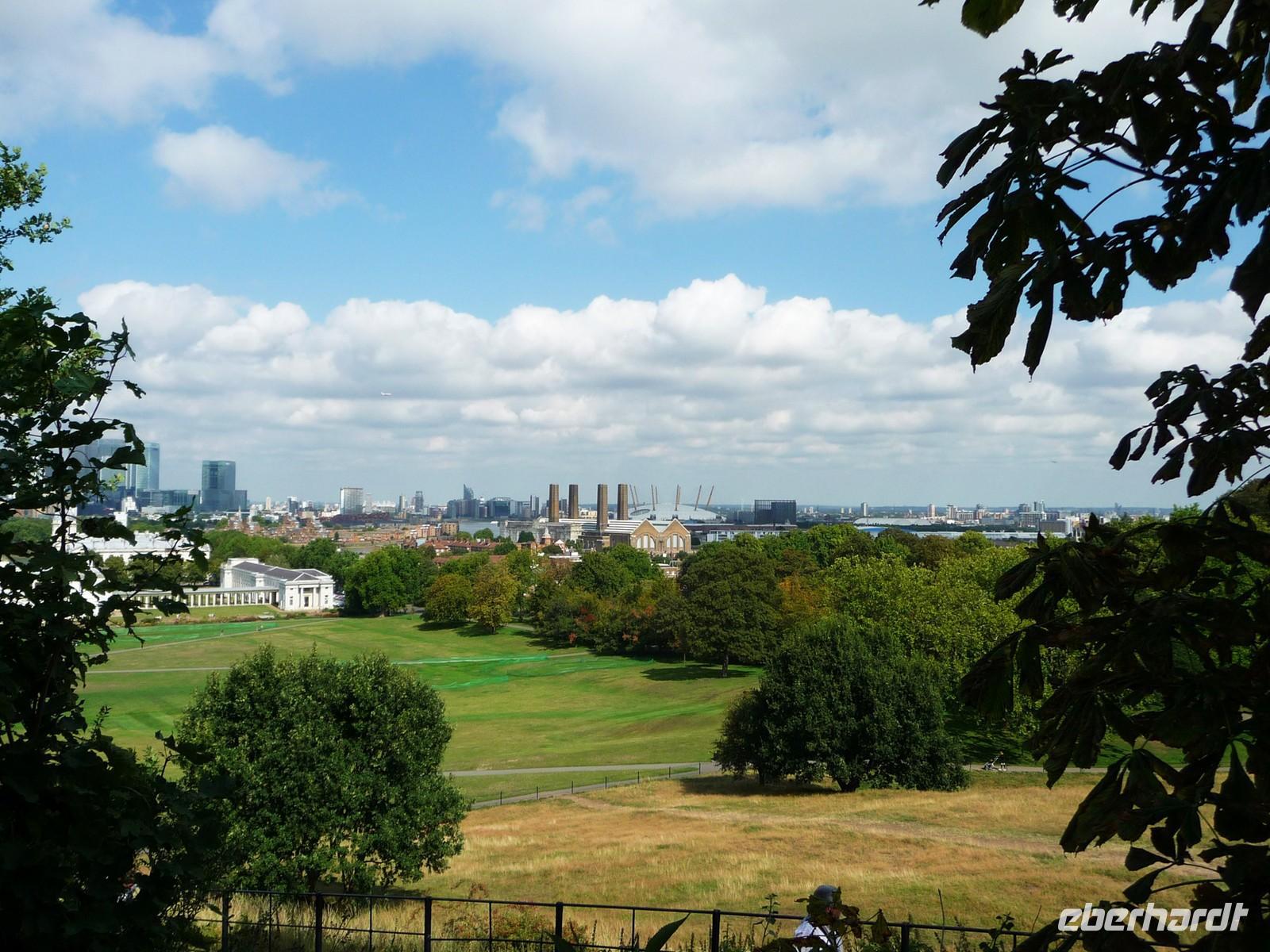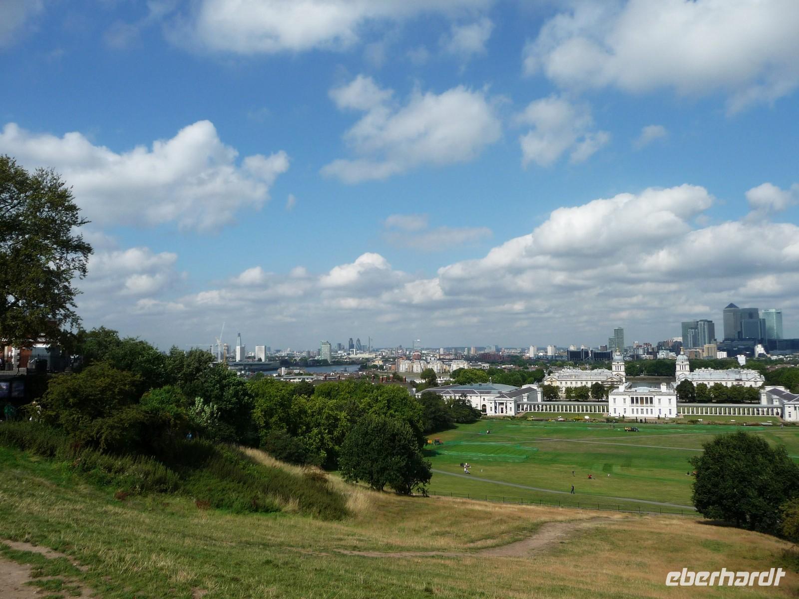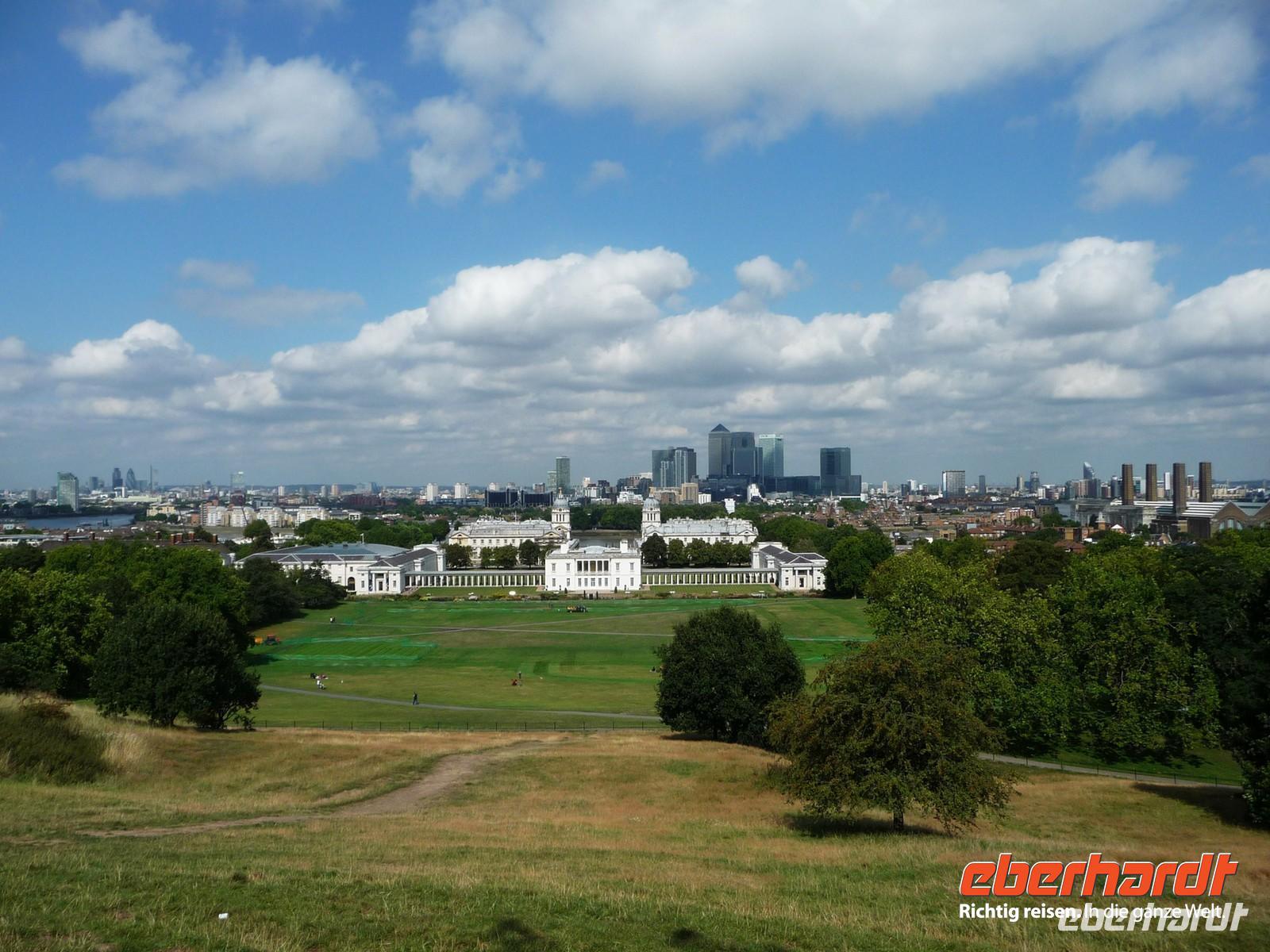 Ruhige See und sehr schönes Wetter auch bei der Ankunft in Dover und so war es auch eine schöne Fahrt vorbei an Canterbury und Leeds Castle nach Greenwich bei London. Gemeinsam spazierten wir durch den Greenwich Park zum Royal Observatory und weiter zum Flamsteed House, wo im Hof mit einer Eisenschiene der Verlauf des Nullmeridian gekennzeichnet ist, in Verlängerung unterhalb, außen, durch kleines Tor verläuft die Markierung weiter - ideal für individuelle Fotos. Vom Aussichtspunkt rechts daneben bot sich ein sehr schöner Blick auf die Londoner City und den Flusslauf der Themse.