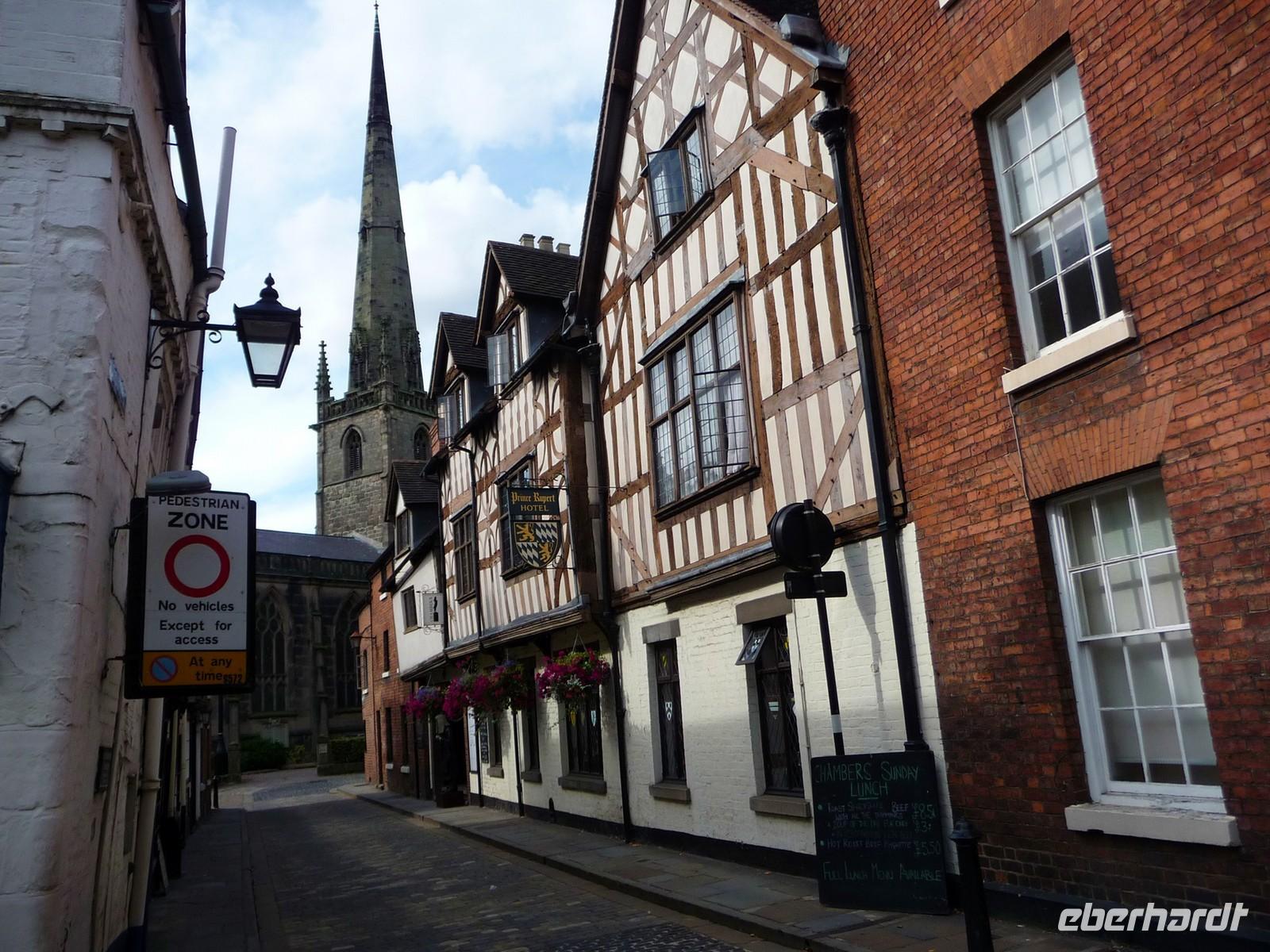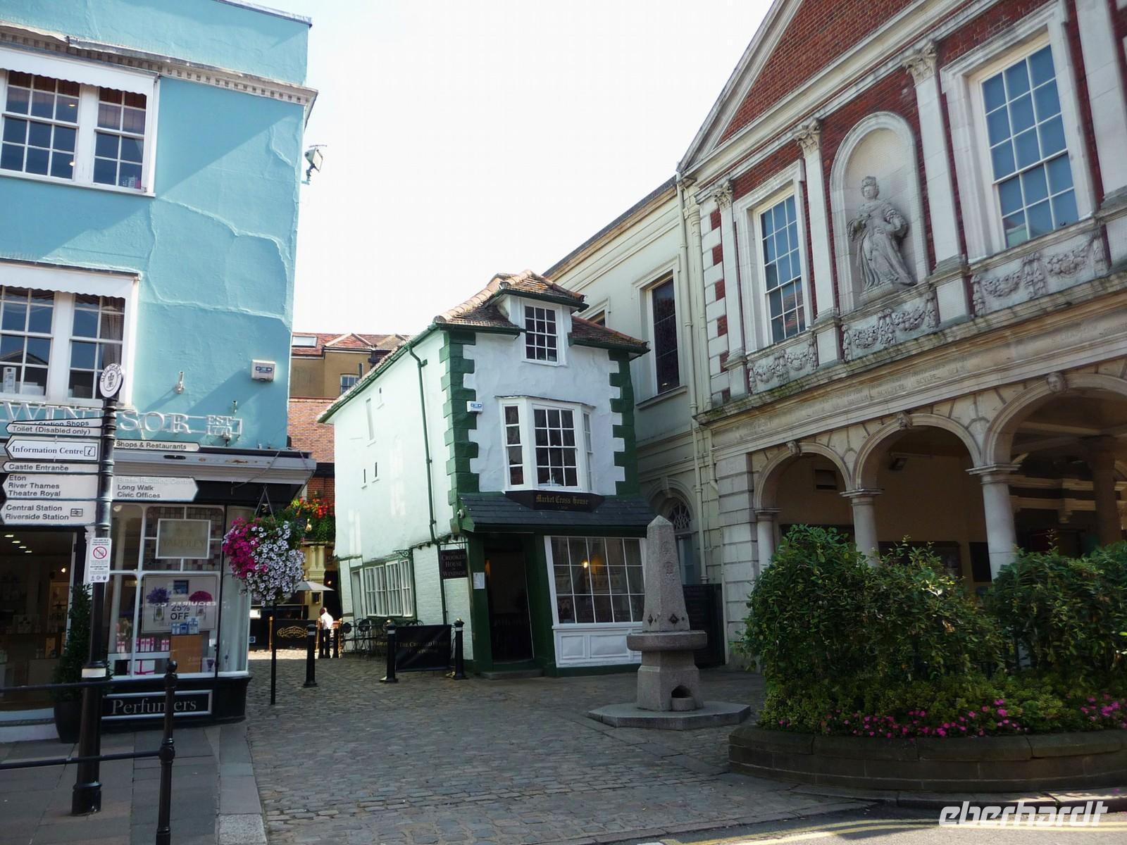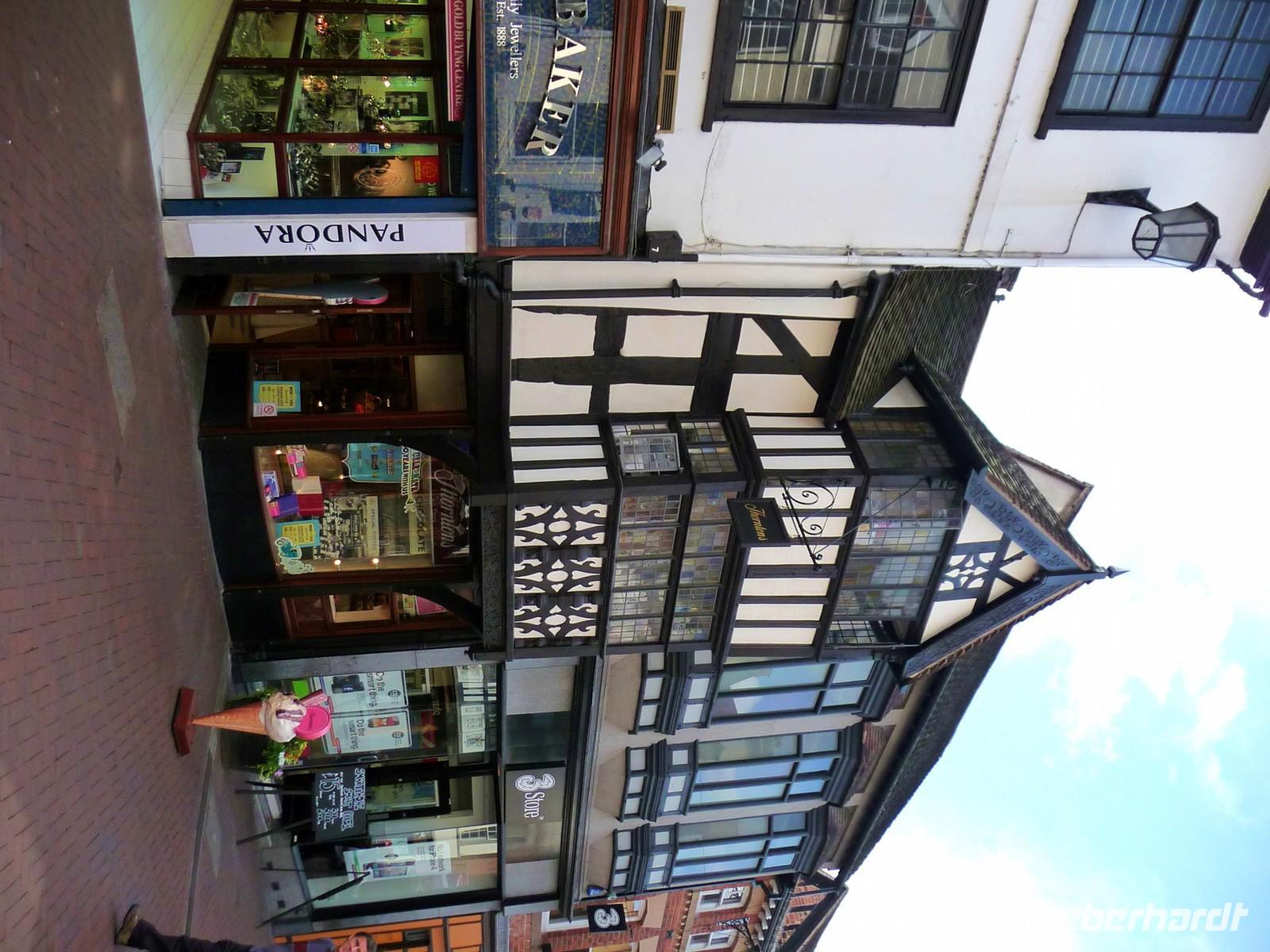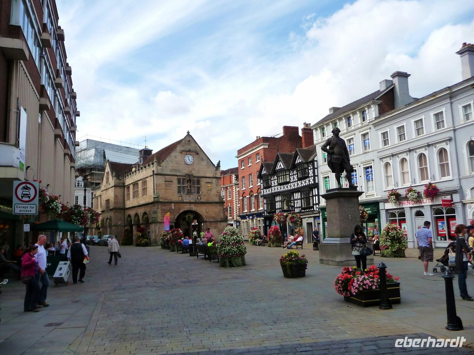 vom Coach-Parkplatz spazieren wir die Treppen zum Bahnhof hinauf, den Bahnsteig entlang bis zur alten Lok und weiter durch Fußgängerzone Richtung Castle. An der Hauptstraße empfängt und das Denkmal von Queen Victoria und unweit davon gelangen wir zum „Schiefen Haus“, dessen Holzkonstruktion im Fundament von vier Ketten zusammengehalten wird, dann zur Guid Hall,