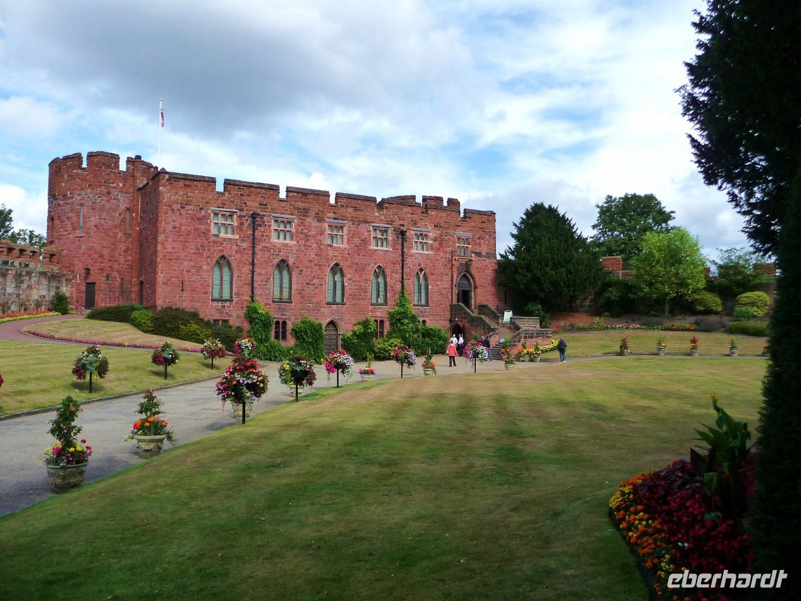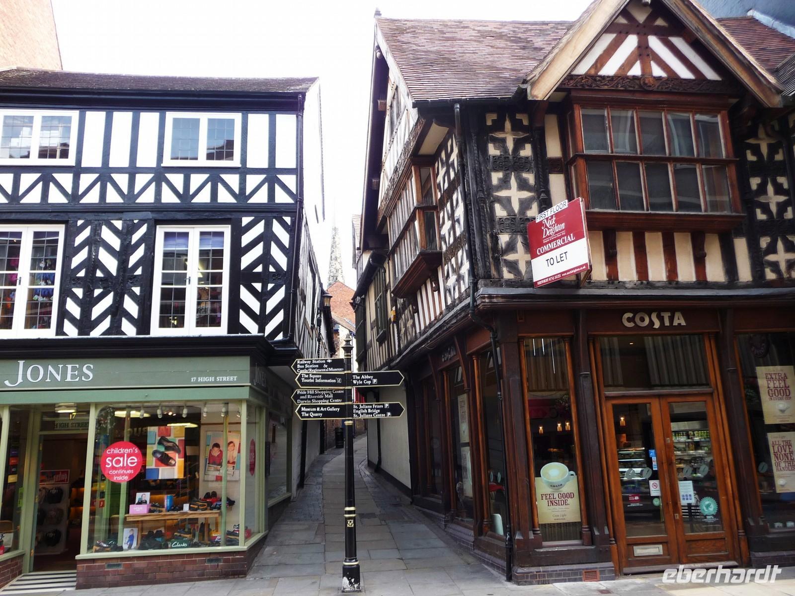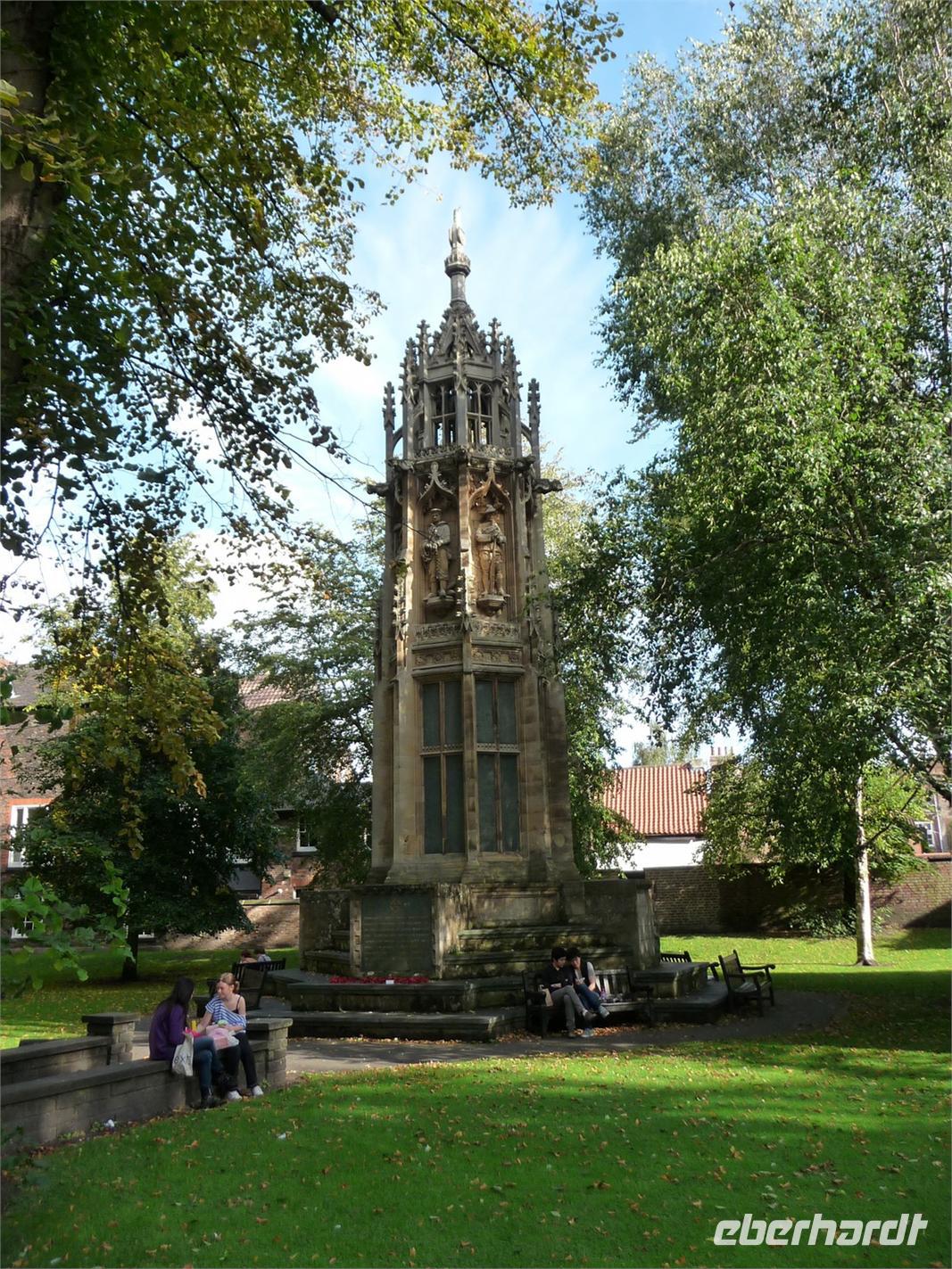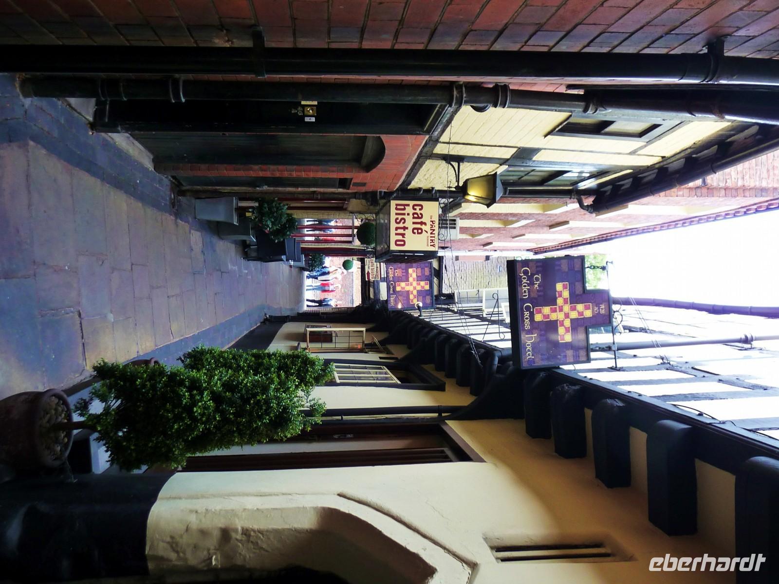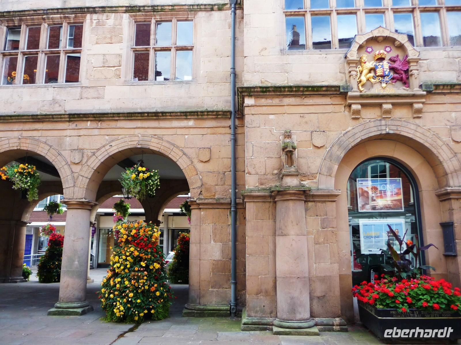 vom Coach-Parkplatz spazieren wir die Treppen zum Bahnhof hinauf, den Bahnsteig entlang bis zur alten Lok und weiter durch Fußgängerzone Richtung Castle. An der Hauptstraße empfängt und das Denkmal von Queen Victoria und unweit davon gelangen wir zum „Schiefen Haus“, dessen Holzkonstruktion im Fundament von vier Ketten zusammengehalten wird, dann zur Guid Hall,
