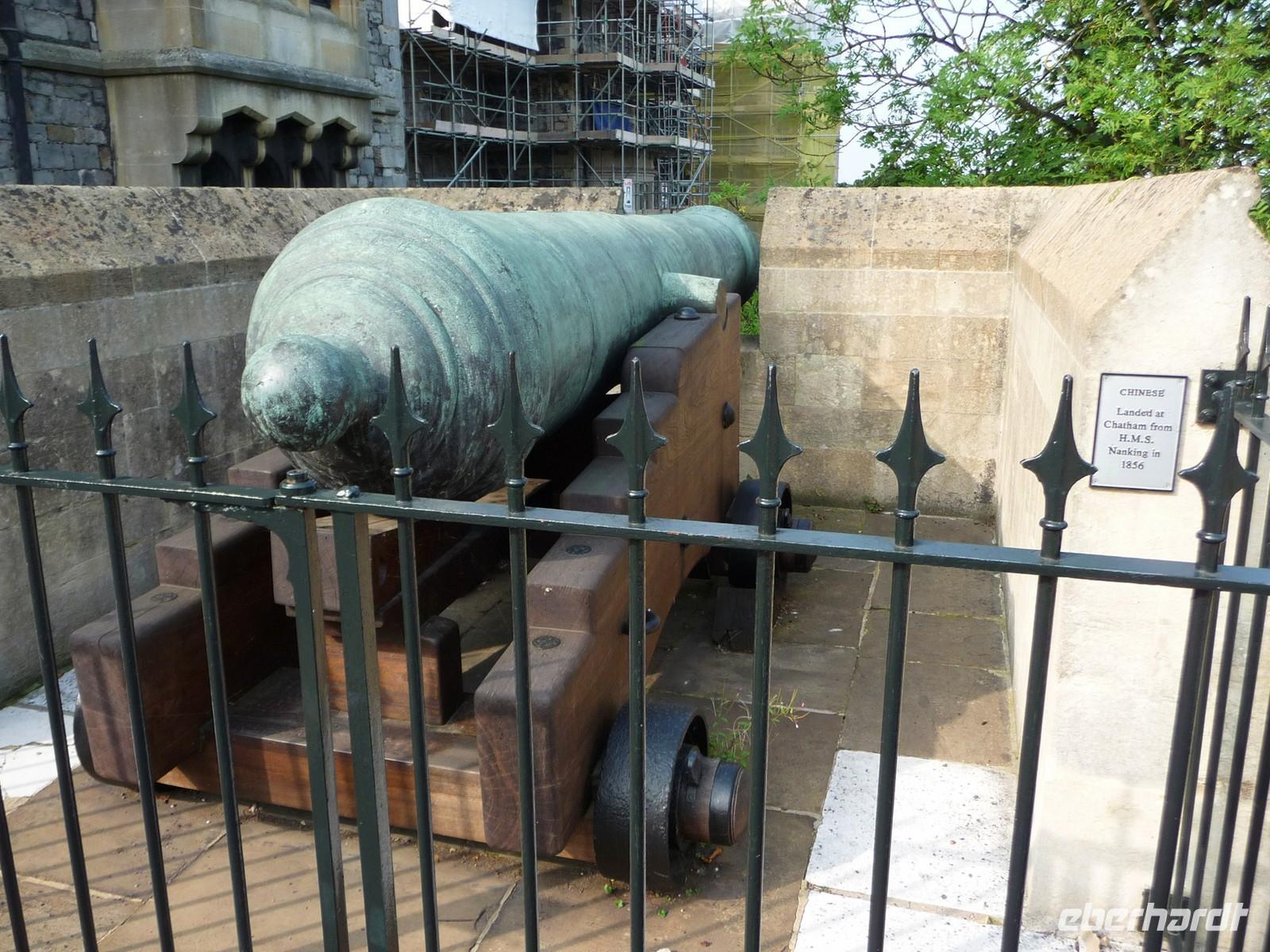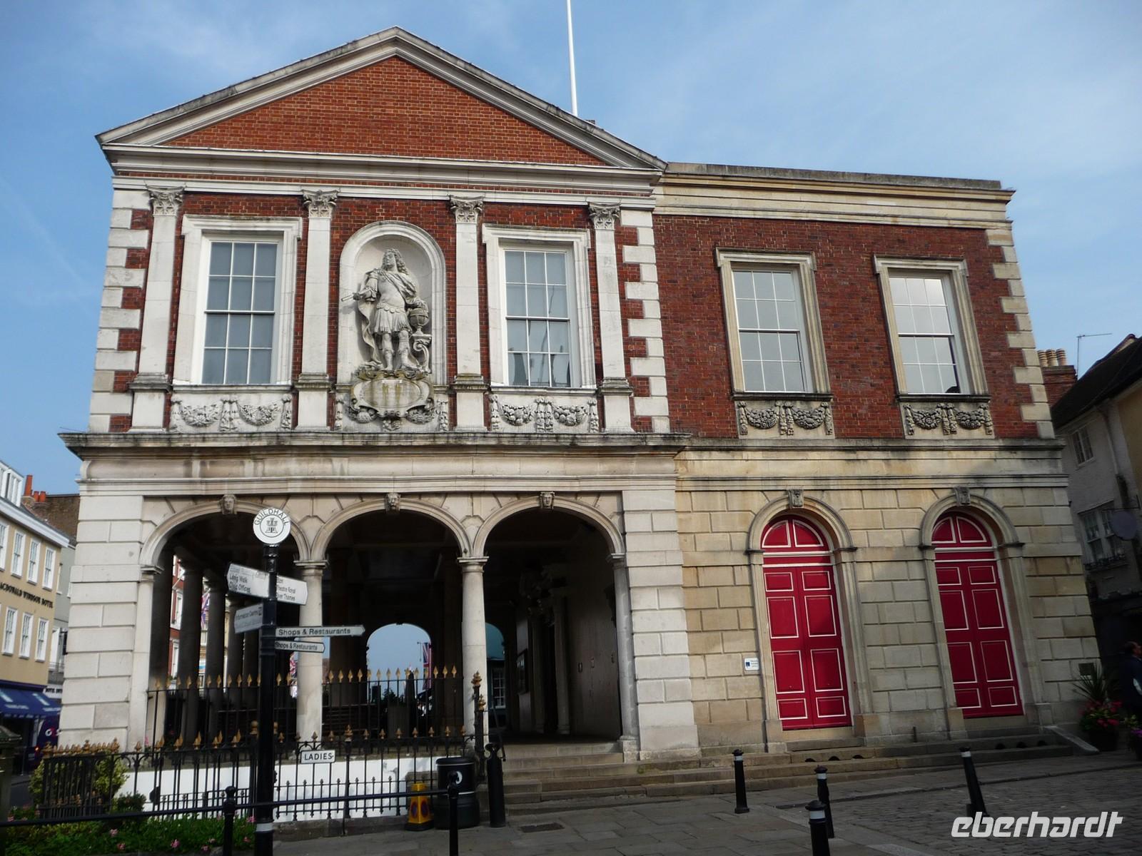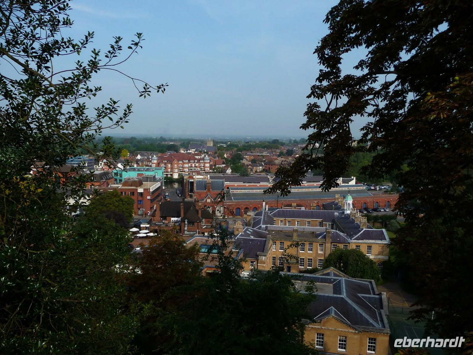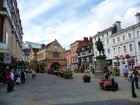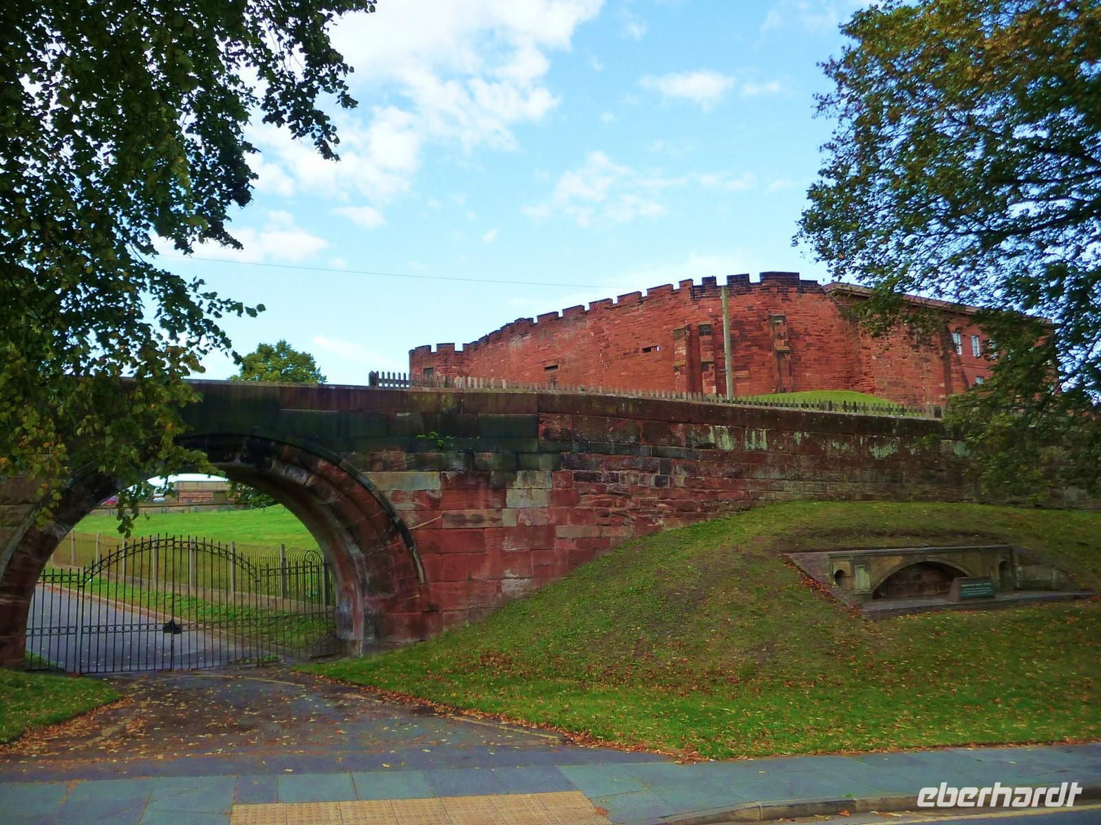 vom Coach-Parkplatz spazieren wir die Treppen zum Bahnhof hinauf, den Bahnsteig entlang bis zur alten Lok und weiter durch Fußgängerzone Richtung Castle. An der Hauptstraße empfängt und das Denkmal von Queen Victoria und unweit davon gelangen wir zum „Schiefen Haus“, dessen Holzkonstruktion im Fundament von vier Ketten zusammengehalten wird, dann zur Guid Hall,