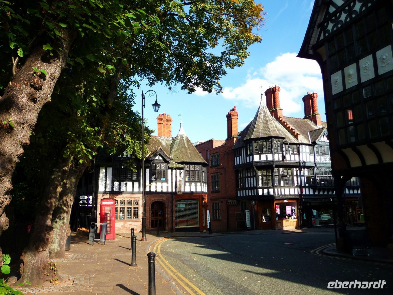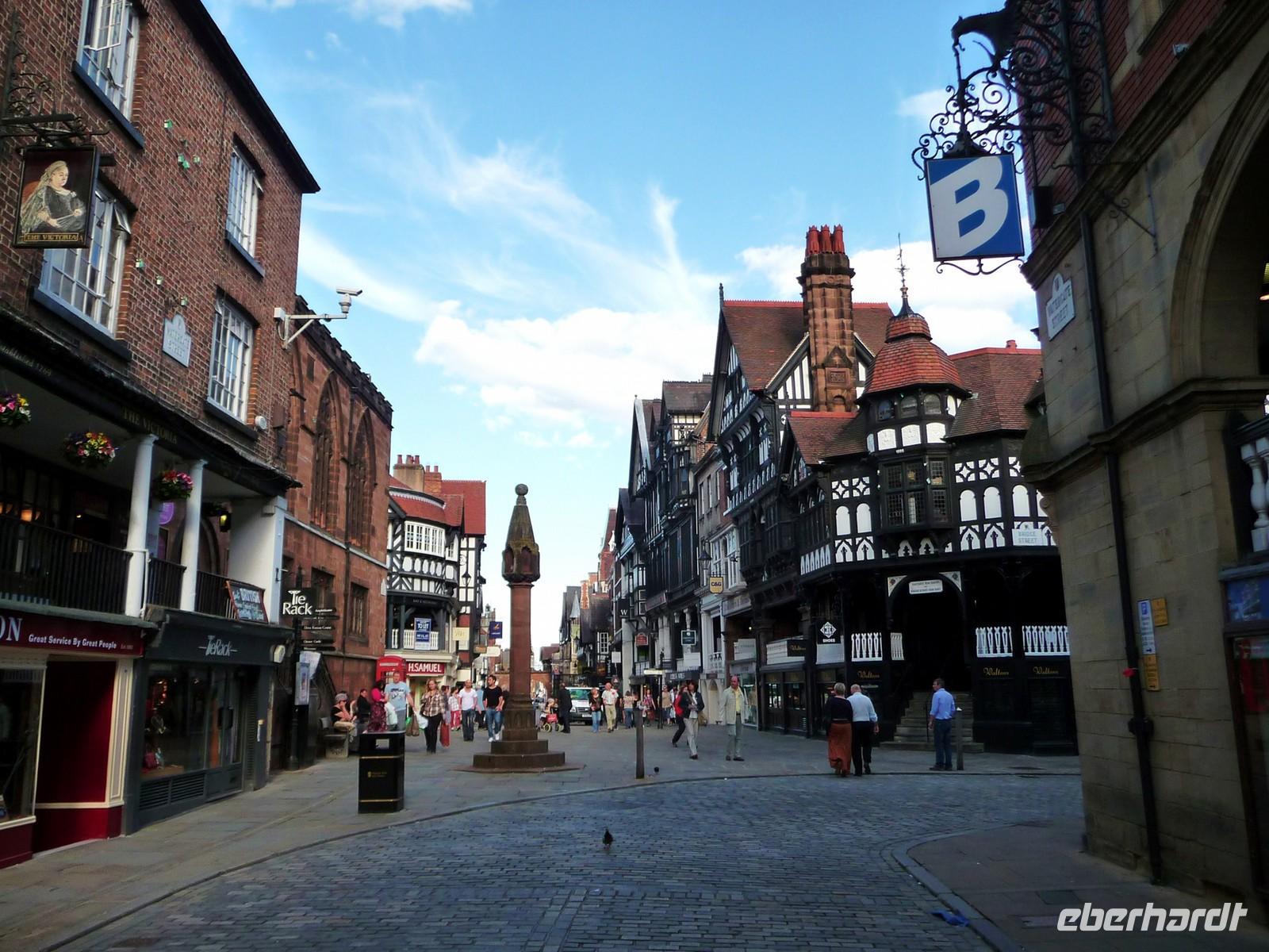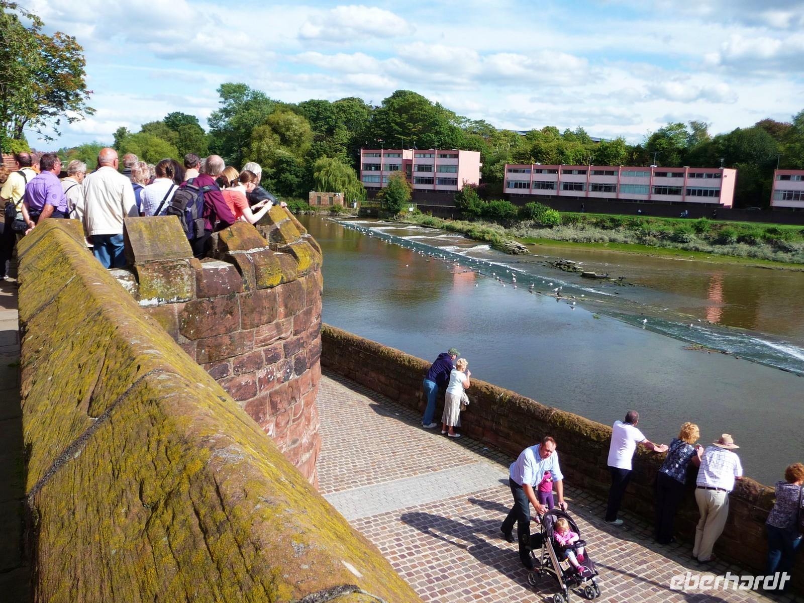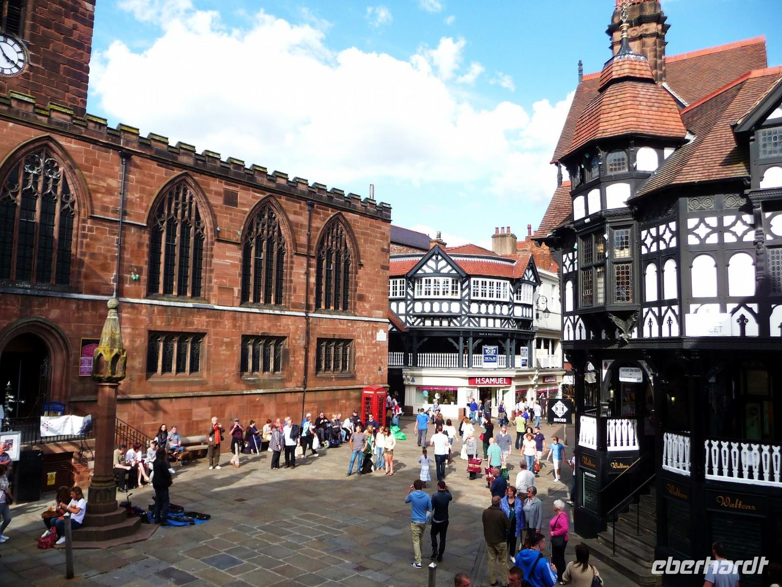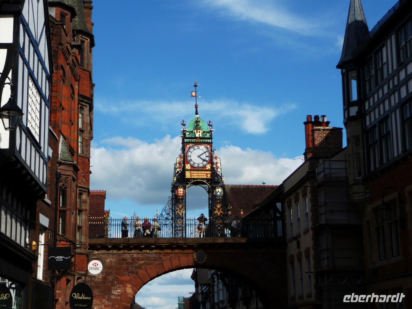 Nach dem Mittag erreichen wir Chester, die historische englische Stadt nahe der Grenze zu Wales. Am Little Rodee Coach Park unterhalb der Burganlage erwarten uns die beiden Stadtführer schon - Janett und Peter - beide begeistern ihre Gruppen auf dem anschließenden Stadtrundgang. Das wunderschöne Wetter tut sein übriges. Das alte Wehr und die alte Brücke zur Stadt, historische Häuser wie die 7 Gleichen, die römischen Befestigungsanlagen, das Amphitheater, die Cathedral, die Rows sind einfach beeindruckend. Am Rathaus, mit den Uhren nach allen Richtungen, außer nach Westen, damit die Waliser die Zeit nicht sehen können, endet die Stadtführung.