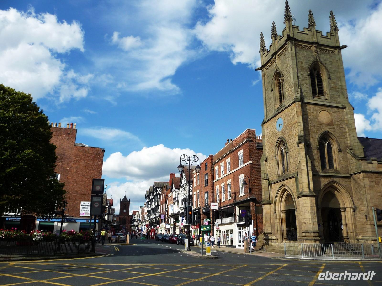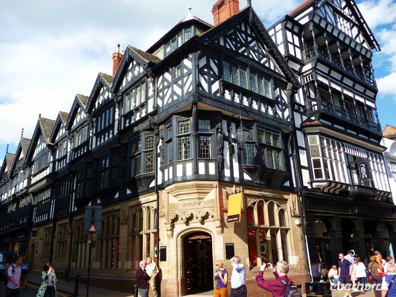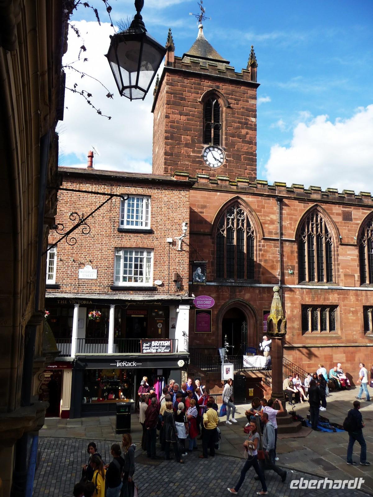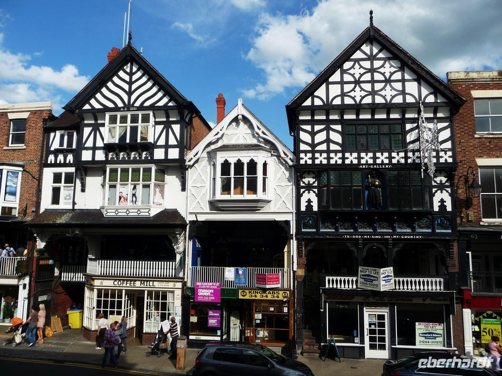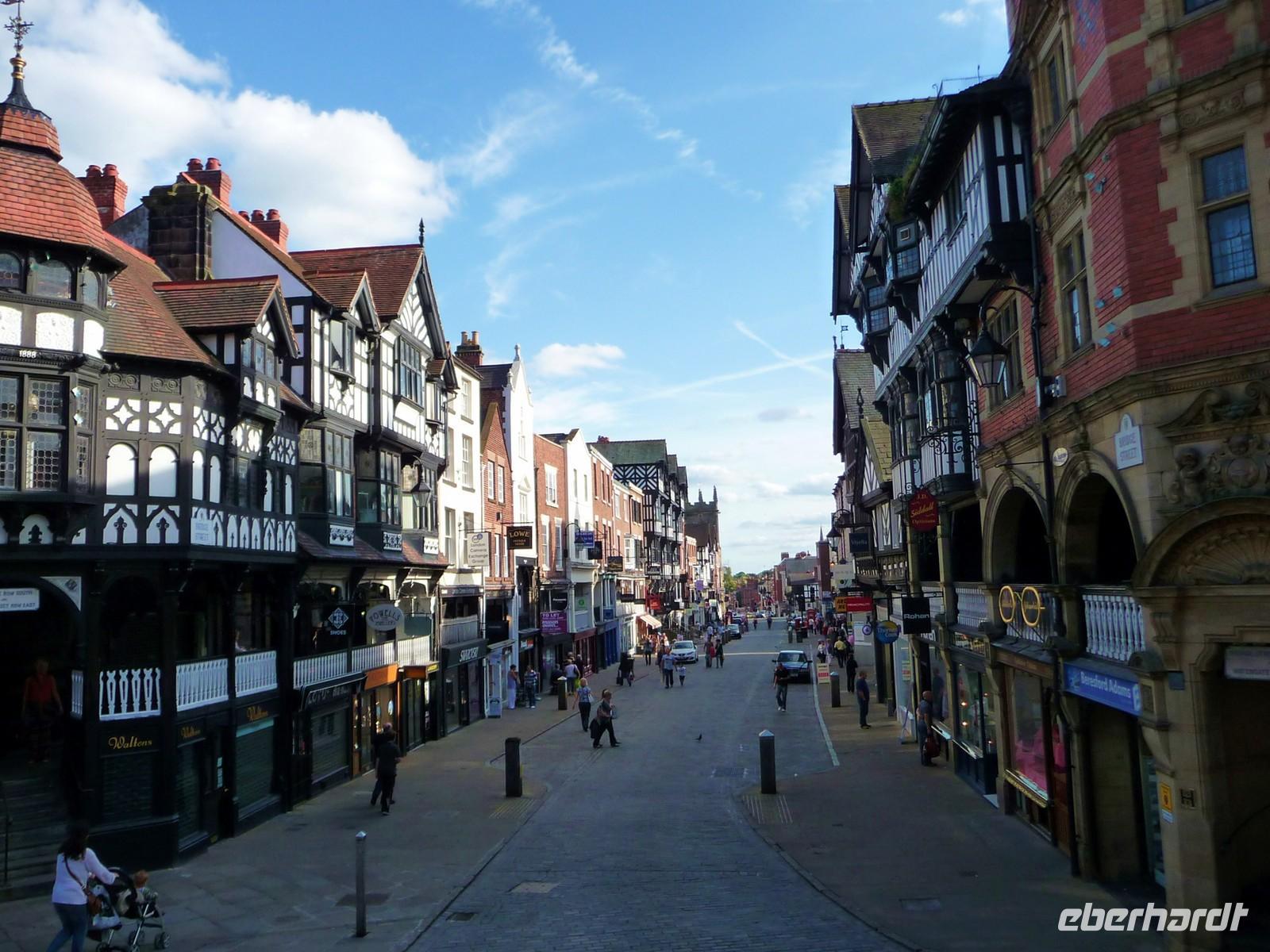 Nach dem Mittag erreichen wir Chester, die historische englische Stadt nahe der Grenze zu Wales. Am Little Rodee Coach Park unterhalb der Burganlage erwarten uns die beiden Stadtführer schon - Janett und Peter - beide begeistern ihre Gruppen auf dem anschließenden Stadtrundgang. Das wunderschöne Wetter tut sein übriges. Das alte Wehr und die alte Brücke zur Stadt, historische Häuser wie die 7 Gleichen, die römischen Befestigungsanlagen, das Amphitheater, die Cathedral, die Rows sind einfach beeindruckend. Am Rathaus, mit den Uhren nach allen Richtungen, außer nach Westen, damit die Waliser die Zeit nicht sehen können, endet die Stadtführung.
