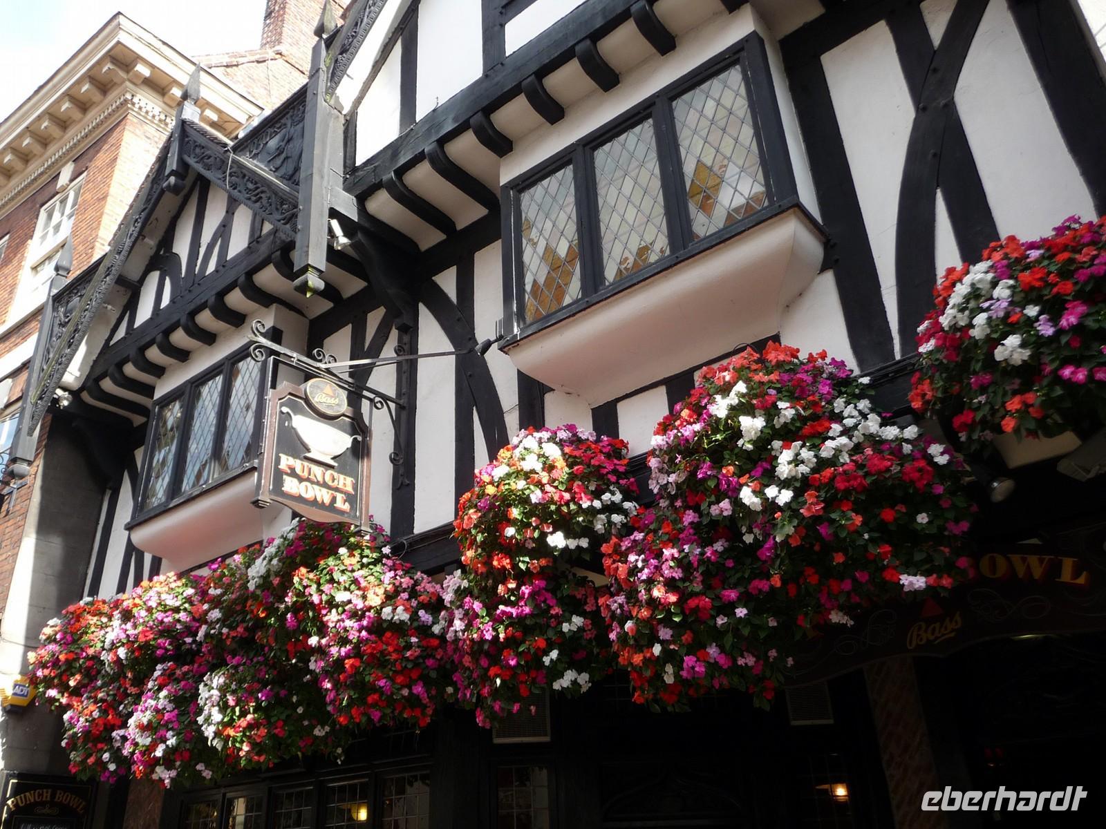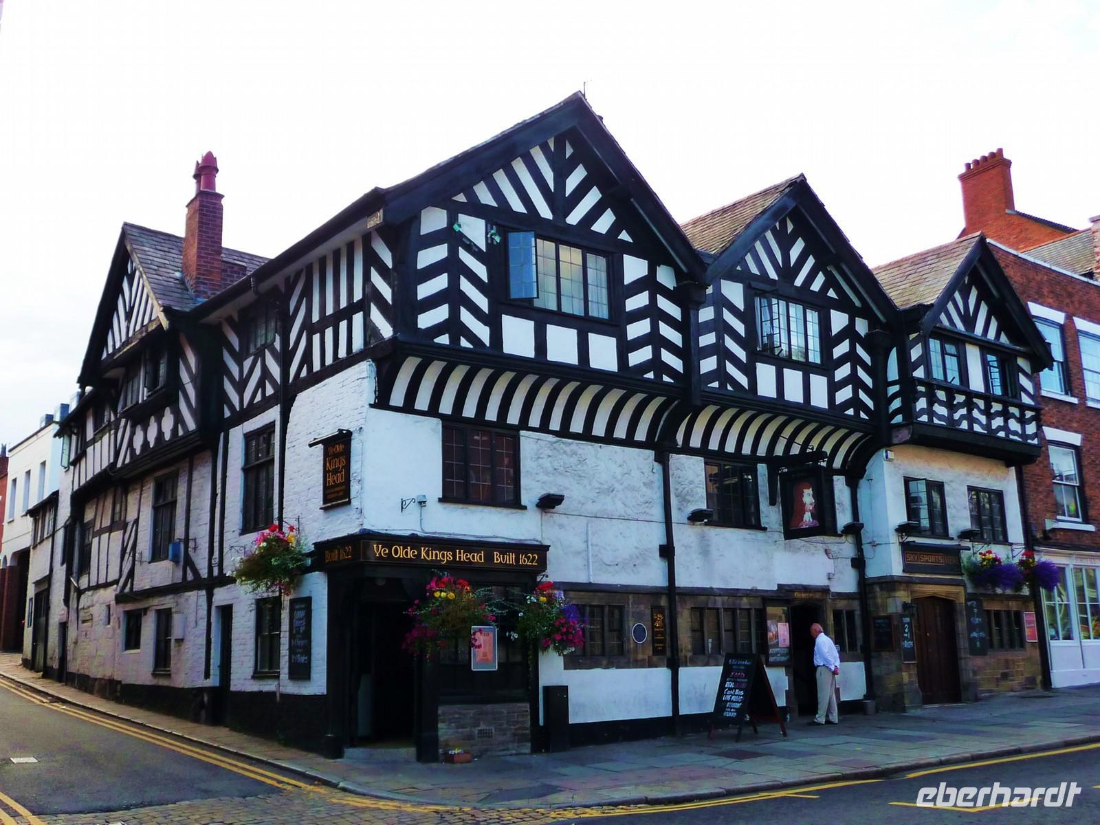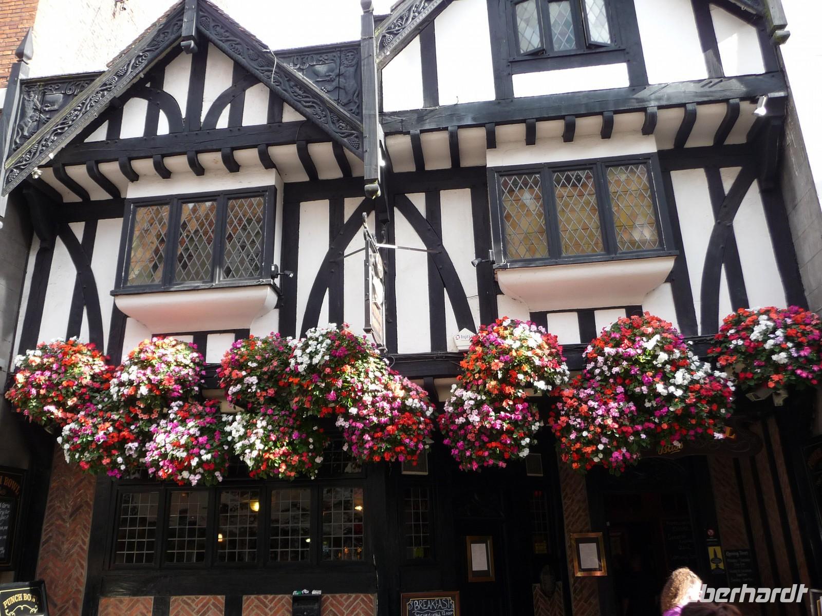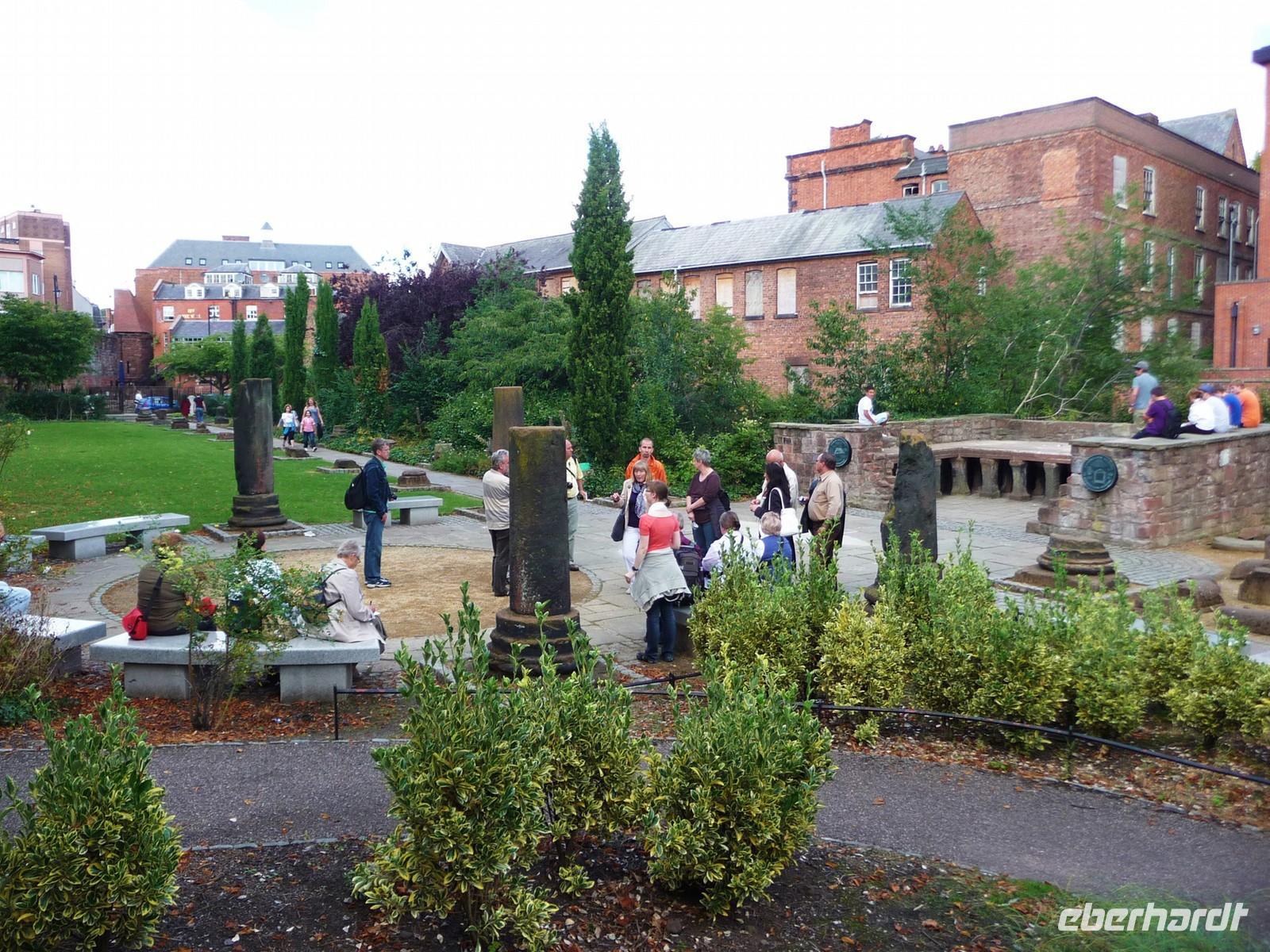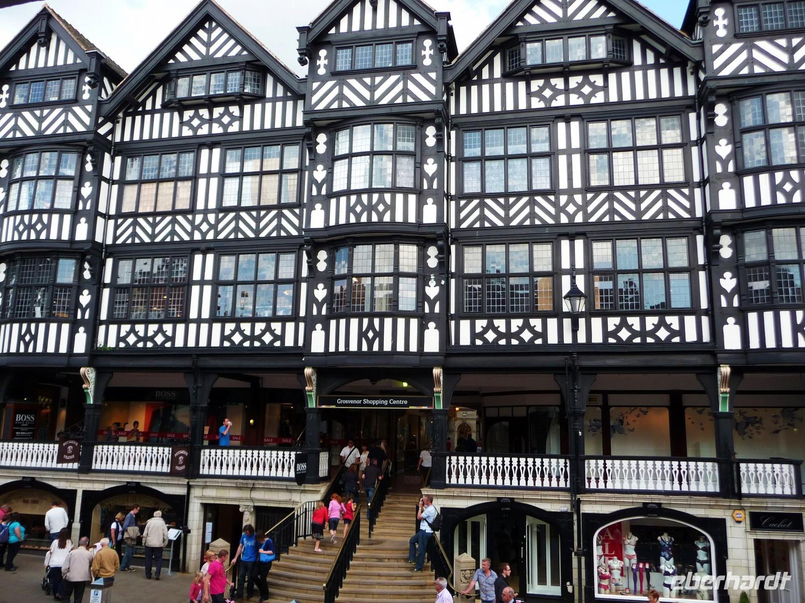 Nach dem Mittag erreichen wir Chester, die historische englische Stadt nahe der Grenze zu Wales. Am Little Rodee Coach Park unterhalb der Burganlage erwarten uns die beiden Stadtführer schon - Janett und Peter - beide begeistern ihre Gruppen auf dem anschließenden Stadtrundgang. Das wunderschöne Wetter tut sein übriges. Das alte Wehr und die alte Brücke zur Stadt, historische Häuser wie die 7 Gleichen, die römischen Befestigungsanlagen, das Amphitheater, die Cathedral, die Rows sind einfach beeindruckend. Am Rathaus, mit den Uhren nach allen Richtungen, außer nach Westen, damit die Waliser die Zeit nicht sehen können, endet die Stadtführung.