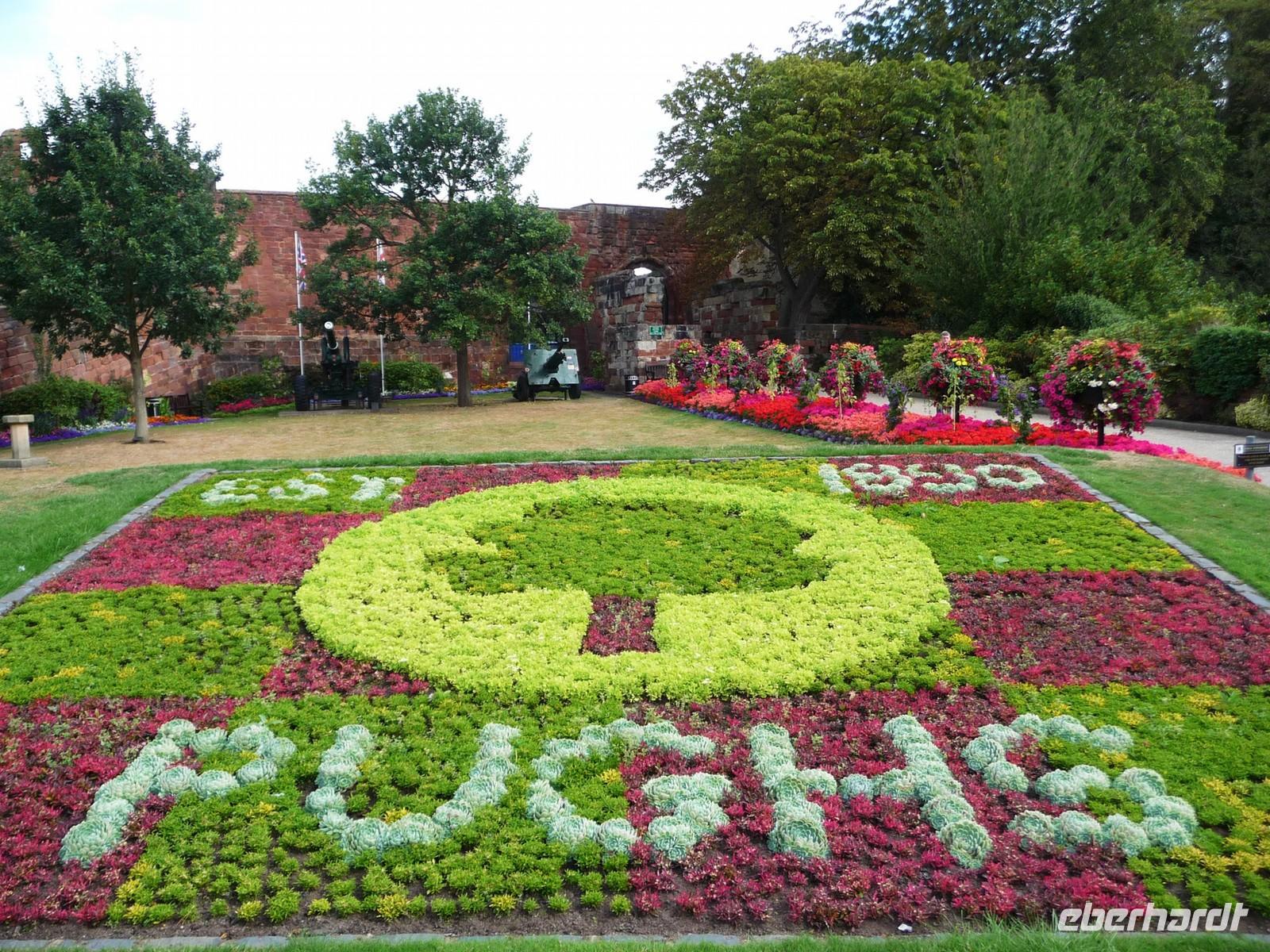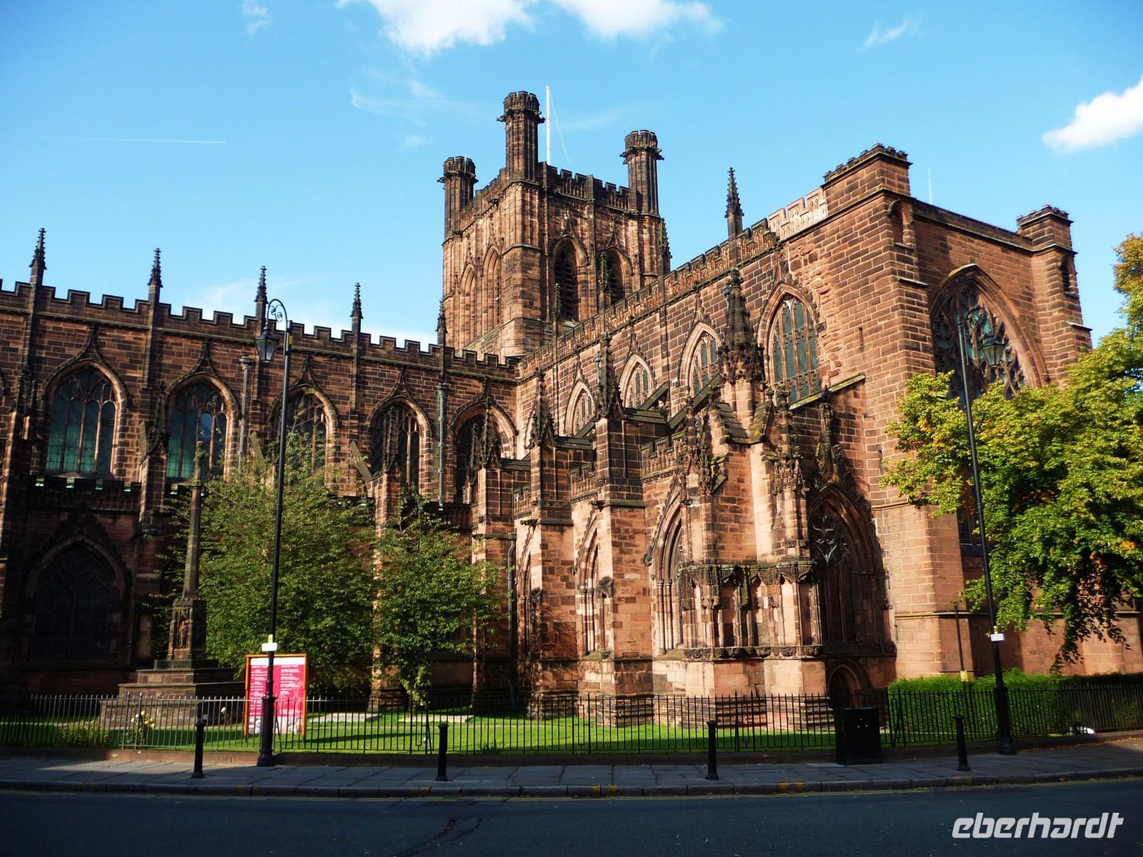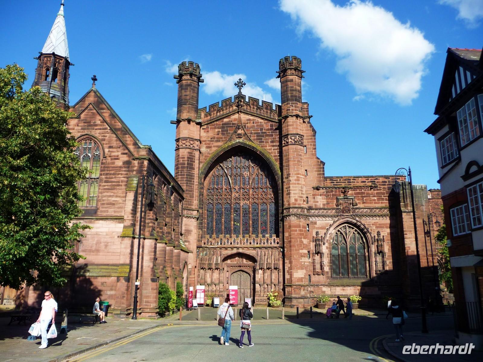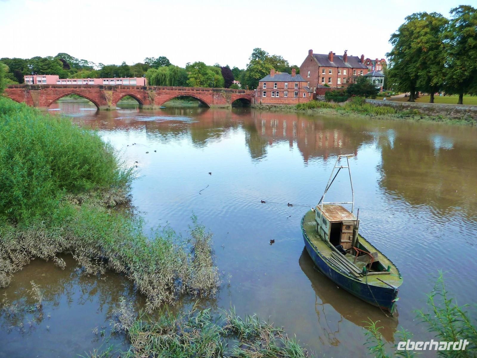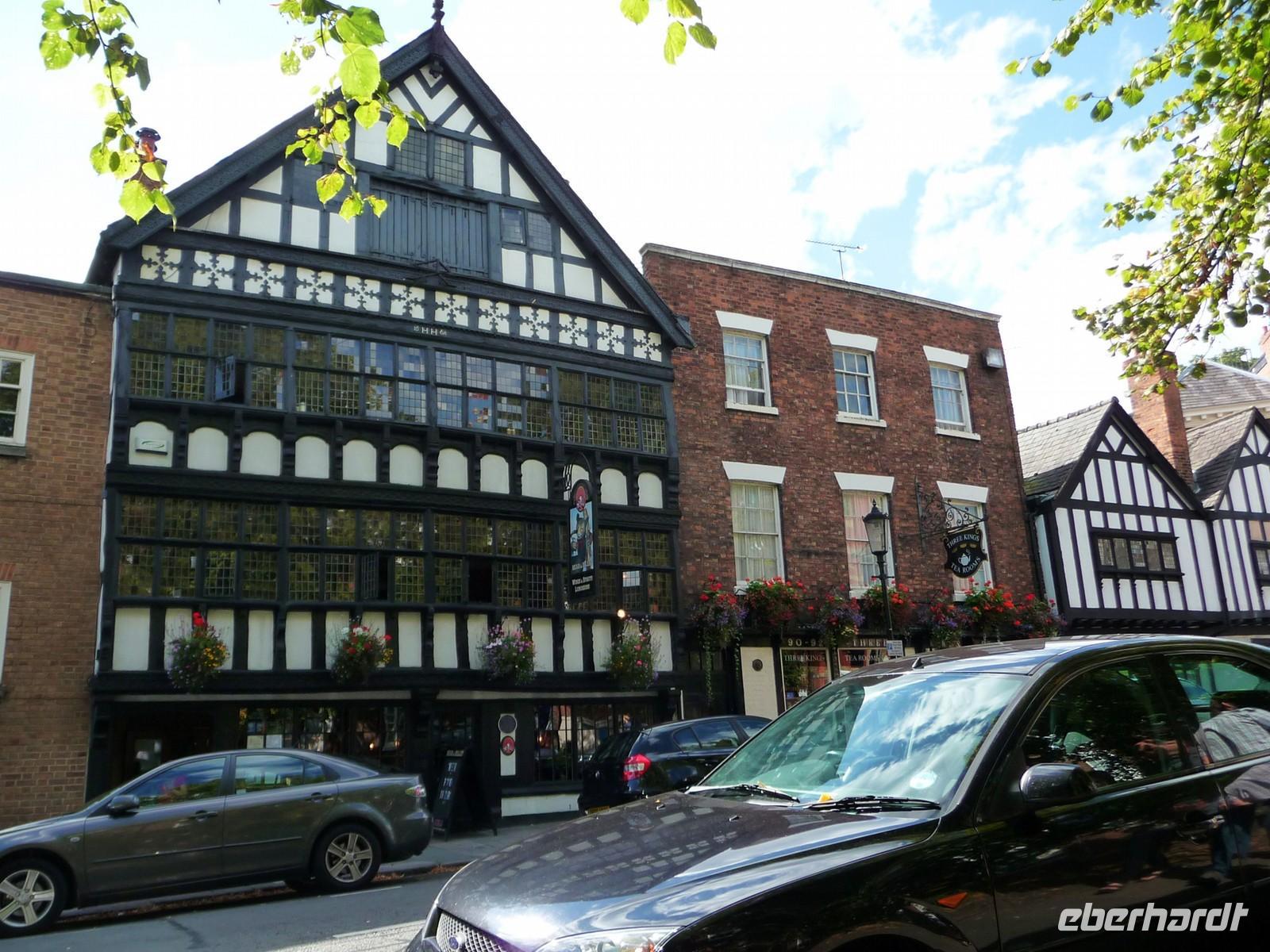 Nach dem Mittag erreichen wir Chester, die historische englische Stadt nahe der Grenze zu Wales. Am Little Rodee Coach Park unterhalb der Burganlage erwarten uns die beiden Stadtführer schon - Janett und Peter - beide begeistern ihre Gruppen auf dem anschließenden Stadtrundgang. Das wunderschöne Wetter tut sein übriges. Das alte Wehr und die alte Brücke zur Stadt, historische Häuser wie die 7 Gleichen, die römischen Befestigungsanlagen, das Amphitheater, die Cathedral, die Rows sind einfach beeindruckend. Am Rathaus, mit den Uhren nach allen Richtungen, außer nach Westen, damit die Waliser die Zeit nicht sehen können, endet die Stadtführung.