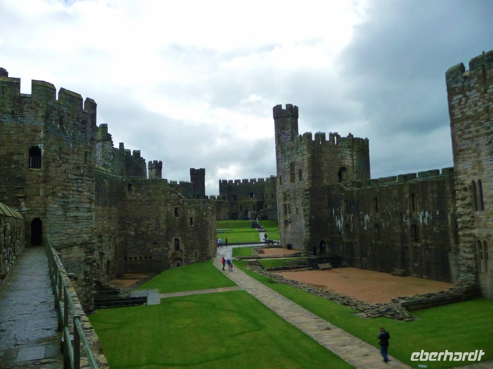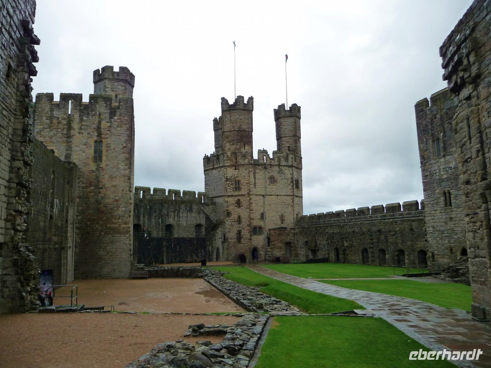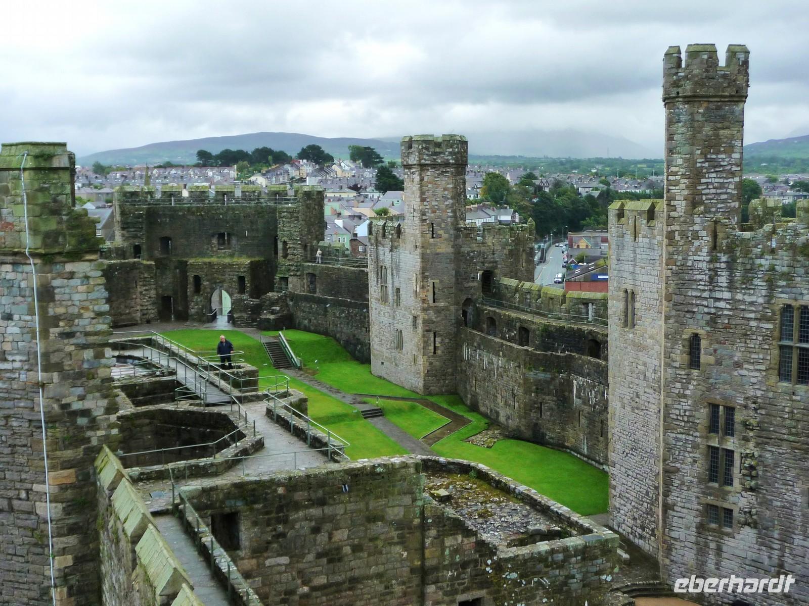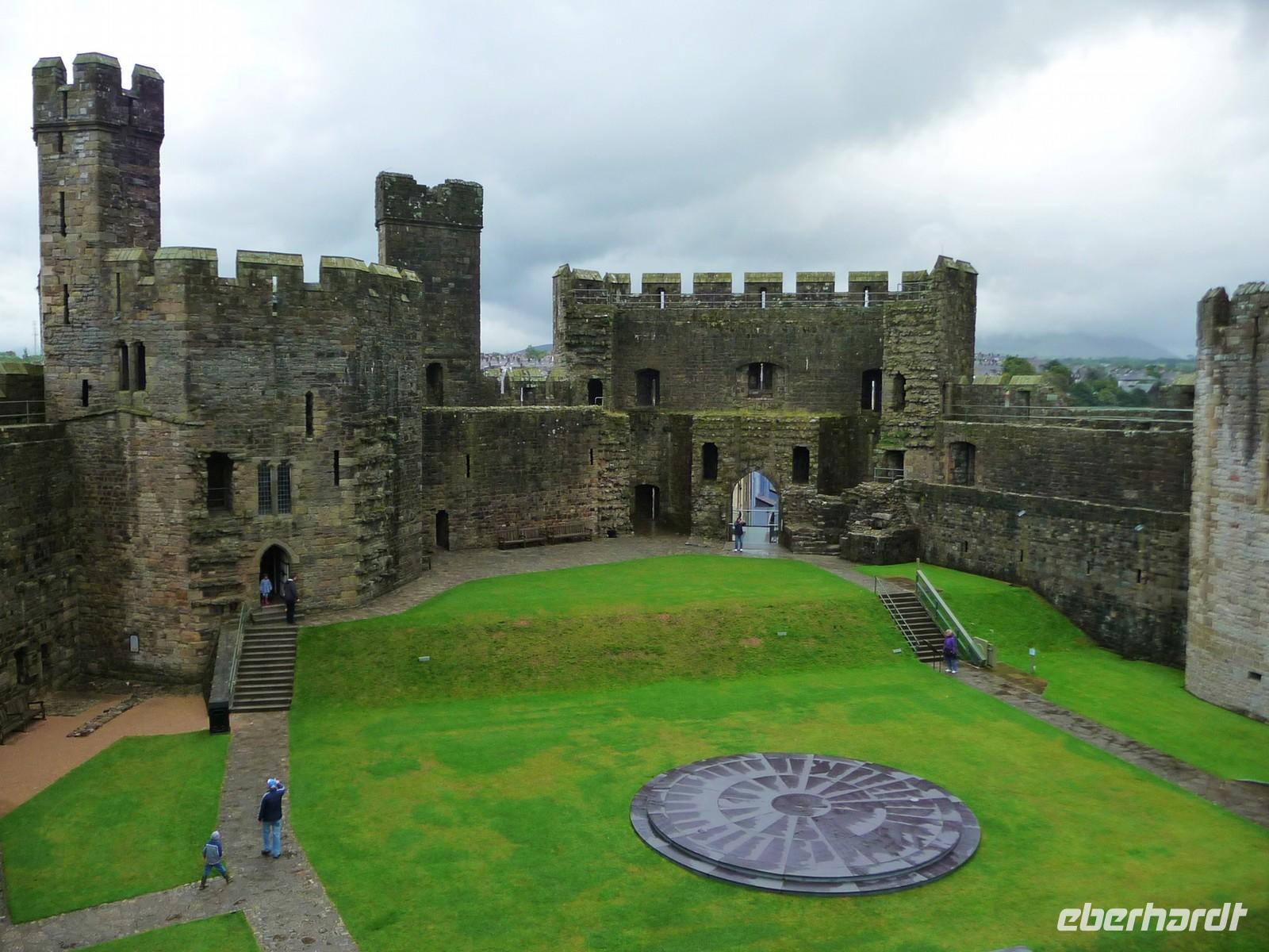Ausgerechnet heute Regen, mit nur kurzen Unterbrechungen. Wir fahren hinein nach Wales, entlang der Küstenstraße geht es bis Caernarfon. Hier laufen wir, leider bei strömendem Regen, die wenigen Schritte vorbei an der alten Markthalle hin zum Castle. Wir gehen hinein, besichtigen zuerst die zahlreichen Ausstellungen im Innern der Türme, sehen die schwarzen, rund angeordneten Steinplatten in der Mitte des Rasens im Schlosshof, die Bühne für die Krönung von Charles zum Prince of Wales im Jahre 1969 waren. Endlich hat der Regen aufgehört und wir können die Mauern, Wehrgänge und Türme erklimmen.