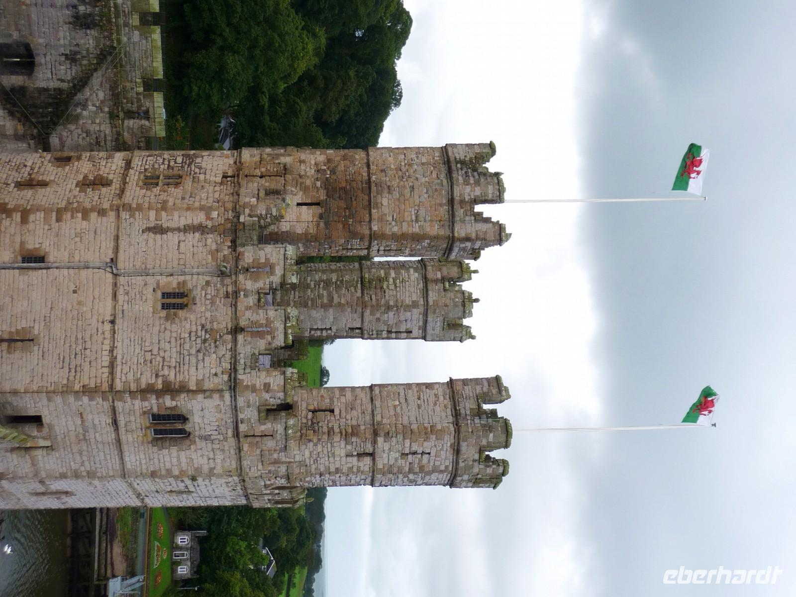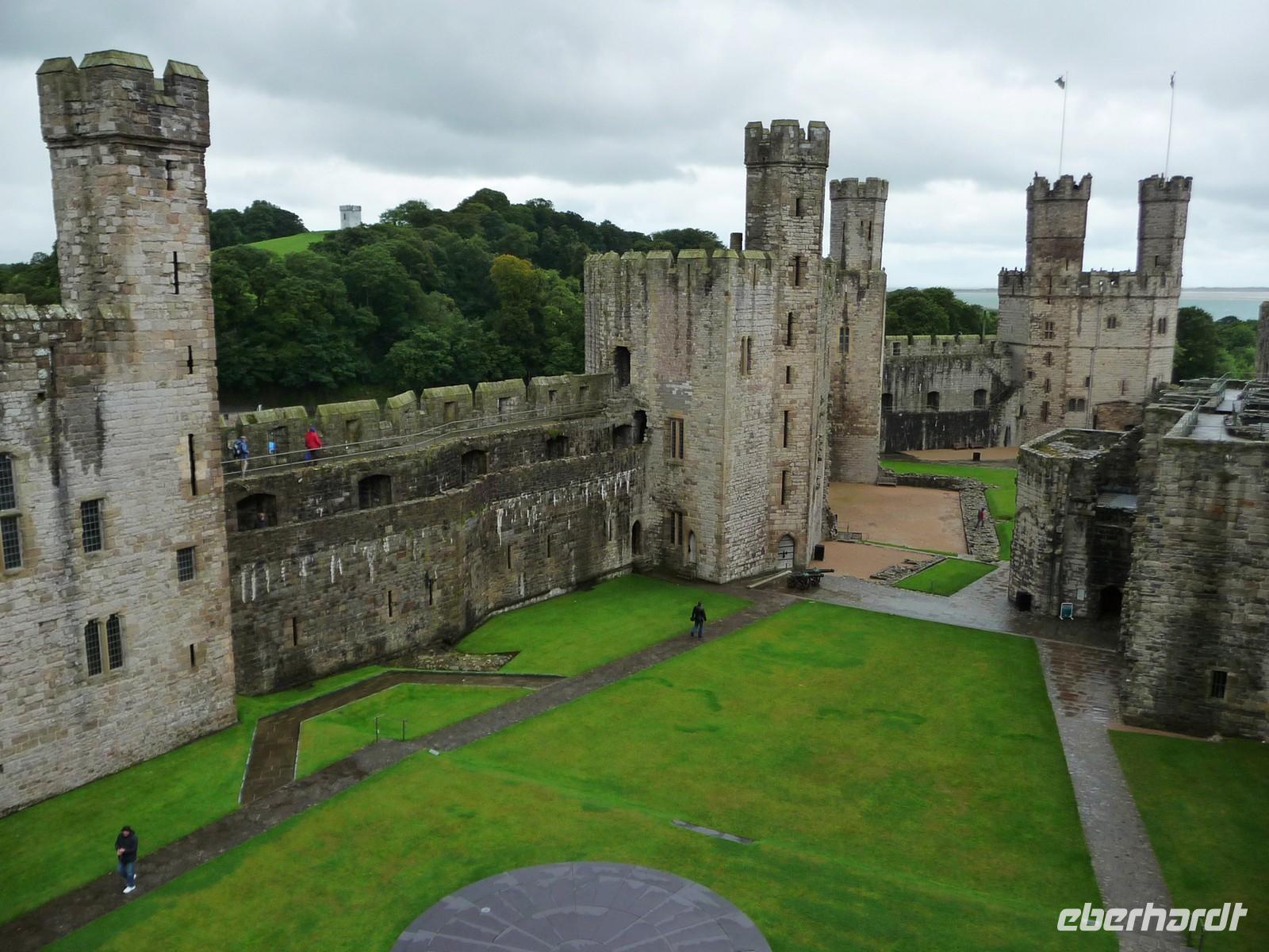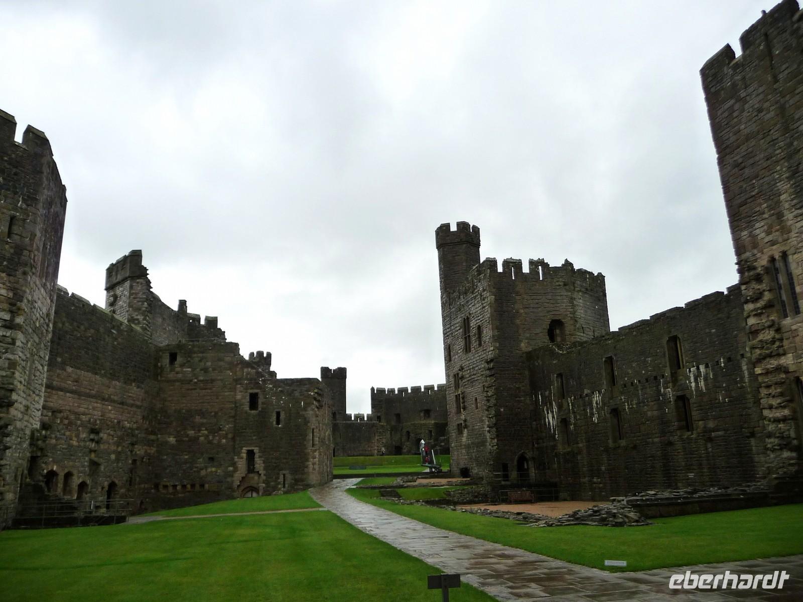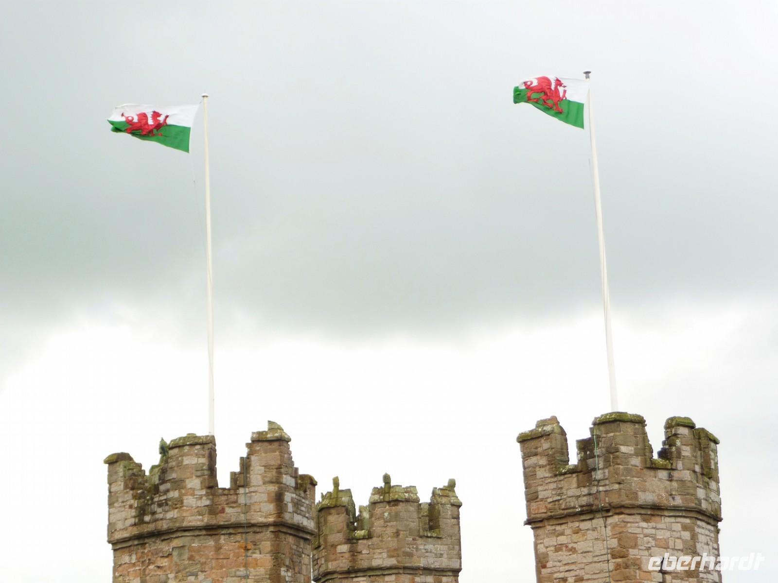 Ausgerechnet heute Regen, mit nur kurzen Unterbrechungen. Wir fahren hinein nach Wales, entlang der Küstenstraße geht es bis Caernarfon. Hier laufen wir, leider bei strömendem Regen, die wenigen Schritte vorbei an der alten Markthalle hin zum Castle. Wir gehen hinein, besichtigen zuerst die zahlreichen Ausstellungen im Innern der Türme, sehen die schwarzen, rund angeordneten Steinplatten in der Mitte des Rasens im Schlosshof, die Bühne für die Krönung von Charles zum Prince of Wales im Jahre 1969 waren. Endlich hat der Regen aufgehört und wir können die Mauern, Wehrgänge und Türme erklimmen.
