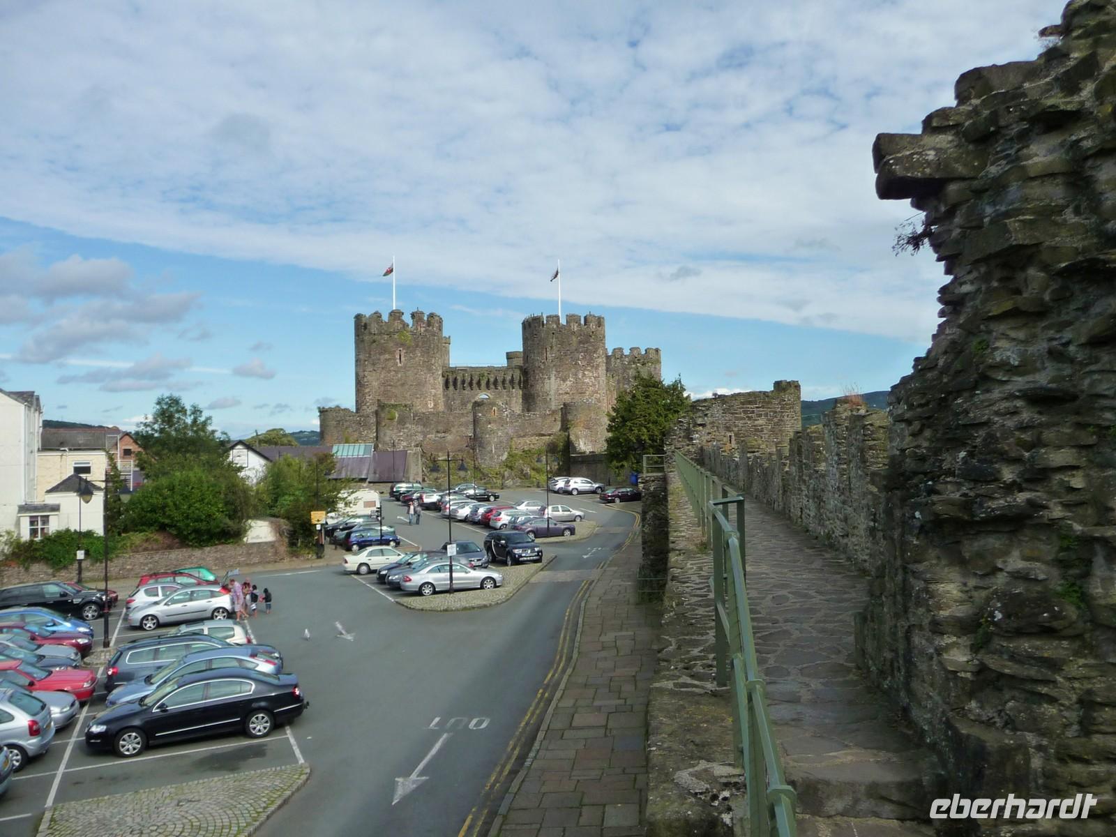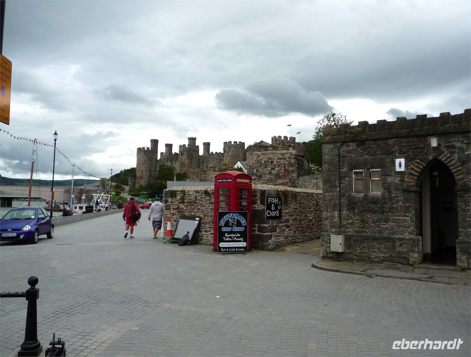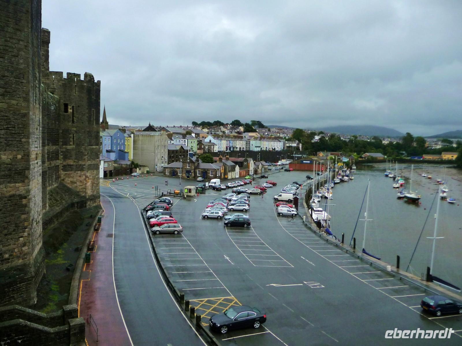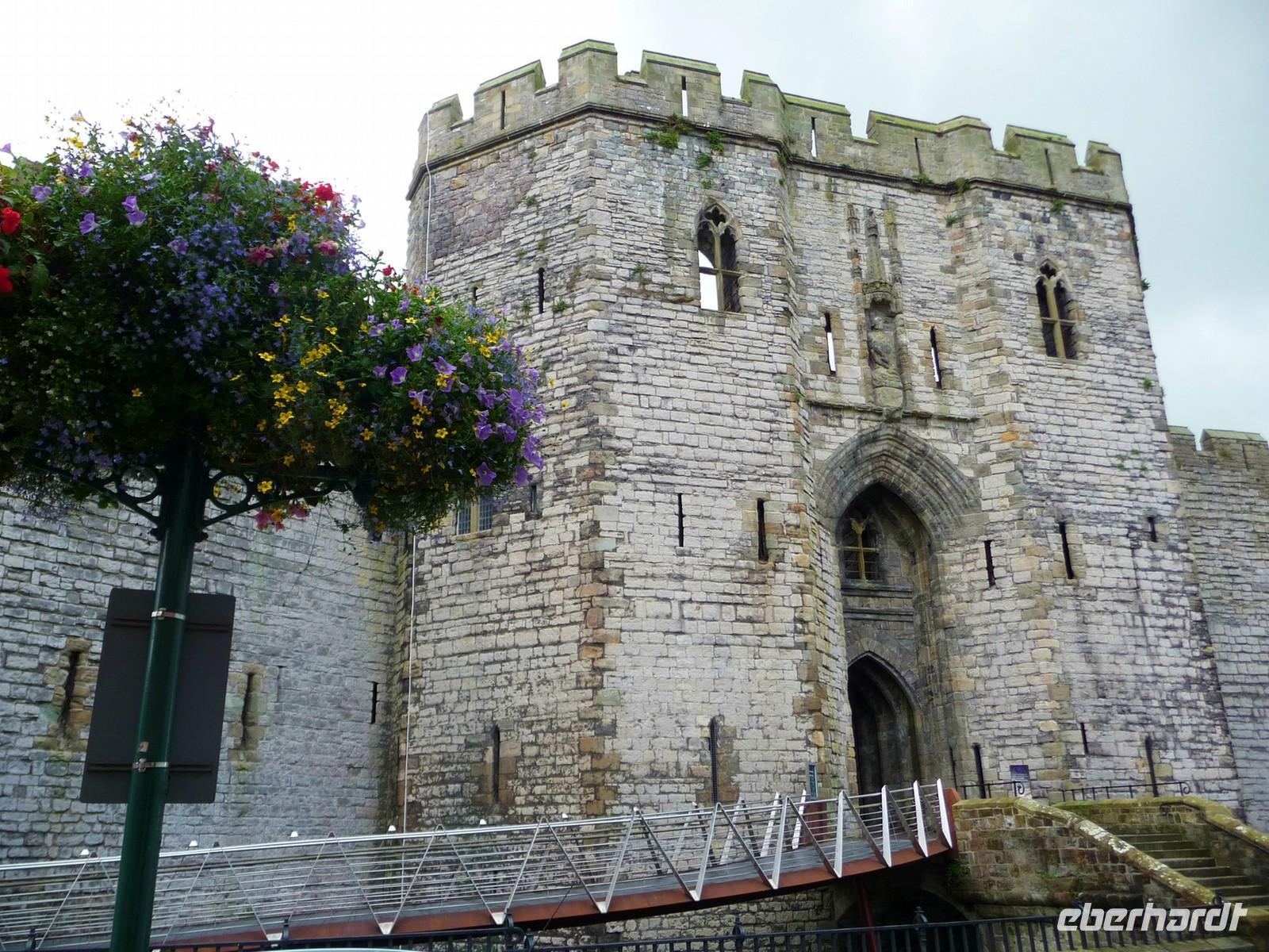 Ausgerechnet heute Regen, mit nur kurzen Unterbrechungen. Wir fahren hinein nach Wales, entlang der Küstenstraße geht es bis Caernarfon. Hier laufen wir, leider bei strömendem Regen, die wenigen Schritte vorbei an der alten Markthalle hin zum Castle. Wir gehen hinein, besichtigen zuerst die zahlreichen Ausstellungen im Innern der Türme, sehen die schwarzen, rund angeordneten Steinplatten in der Mitte des Rasens im Schlosshof, die Bühne für die Krönung von Charles zum Prince of Wales im Jahre 1969 waren. Endlich hat der Regen aufgehört und wir können die Mauern, Wehrgänge und Türme erklimmen.