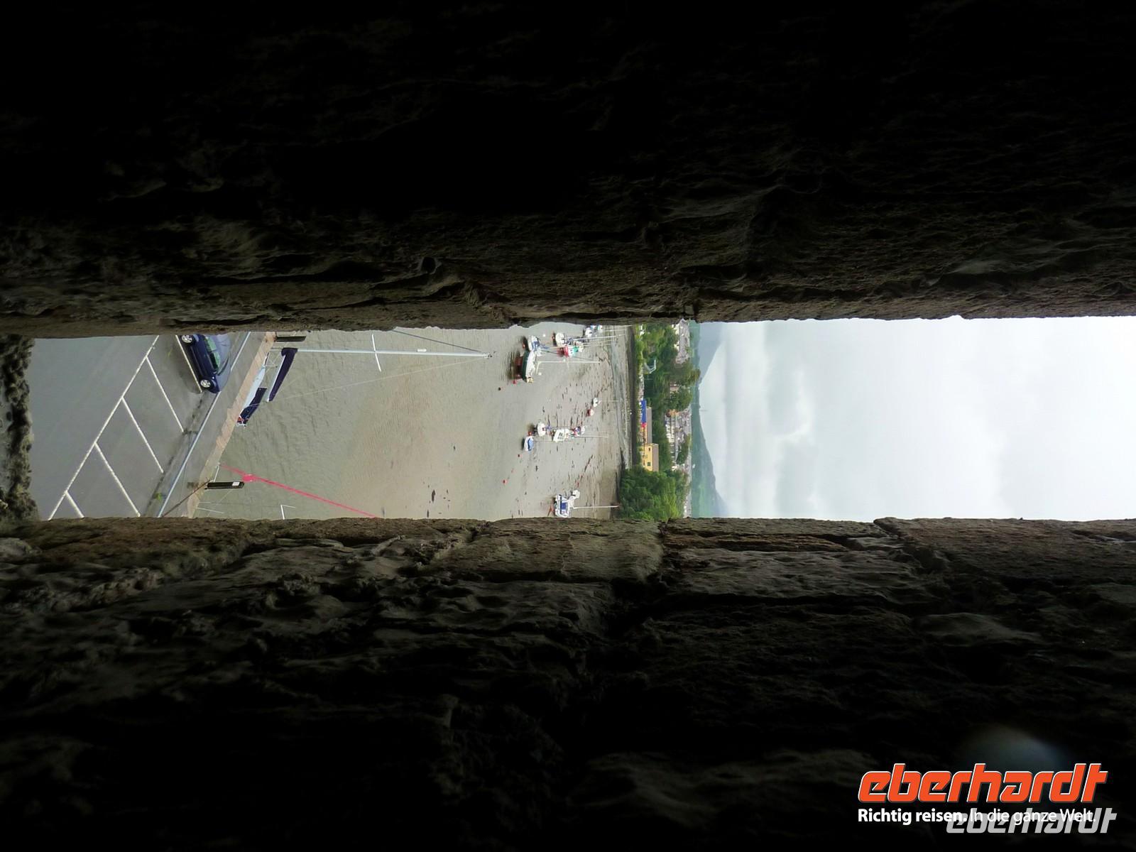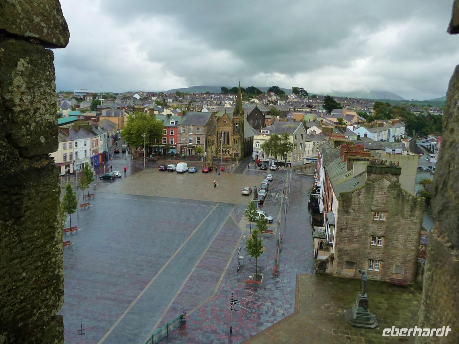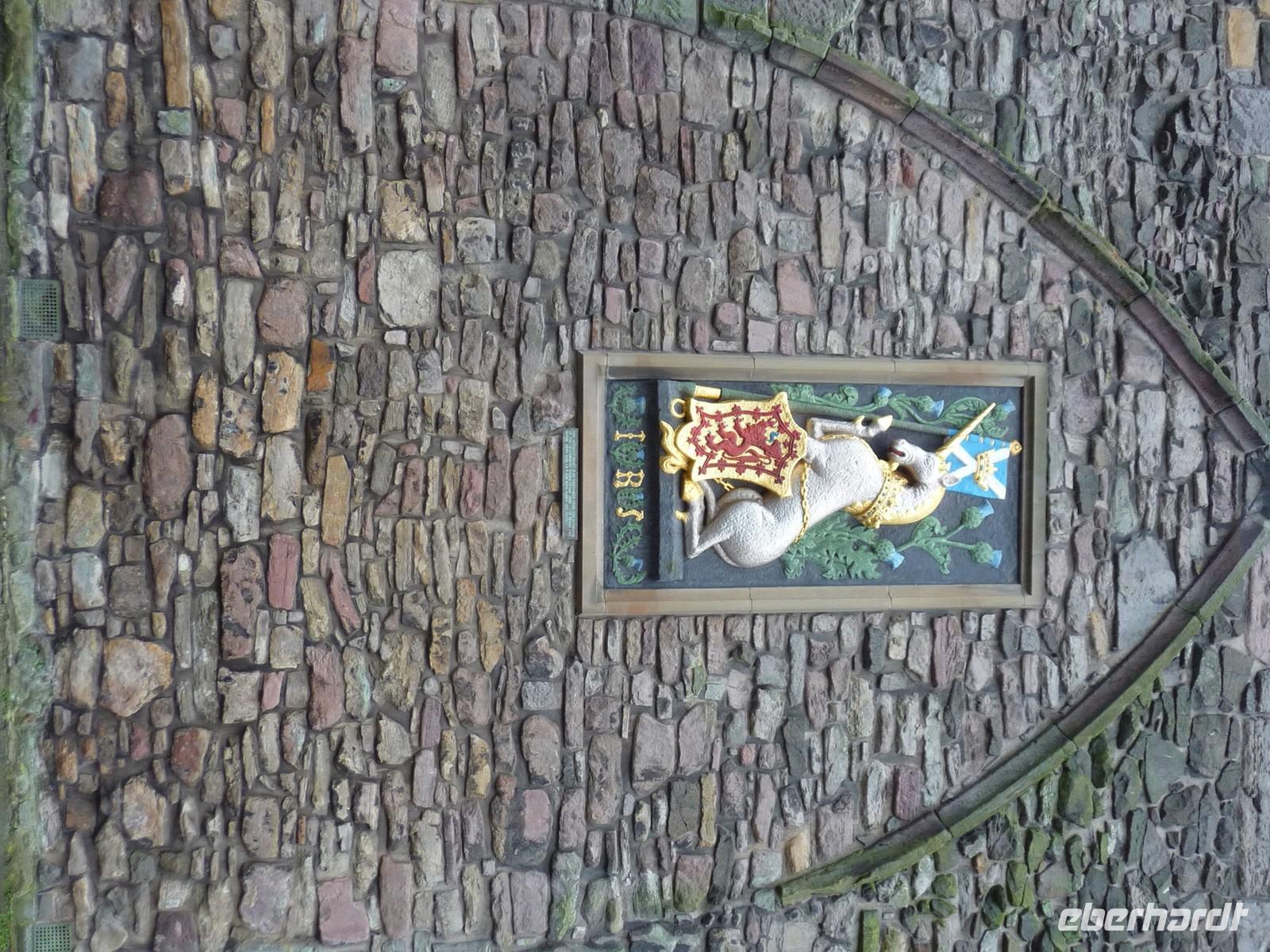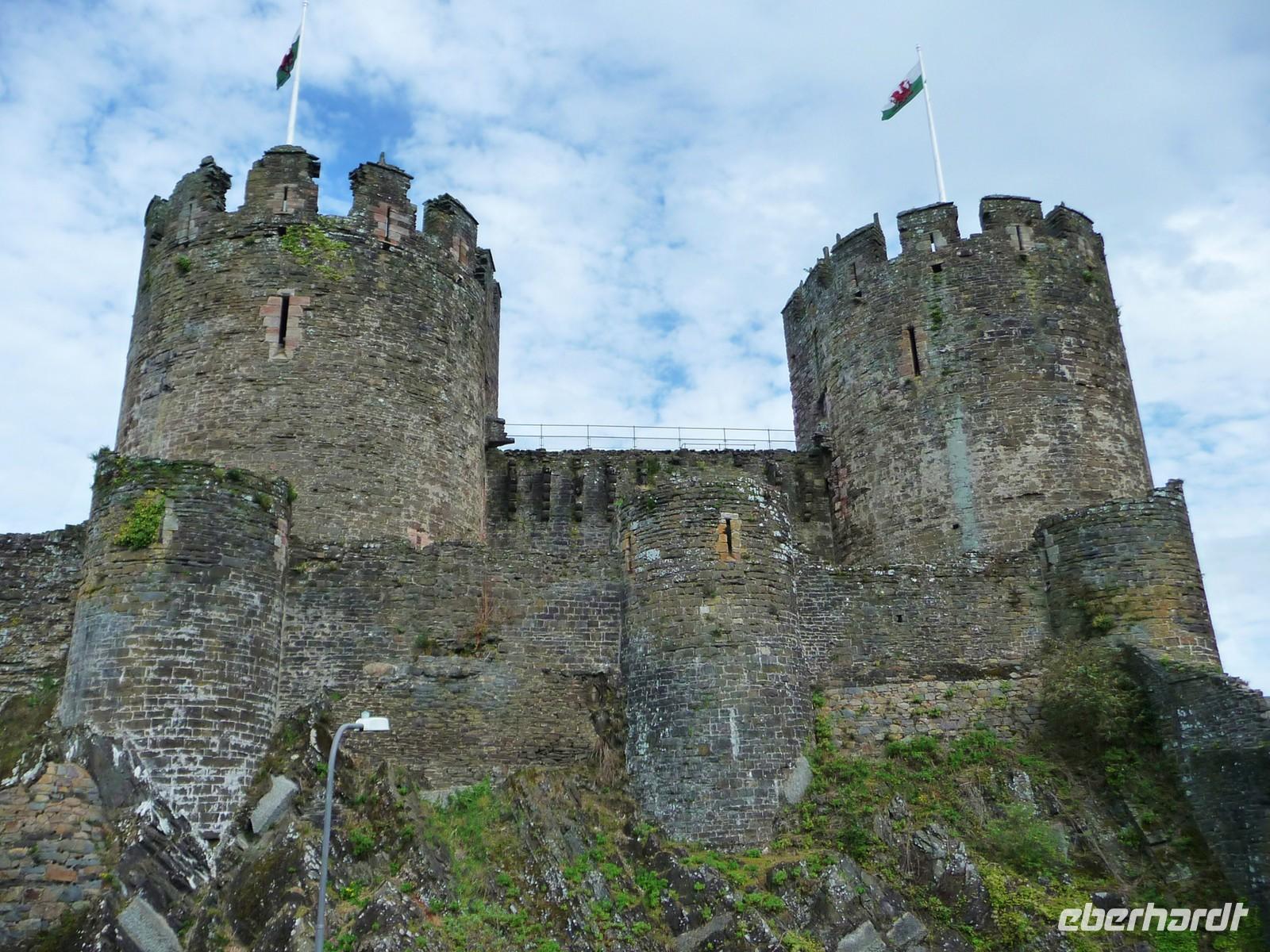 Ausgerechnet heute Regen, mit nur kurzen Unterbrechungen. Wir fahren hinein nach Wales, entlang der Küstenstraße geht es bis Caernarfon. Hier laufen wir, leider bei strömendem Regen, die wenigen Schritte vorbei an der alten Markthalle hin zum Castle. Wir gehen hinein, besichtigen zuerst die zahlreichen Ausstellungen im Innern der Türme, sehen die schwarzen, rund angeordneten Steinplatten in der Mitte des Rasens im Schlosshof, die Bühne für die Krönung von Charles zum Prince of Wales im Jahre 1969 waren. Endlich hat der Regen aufgehört und wir können die Mauern, Wehrgänge und Türme erklimmen.