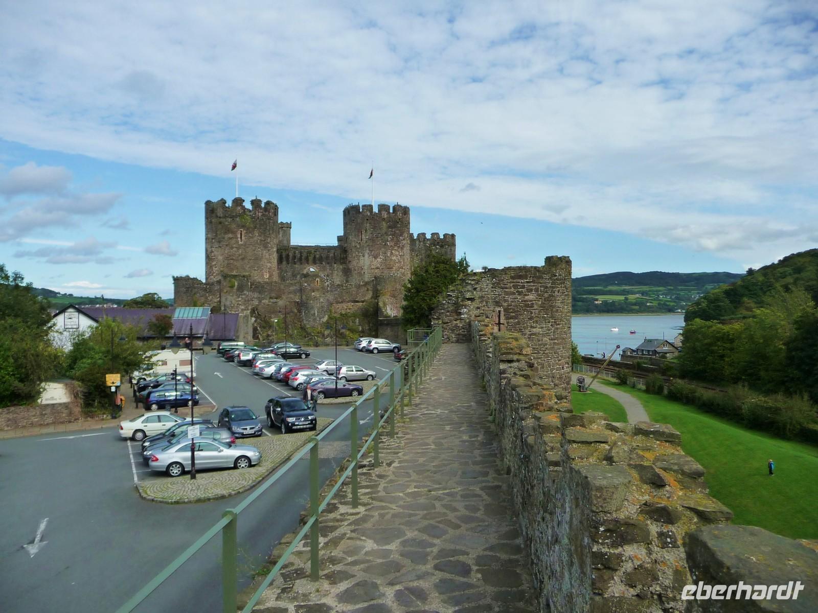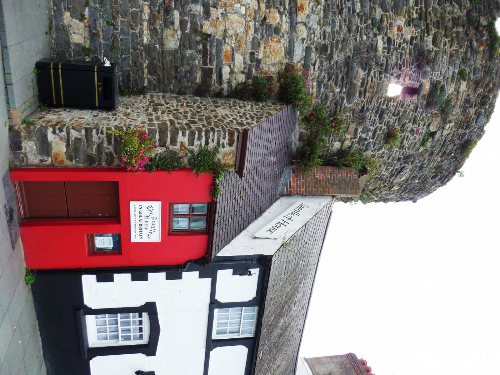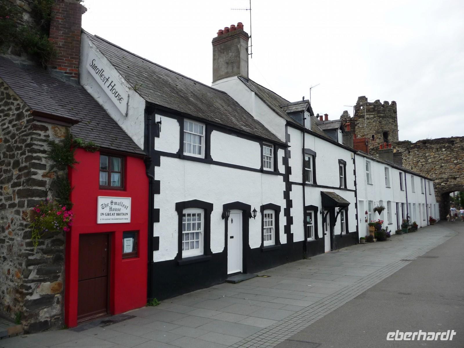 Im Ort sind wir zuerst zur Stadtmauer gelaufen, auf die Mauer gestiegen und darauf weiter, haben sehr schöne Aussicht, gehen vor dem Castle wieder herunter, weiter in Richtung Kai, vorbei am ältesten Haus, dann durch das Tor zur Uferpromenade und nach links zum kleinstem Haus in GB, von hier zurück und durch Tor hinauf in die Stadt zum Plas Mawr, zur Kirche (die leider geschlossen ist) und zur Telford-Brücke. Leider beginnt es nun wieder zu regnen und wir flüchten in unser Hotel.