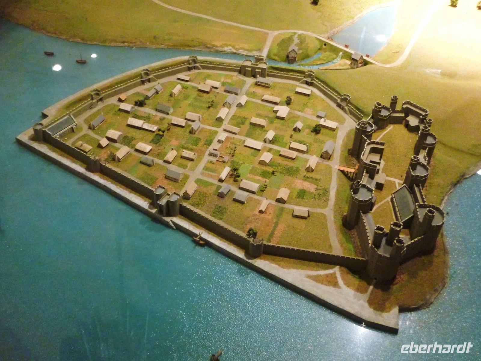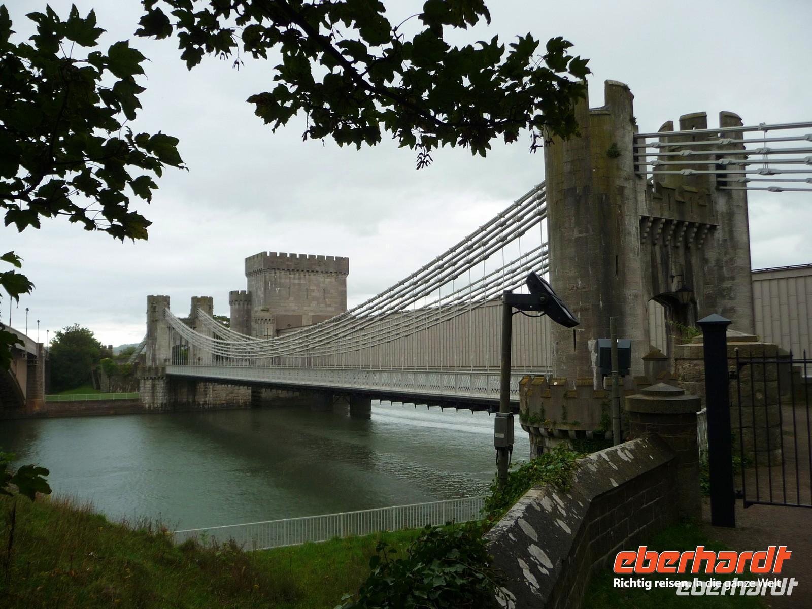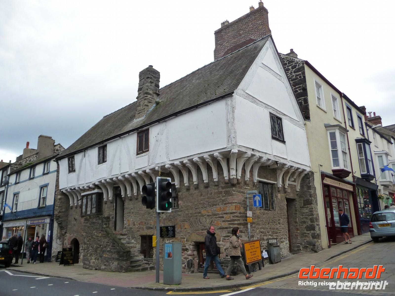 Im Ort sind wir zuerst zur Stadtmauer gelaufen, auf die Mauer gestiegen und darauf weiter, haben sehr schöne Aussicht, gehen vor dem Castle wieder herunter, weiter in Richtung Kai, vorbei am ältesten Haus, dann durch das Tor zur Uferpromenade und nach links zum kleinstem Haus in GB, von hier zurück und durch Tor hinauf in die Stadt zum Plas Mawr, zur Kirche (die leider geschlossen ist) und zur Telford-Brücke. Leider beginnt es nun wieder zu regnen und wir flüchten in unser Hotel.