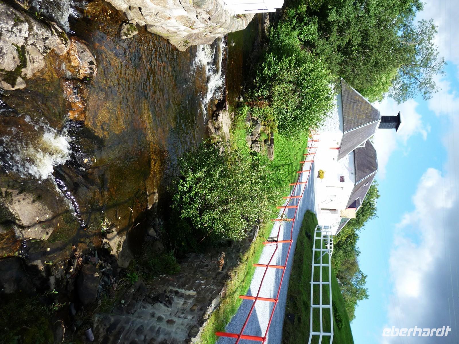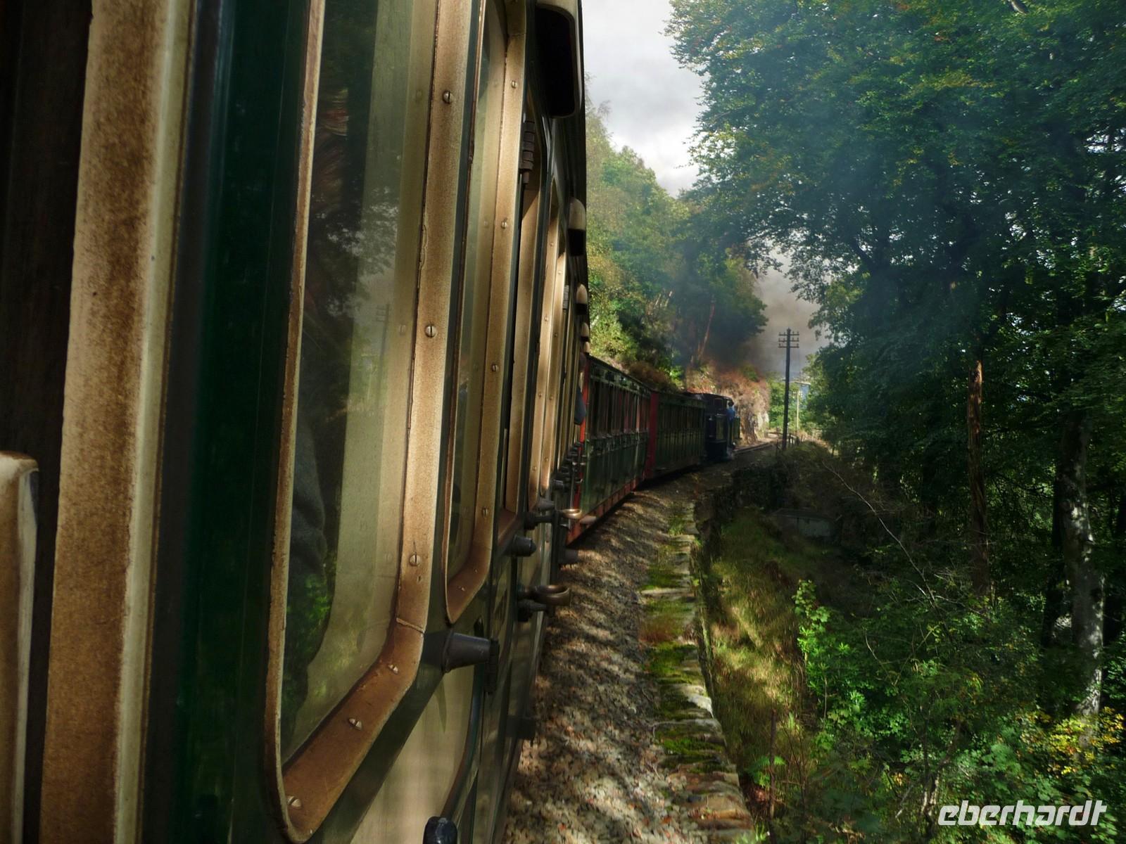 nach Blaneau. Wieder geht es schnaufend durch malerische Landschaft, Erika blüht auf den Bergen, Wasserfälle stürzen talwärts und im mittleren Bahnhof kommt es zur Begegnung mit dem historischen Gegenzug. Interessant auch die Schleife in der Trassenführung der Bahn.