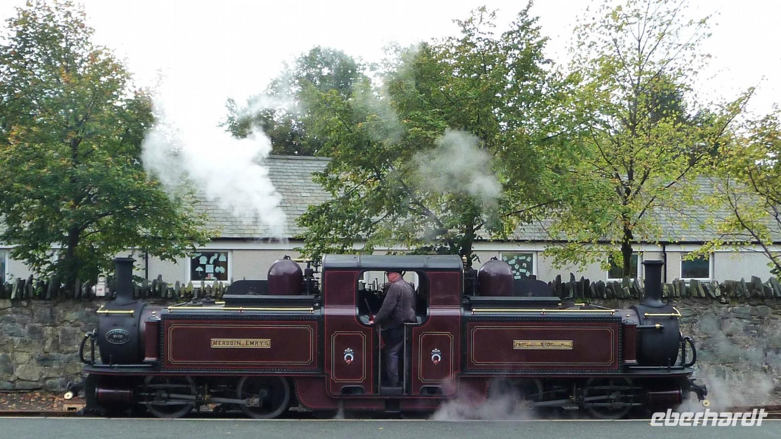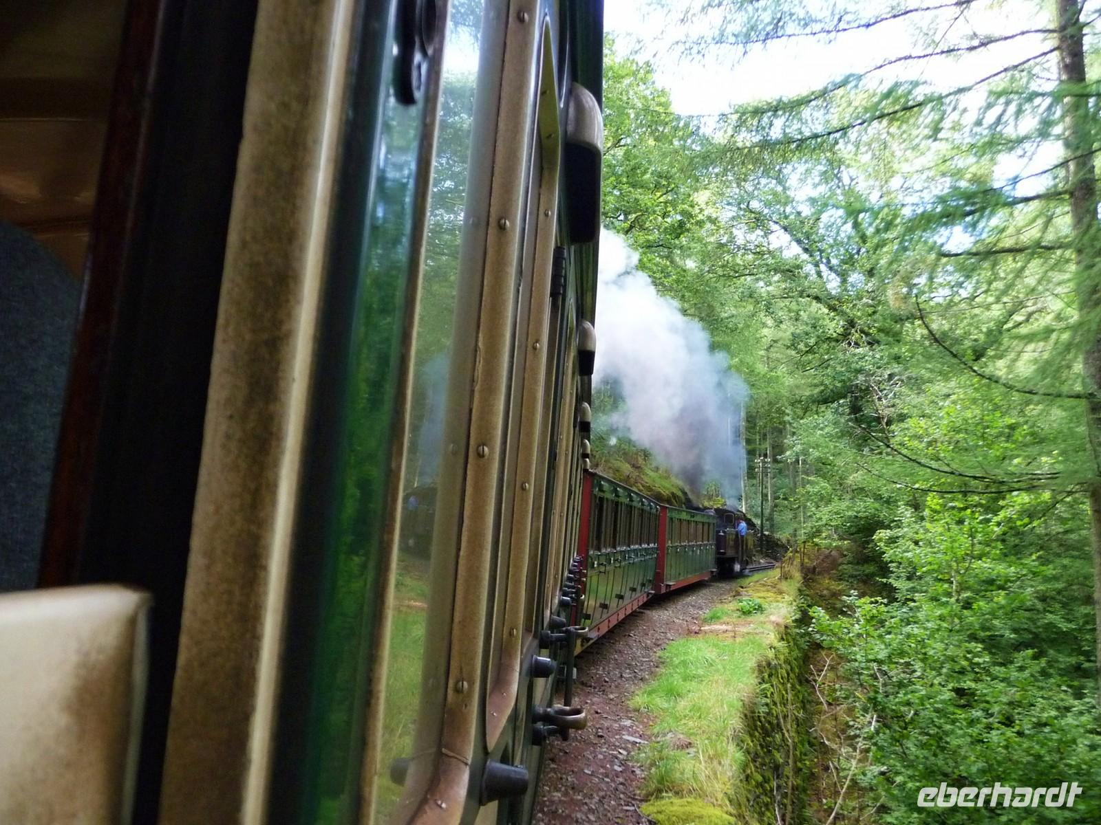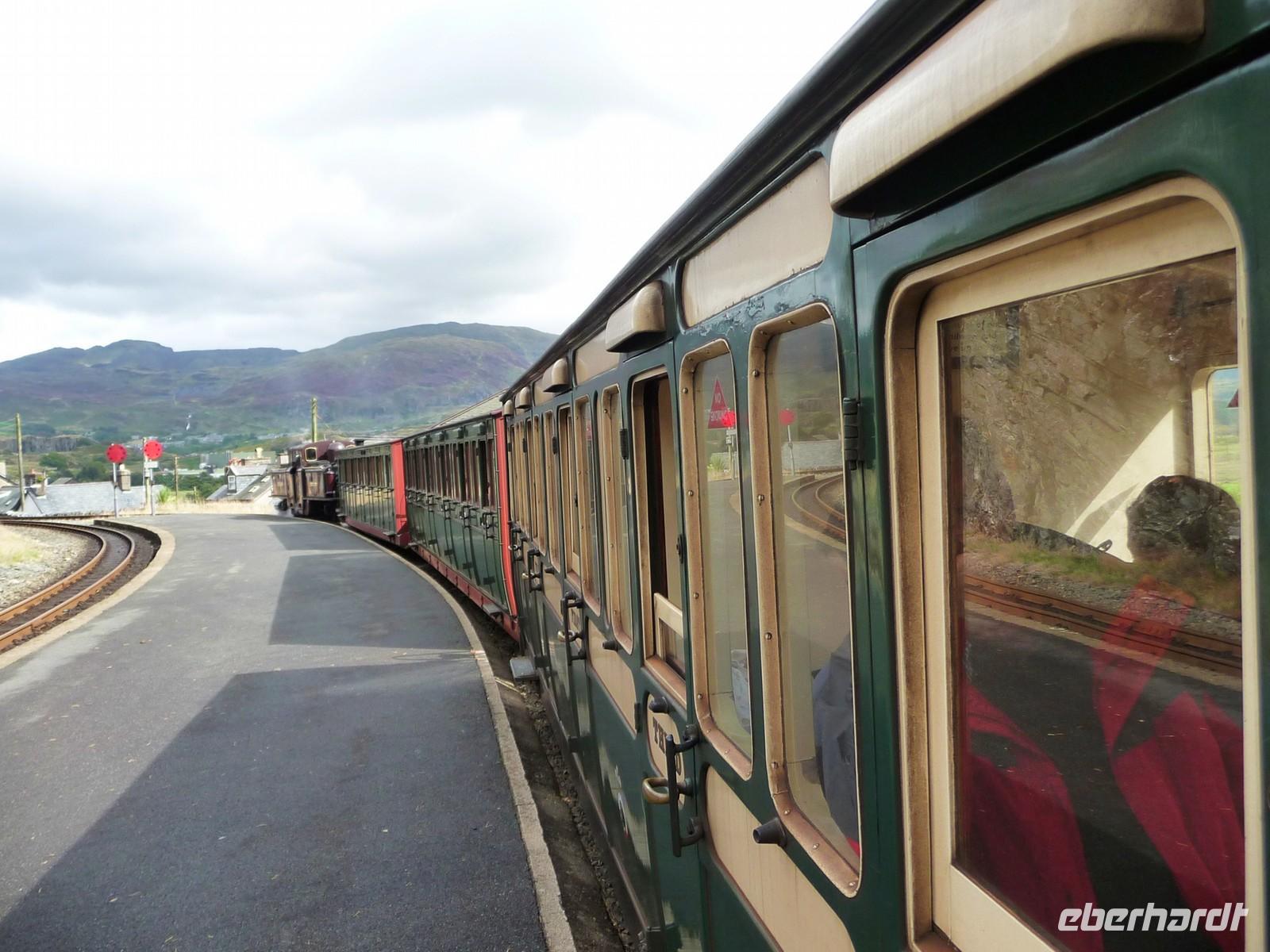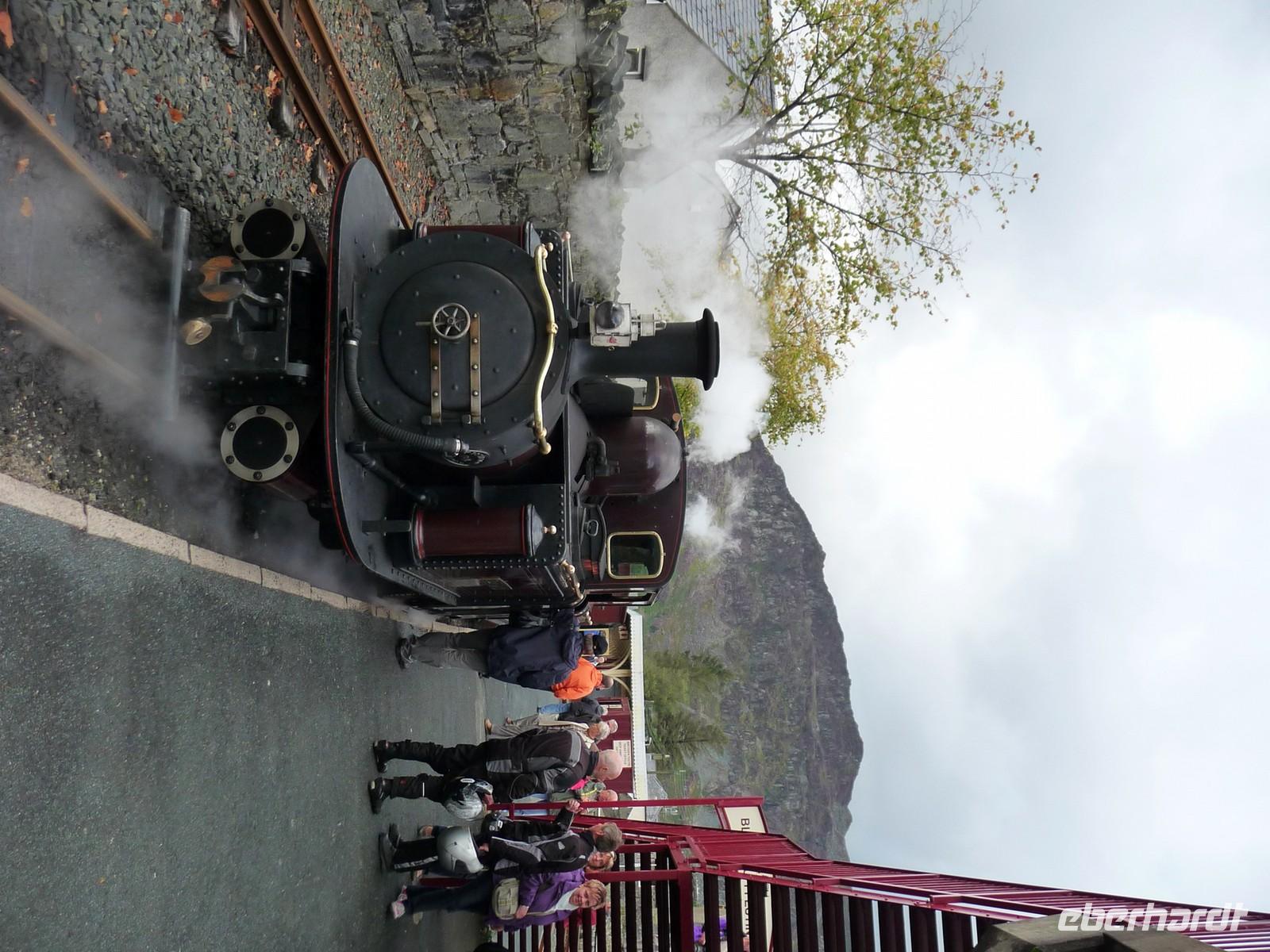 Danach geht es weiter durch das malerische Tal in Richtung Porthmadog. Ein braunes Schild weist uns den Weg zur Ffestinog Railway. Wir nehmen in den Wagons der Schmalspurbahn platz und fahren mit dem Dampfzug