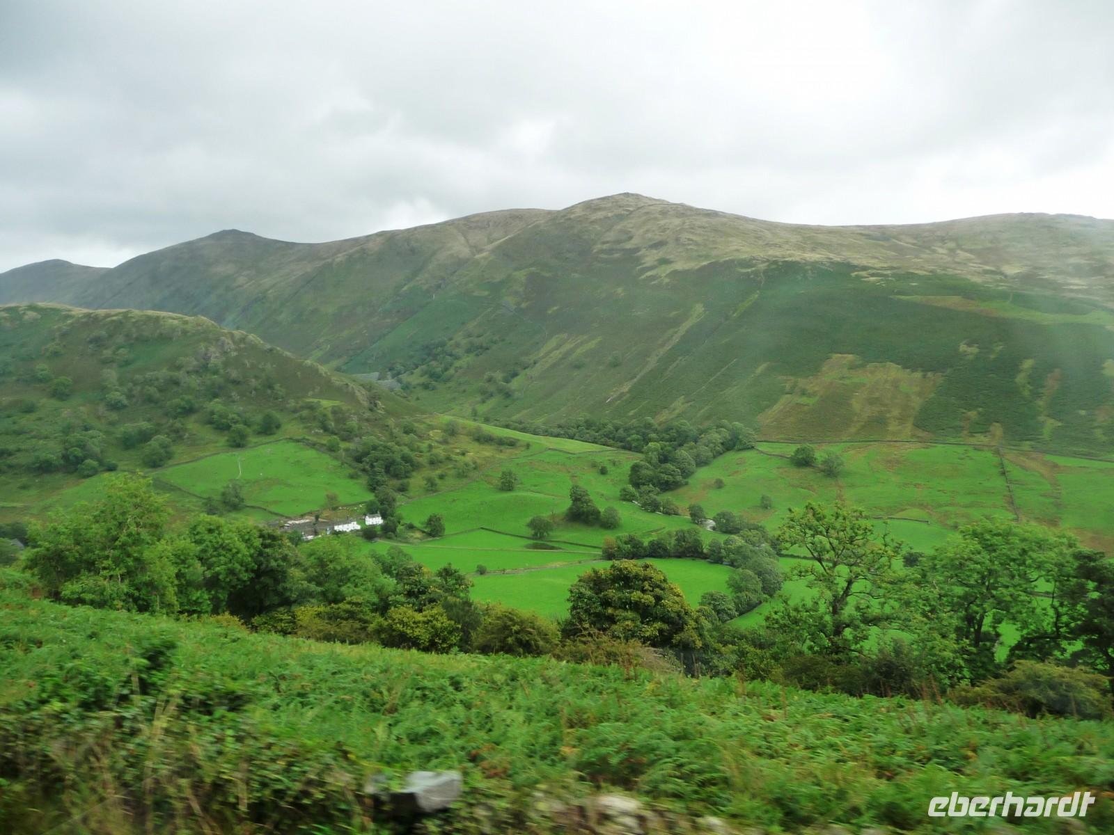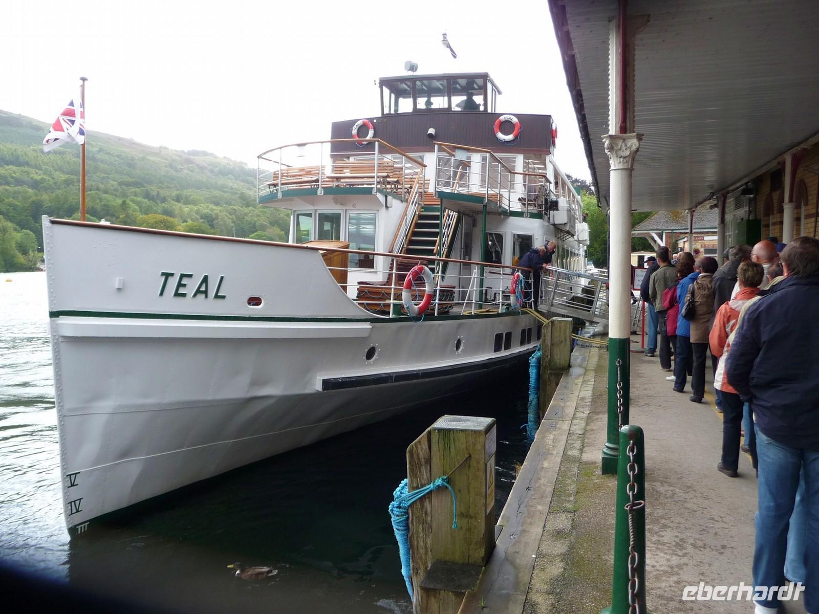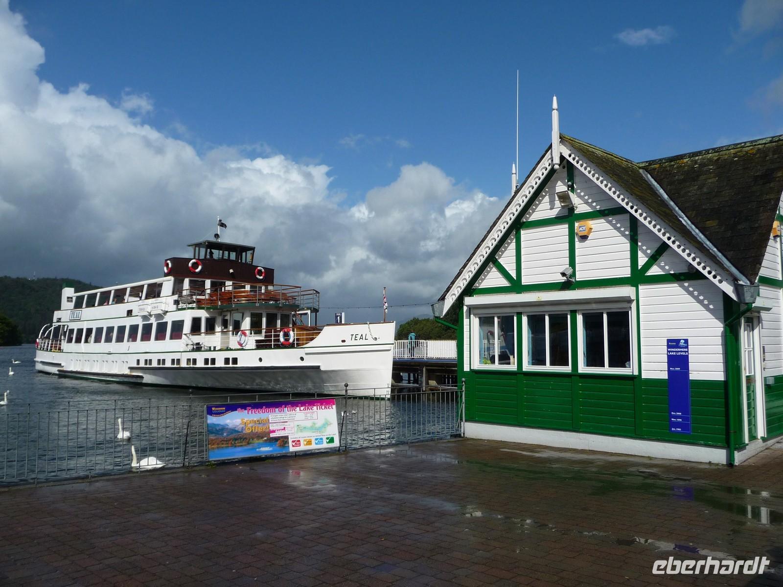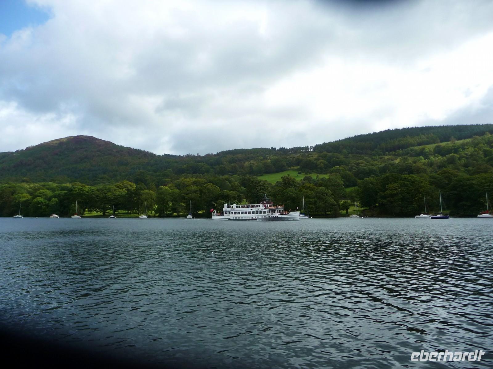 Erst ein kurzer Regenschauer aber dann kommen gute Fotogelegenheiten. Zuerst der See, dann der ankommende Dampflokzug, schließlich die Schiffsankunft. Wir steigen ein und das Schiff legt 11:25 Uhr ab. Wir haben gute Plätze und genießen die landschaftlich schöne Fahrt nach Bowness. Von hier geht es nun hinauf in die Berge, zum Kirkstone Pass, wo wir trotz Regenschauer einen kurzen Fotostopp machen. Dann geht es das romantische Tal hinab, hinüber nach Schottland und zur alten Schmiede Gretna Green.