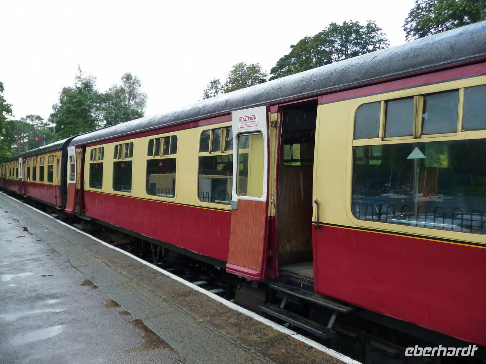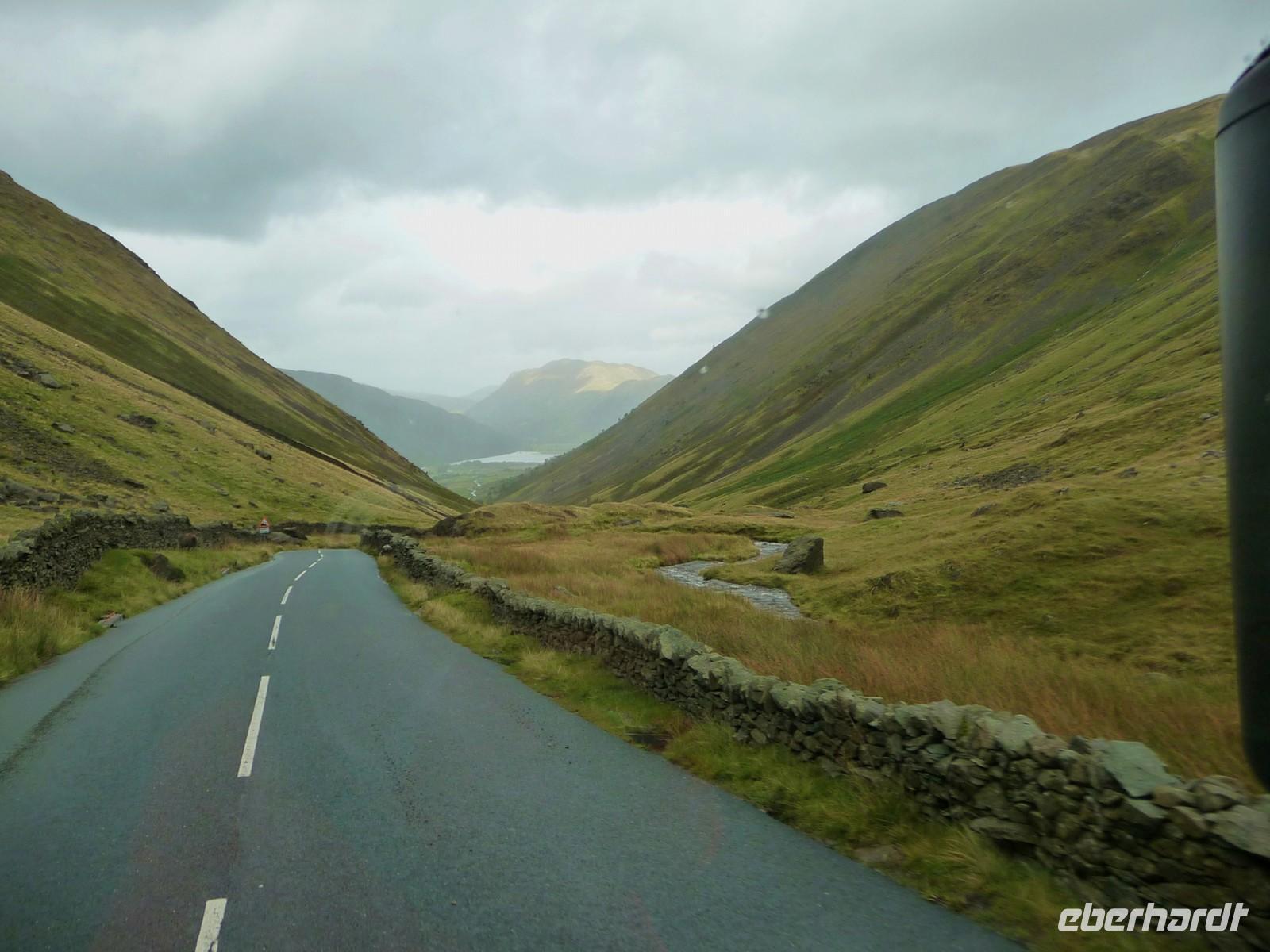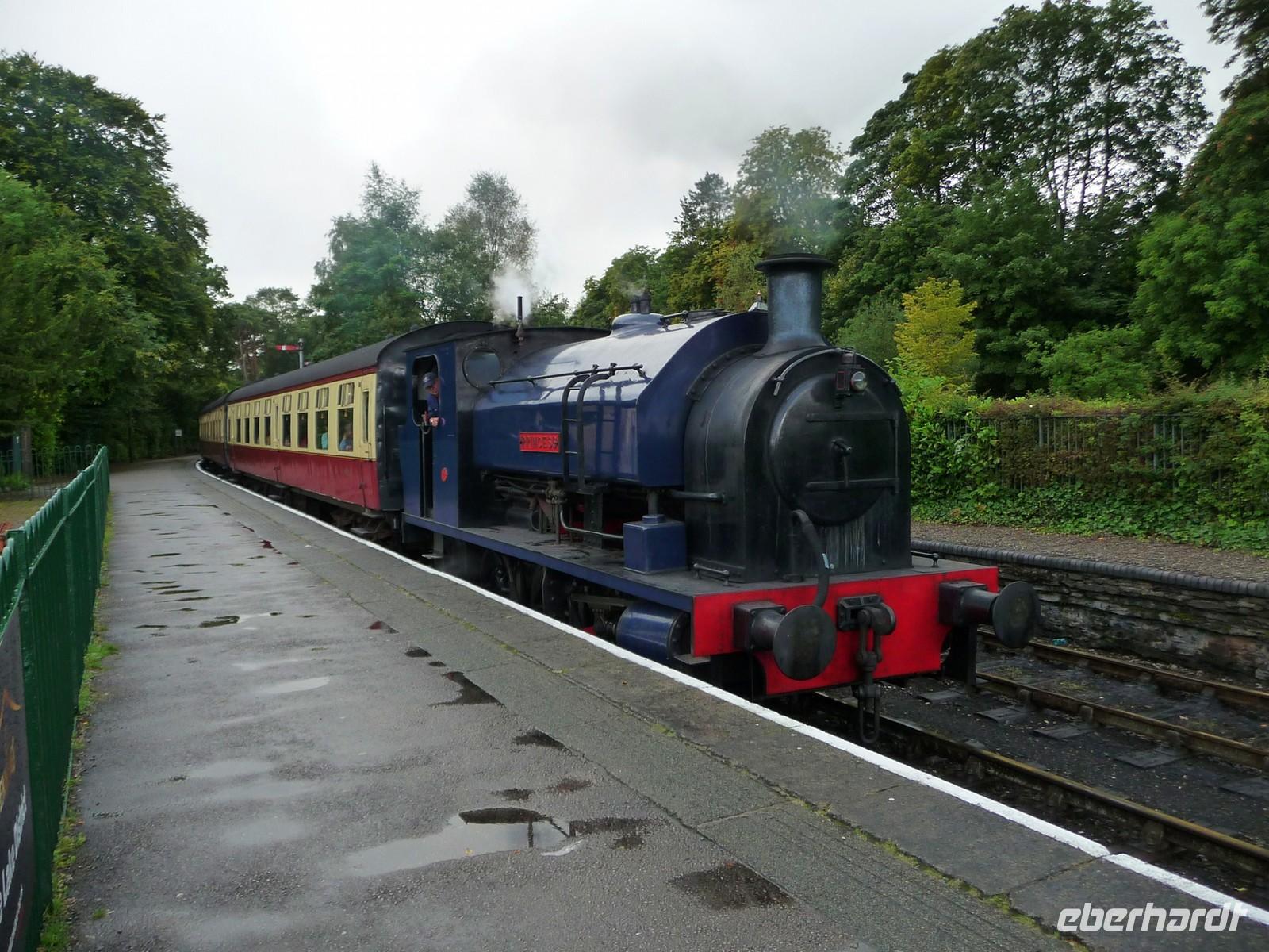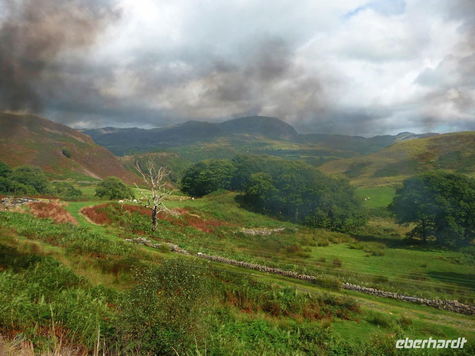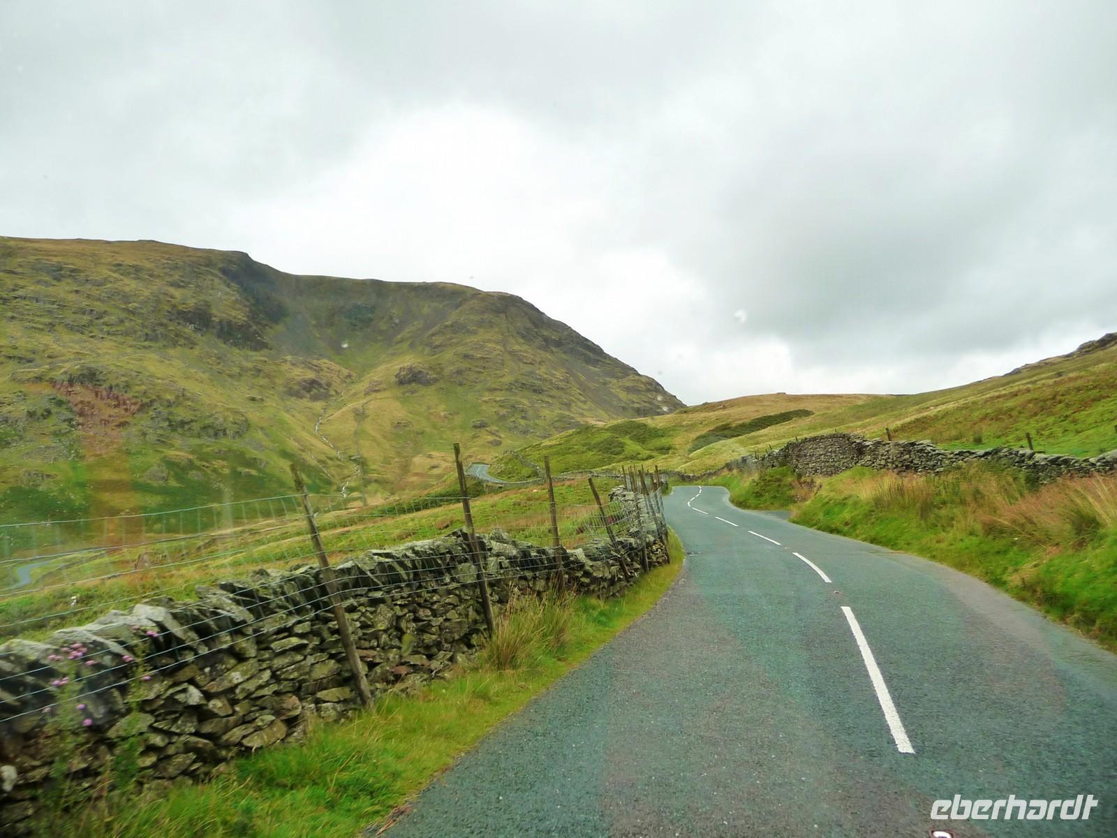 Erst ein kurzer Regenschauer aber dann kommen gute Fotogelegenheiten. Zuerst der See, dann der ankommende Dampflokzug, schließlich die Schiffsankunft. Wir steigen ein und das Schiff legt 11:25 Uhr ab. Wir haben gute Plätze und genießen die landschaftlich schöne Fahrt nach Bowness. Von hier geht es nun hinauf in die Berge, zum Kirkstone Pass, wo wir trotz Regenschauer einen kurzen Fotostopp machen. Dann geht es das romantische Tal hinab, hinüber nach Schottland und zur alten Schmiede Gretna Green.