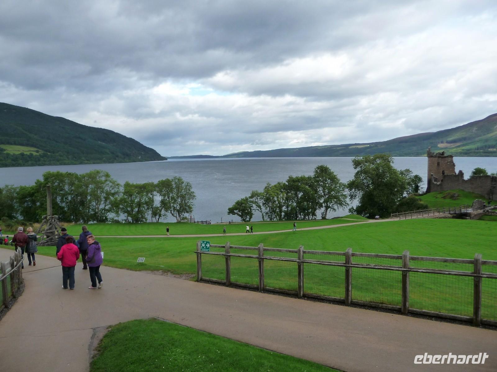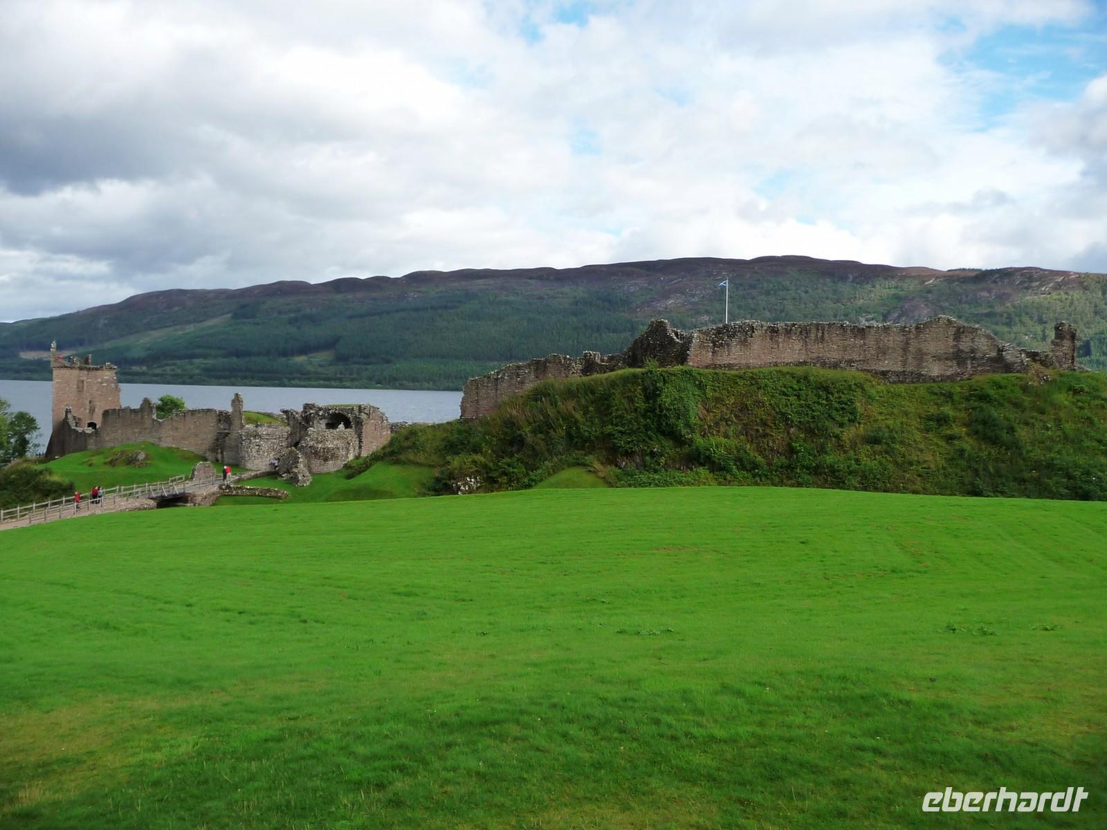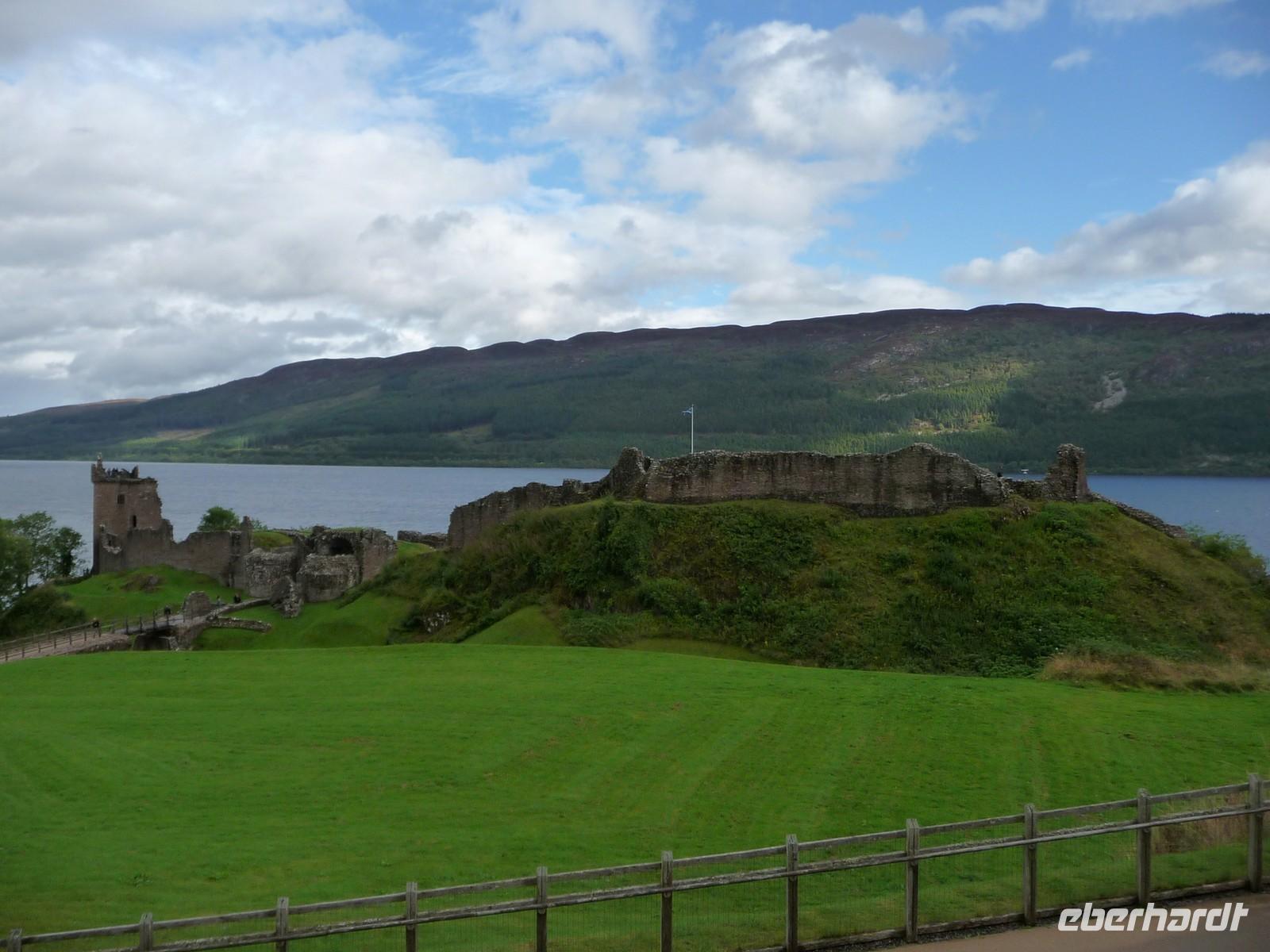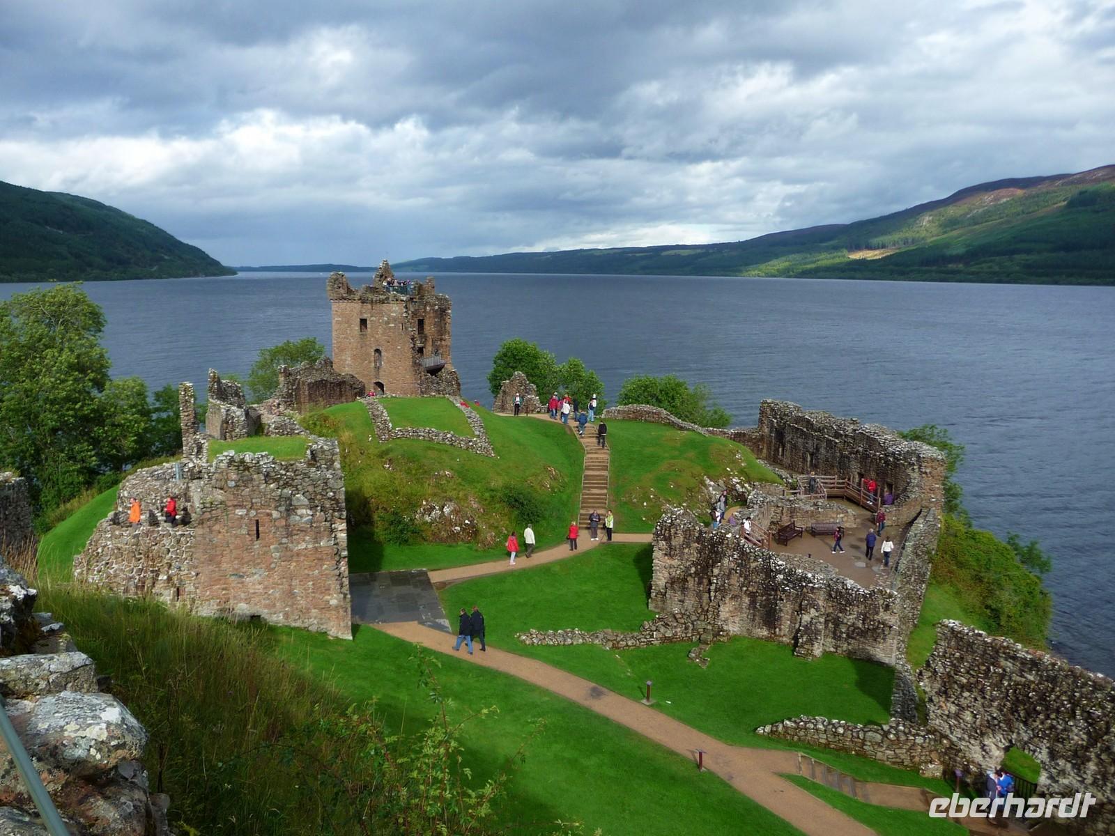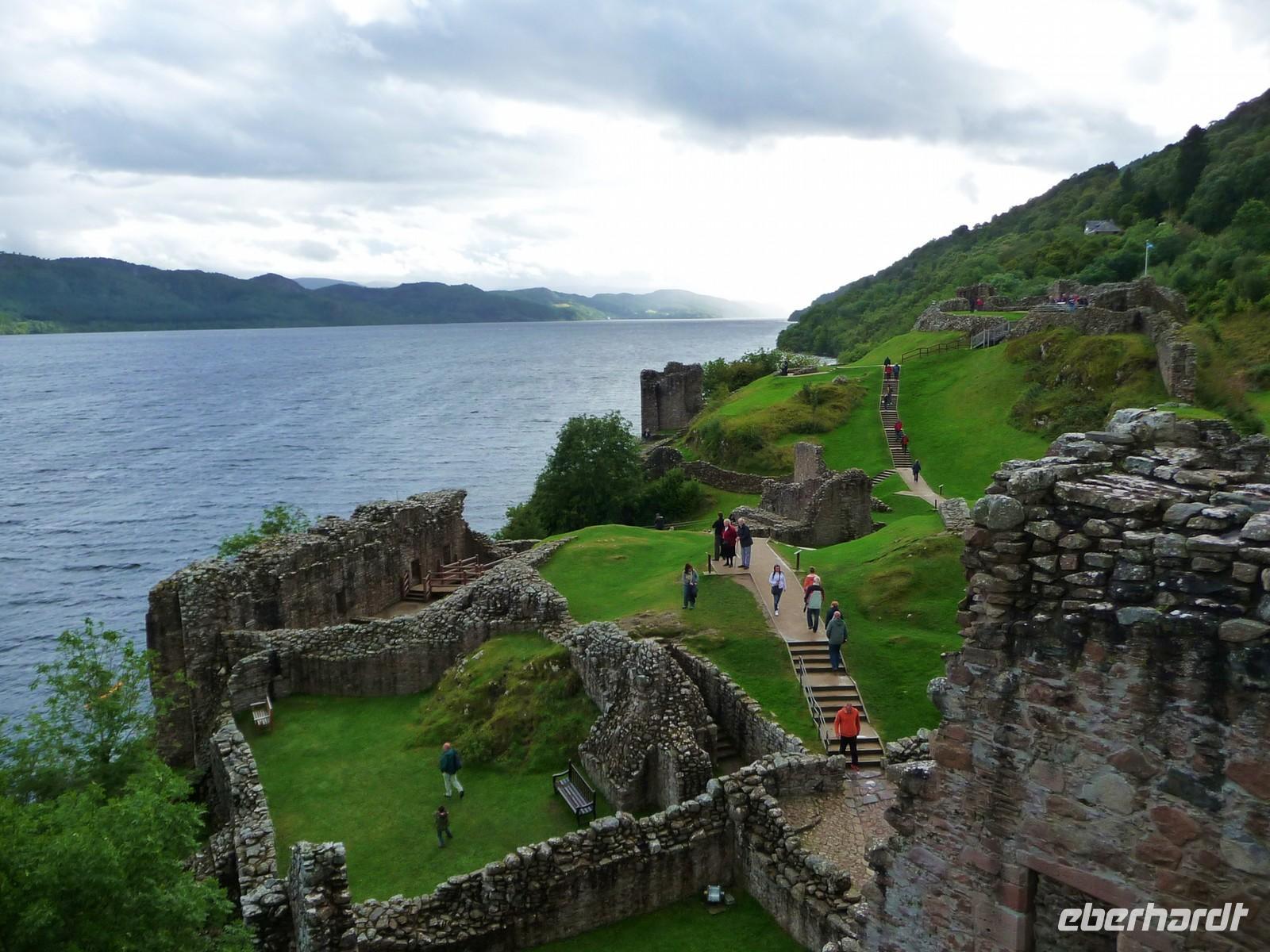 Später dann, am Commando Memorial schauen wir zum höchsten Berg Großbritanniens und machen Mittag. Nächster Fotostopp ist in Fort Augustus an den Schleusenstufen des Caledonian Canals. Ein historisches Dampfschiff wird gerade durch die Schleusen gehoben und der Kapitän spielt Lieder auf der Dampforgel des Schiffssignals. Am berühmten Urquhart Castle kommen wir 14:30 Uhr an und gehen in das kleine Kino, wo der Film über die Geschichte des Castles in deutscher Sprache gezeigt wird - mit einem sehr schönen Effekt am Ende. Nun besuchen wir individuell die Ruine des Castle. Auf der Fahrt zum Hotel halten wir noch am Nessie-Center in Drumnadrochit, um Nessi zu fotografieren.