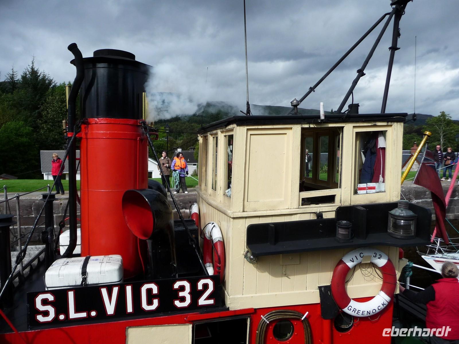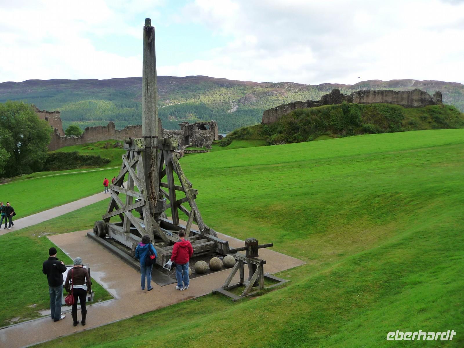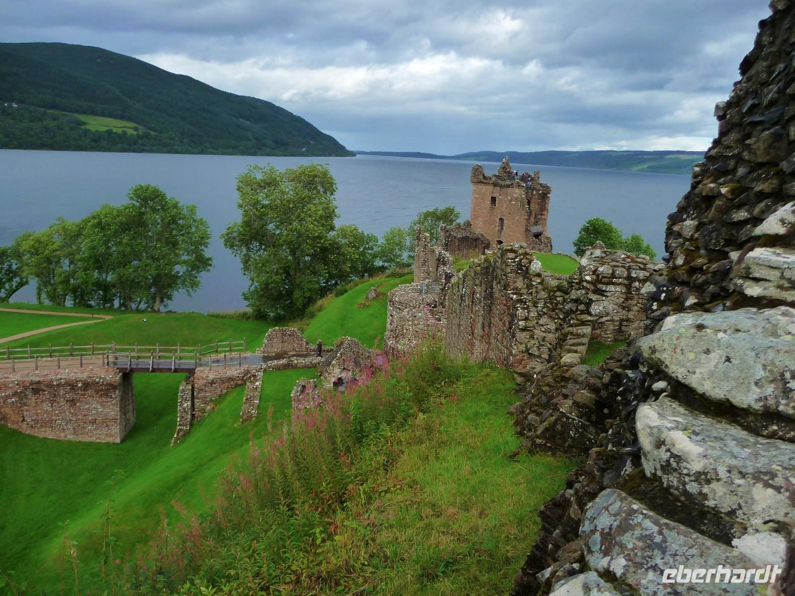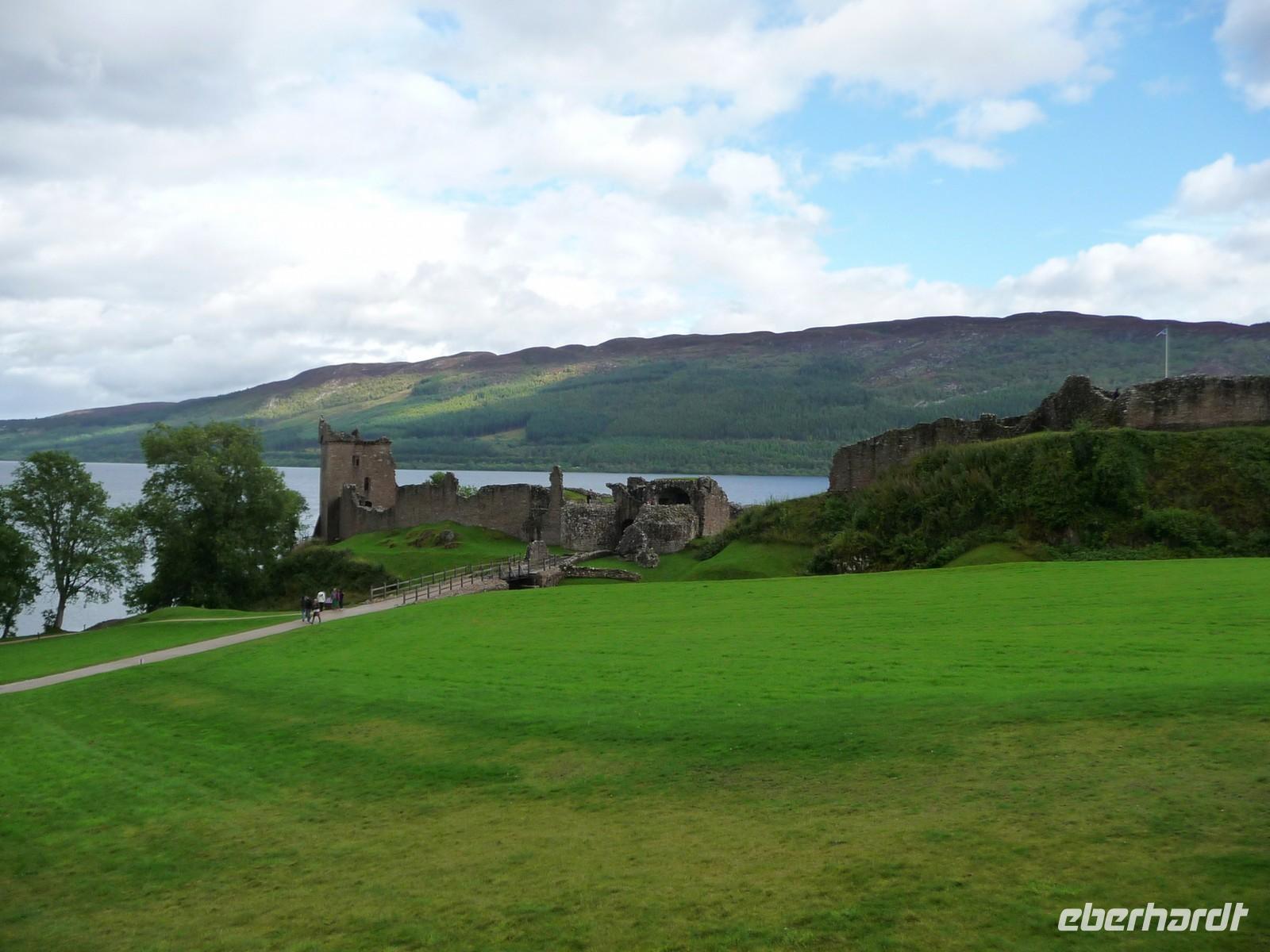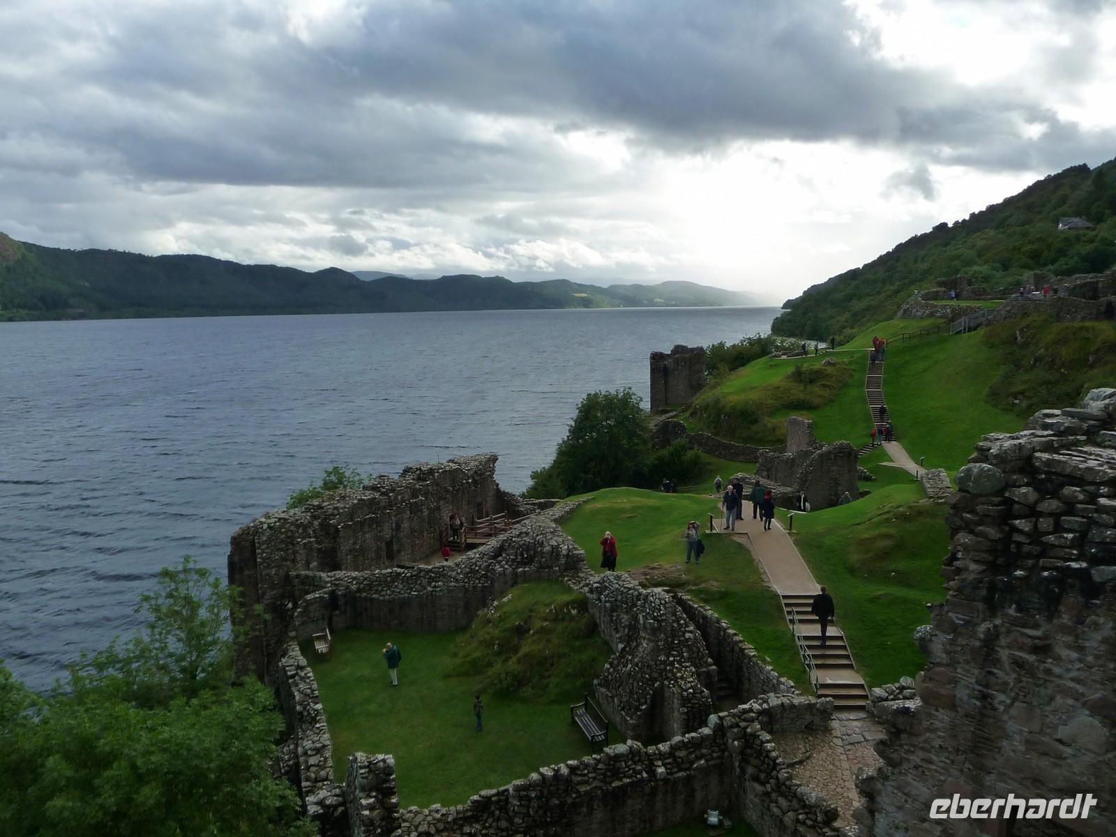 Später dann, am Commando Memorial schauen wir zum höchsten Berg Großbritanniens und machen Mittag. Nächster Fotostopp ist in Fort Augustus an den Schleusenstufen des Caledonian Canals. Ein historisches Dampfschiff wird gerade durch die Schleusen gehoben und der Kapitän spielt Lieder auf der Dampforgel des Schiffssignals. Am berühmten Urquhart Castle kommen wir 14:30 Uhr an und gehen in das kleine Kino, wo der Film über die Geschichte des Castles in deutscher Sprache gezeigt wird - mit einem sehr schönen Effekt am Ende. Nun besuchen wir individuell die Ruine des Castle. Auf der Fahrt zum Hotel halten wir noch am Nessie-Center in Drumnadrochit, um Nessi zu fotografieren.