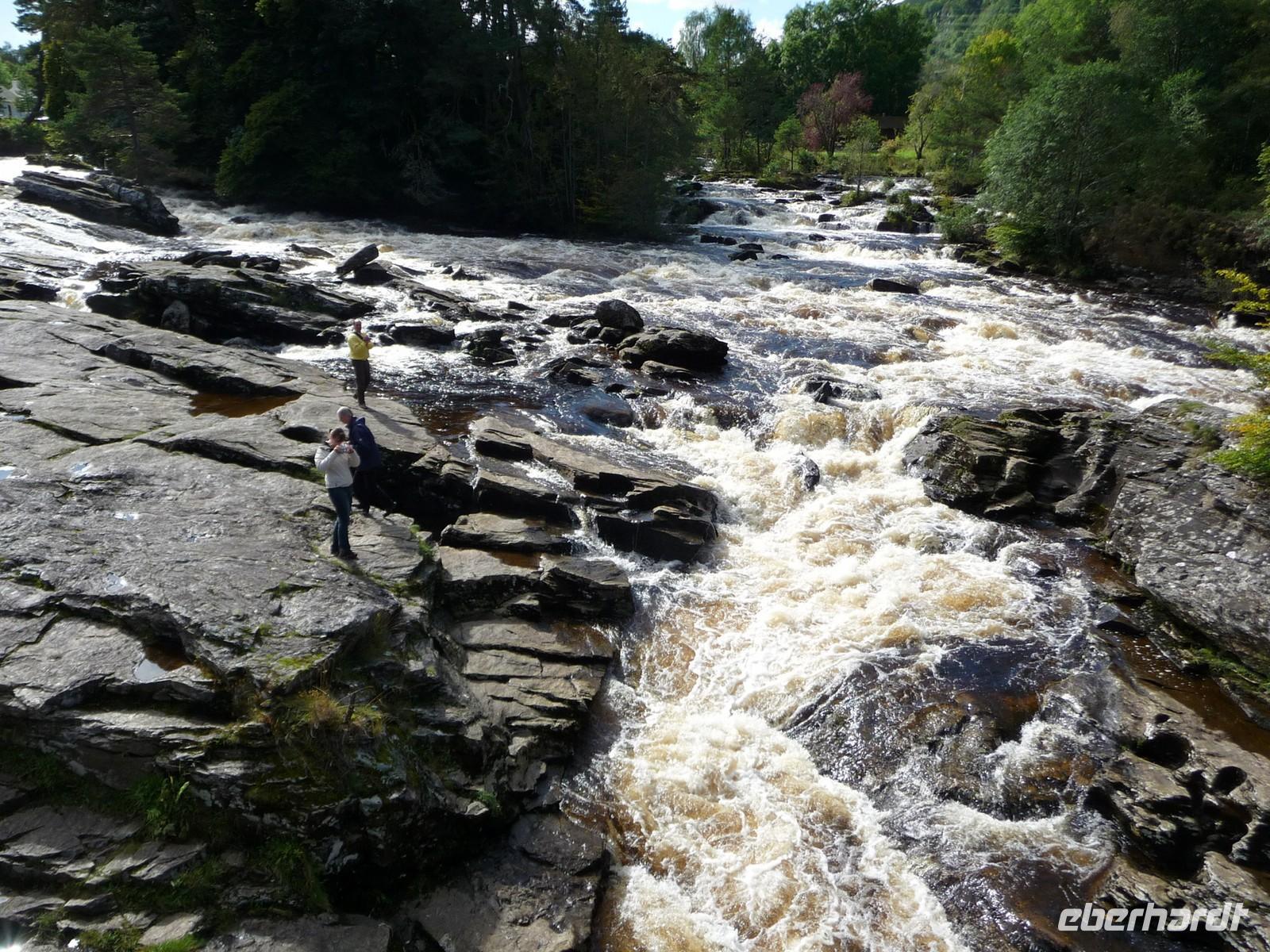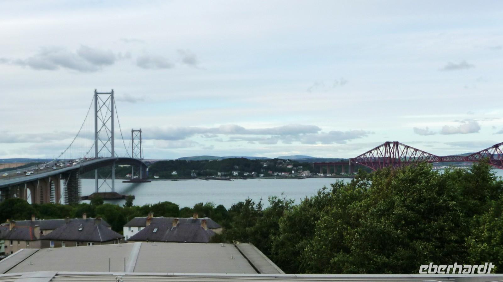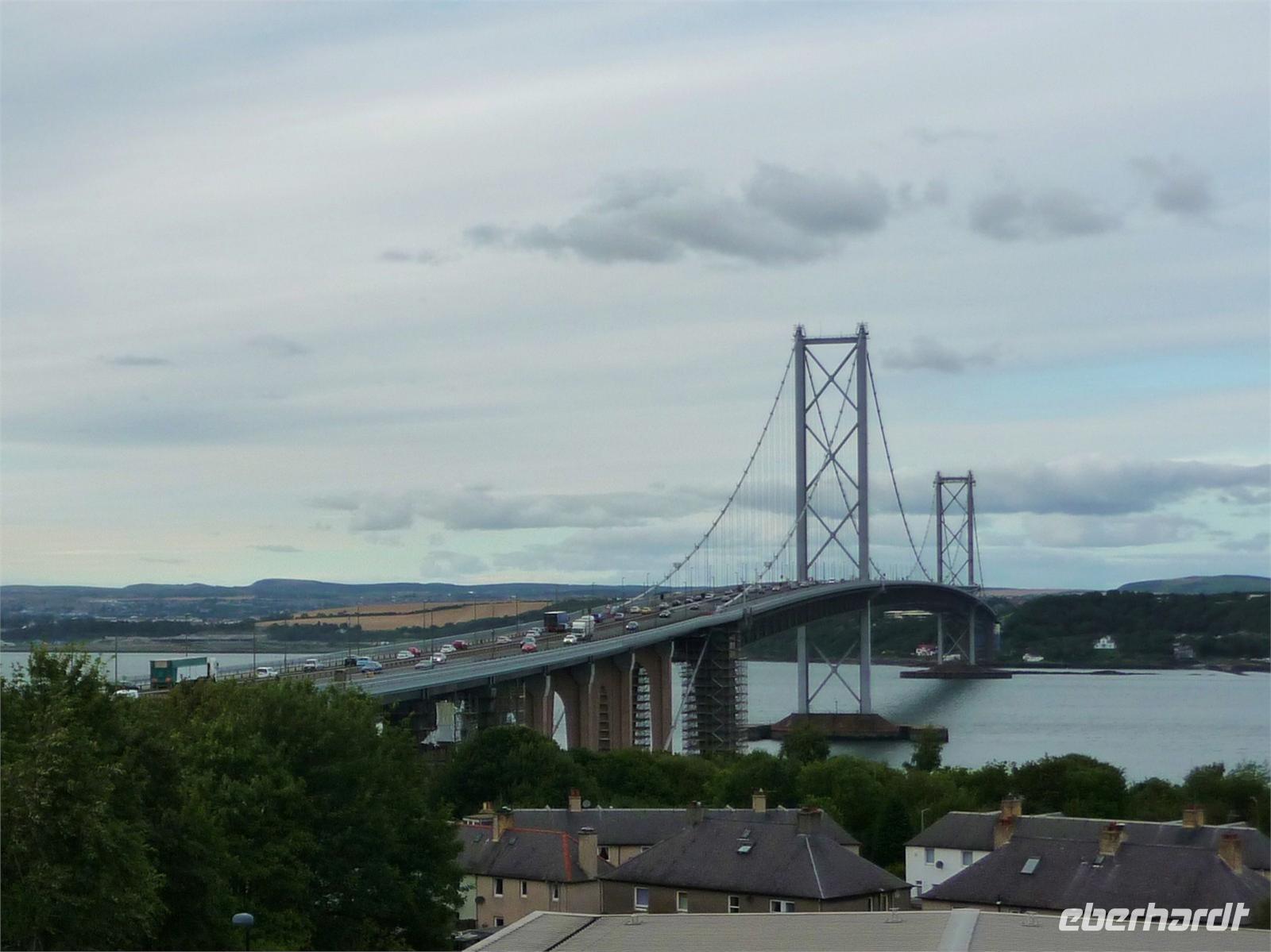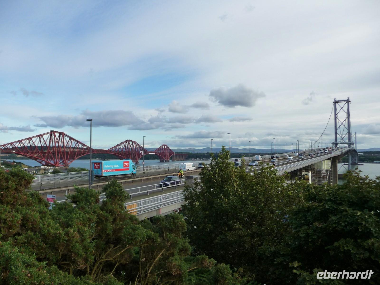 13:00 Uhr dann die Weiterfahrt durch die Trossachs - am Loch Tay vorbei nach Killin, hier besichtigen wir die Falls of Dochart, fahren danach weiter über Stirling, mit dem weithin sichtbaren schottischen Freiheitsdenkmal Richtung Edinburgh. Danach fahren wir entlang der Nordseite des Firth of Forth zur nördlichen Aussicht auf die Forth-Bridges, danach die Brückenüberfahrt, damit alle Gäste aus dem Bus die rote Eisenbahnbrücke fotografieren können - dabei der Vortrag des Gedichtes von Fontane „Tay-Bridge“, dann weiter zum südlichen Aussichtspunkt.