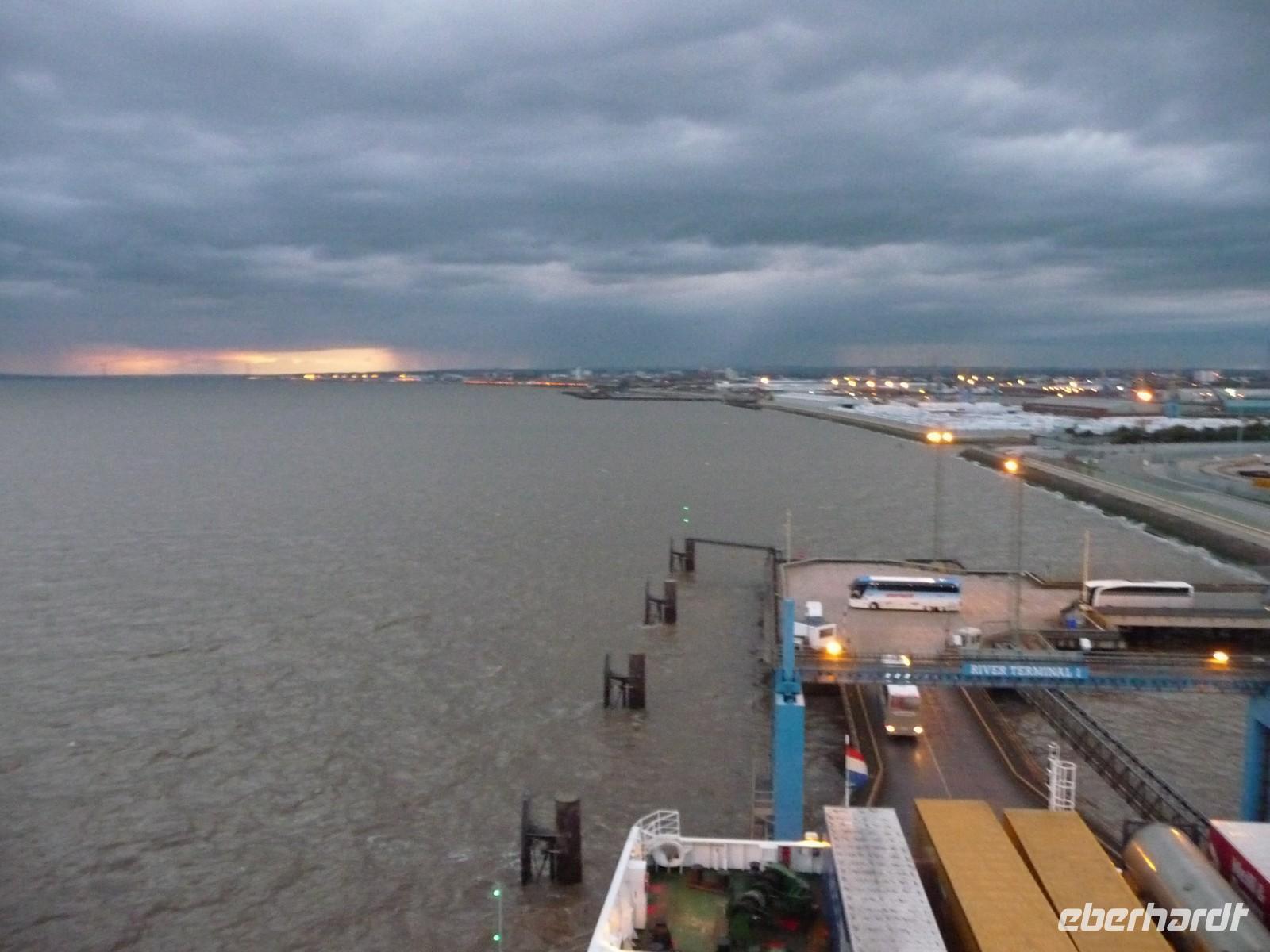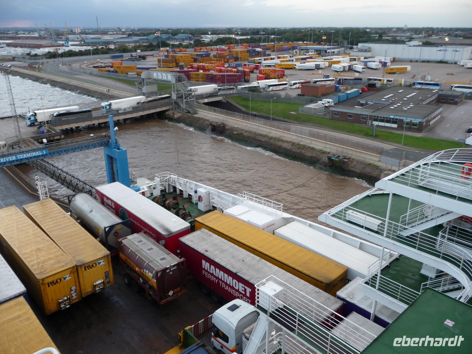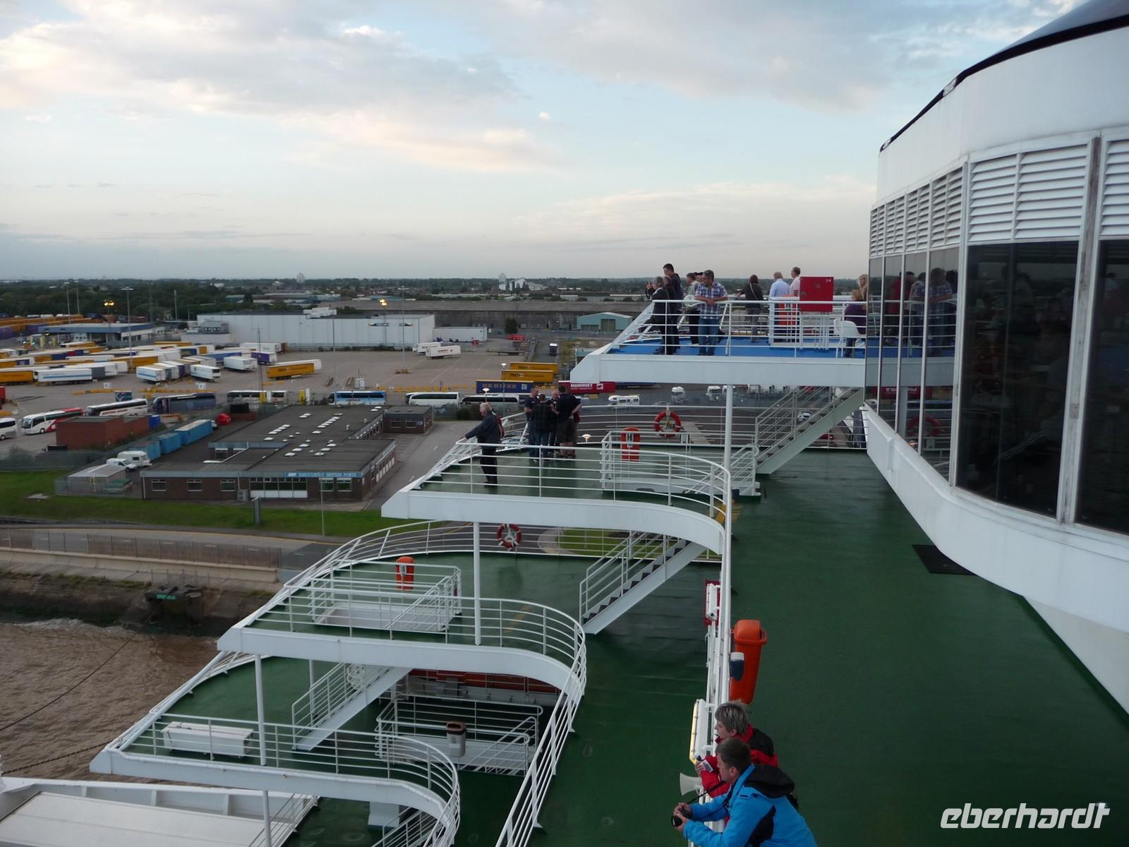 18:00 Uhr ist schließlich Ankunft im Fährhafen Hull, am George King Dock, wo unser Fährschiff schon auf uns wartet. 21 Uhr geht es hinaus auf die Nordsee.