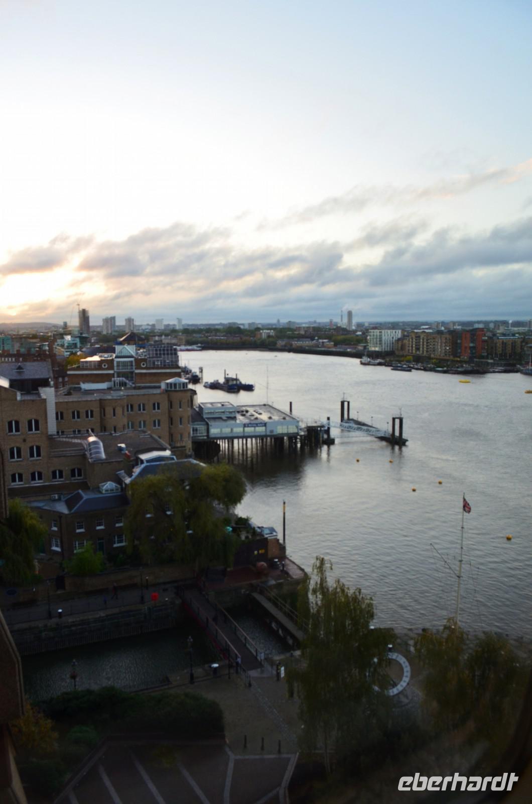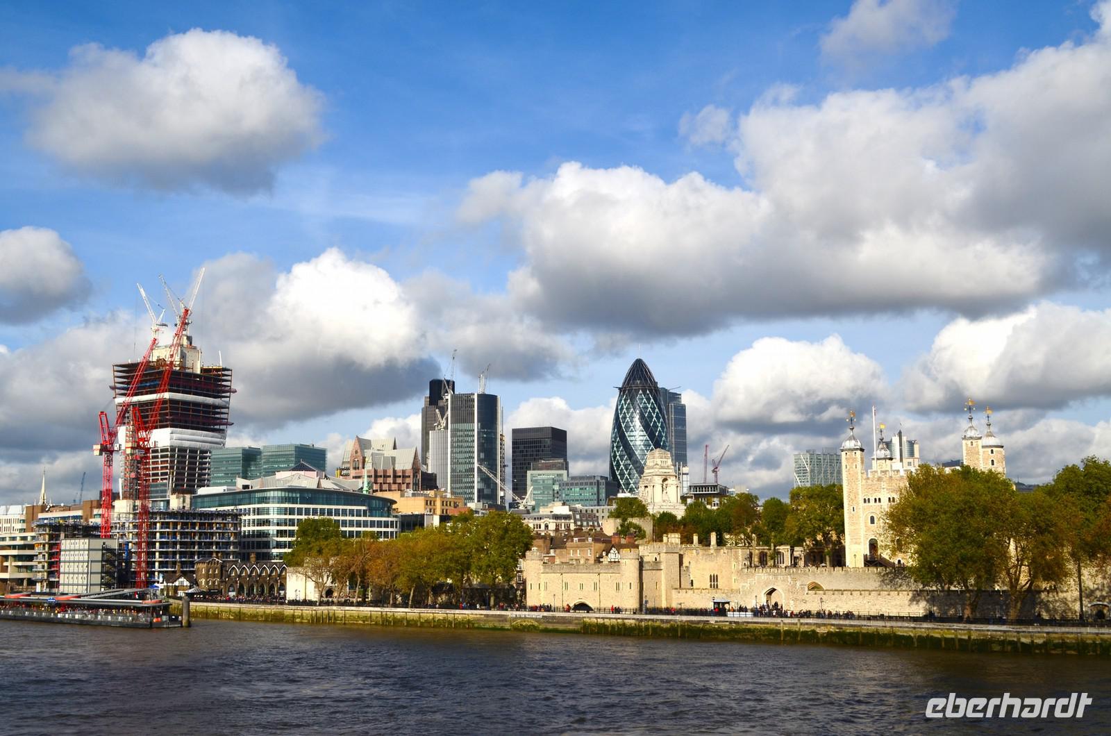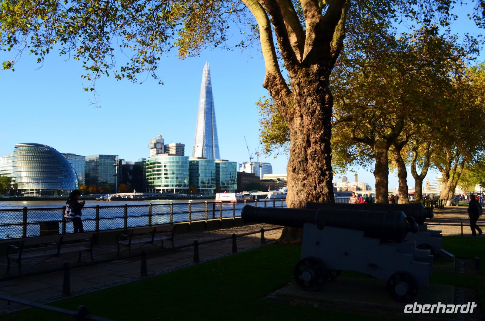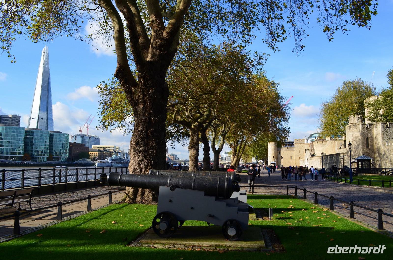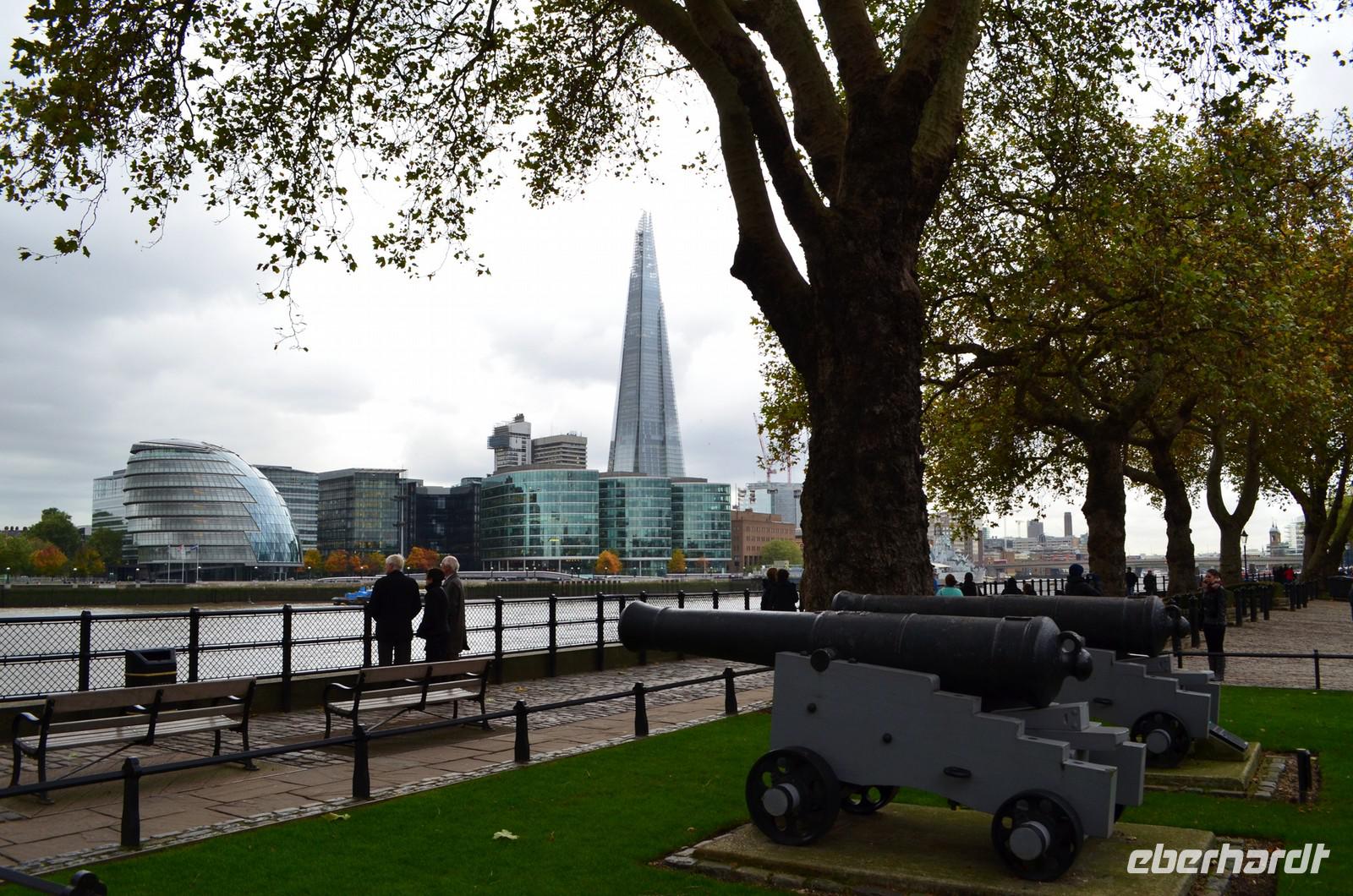 Nach dem Check Inn begrüßen wir auch unsere Fluggäste, die schon früher eingetroffen sind. Alle gemeinsam besuchen wir am Nachmittag den nahen Tower von London, laufen am Themseufer hinüber, machen die ersten Fotos der Londoner Skyline und betreten dann durch den Gruppeneingang die alte Festungsanlage, die von den „Beefeatern" bewachte und durch die Kolkraben beschützte Anlage, die von Wilhelm dem Eroberer 1078 gegründet wurde.