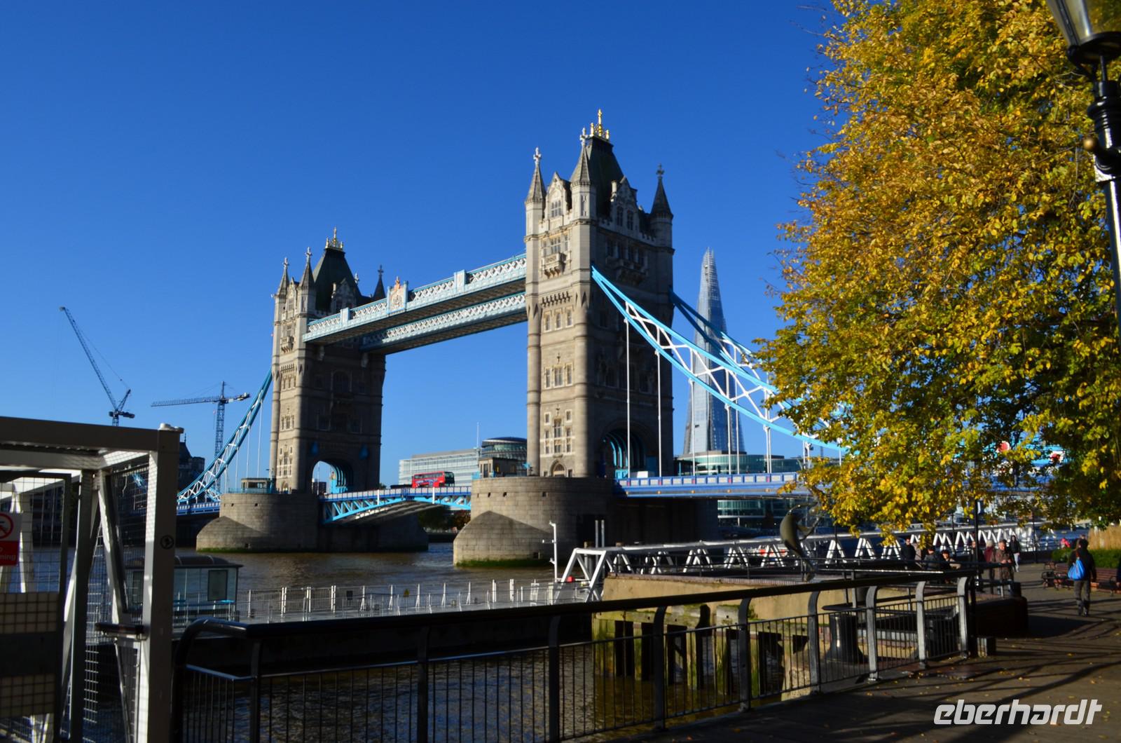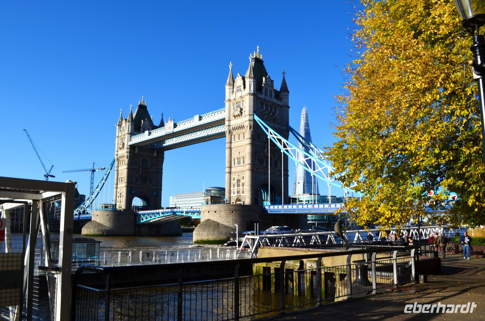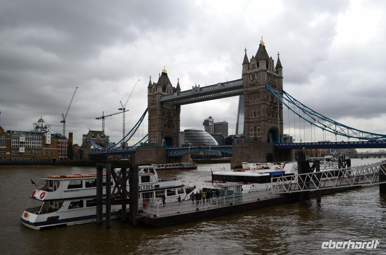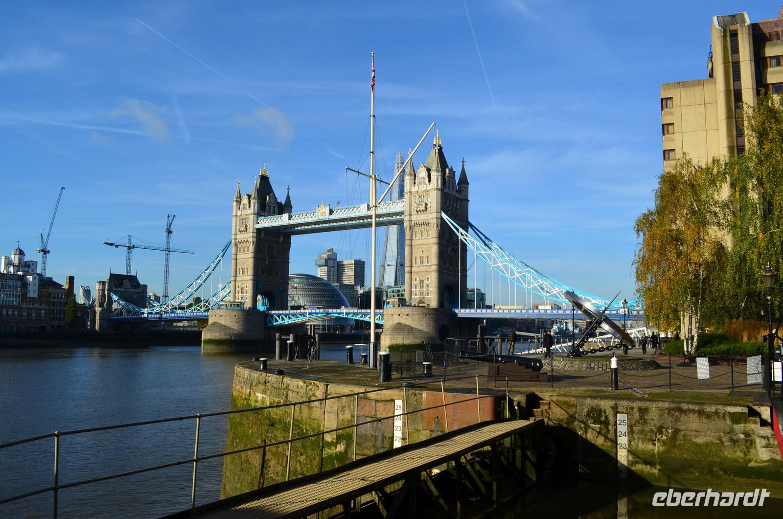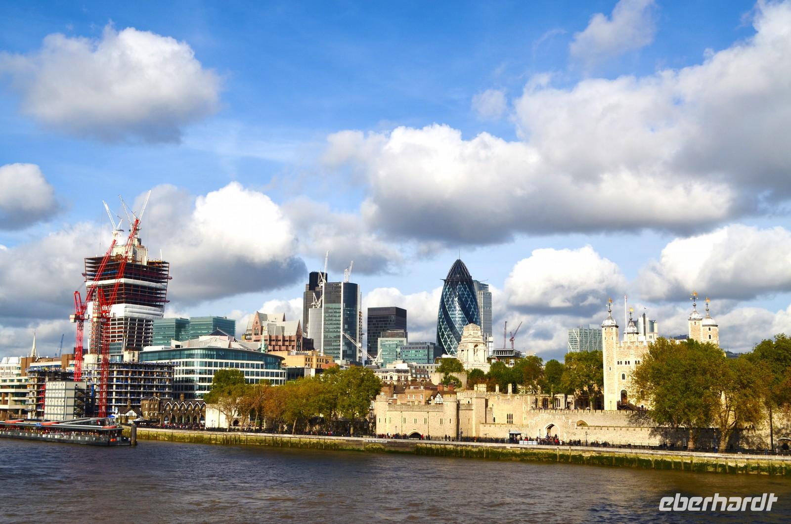 Nach dem Check Inn begrüßen wir auch unsere Fluggäste, die schon früher eingetroffen sind. Alle gemeinsam besuchen wir am Nachmittag den nahen Tower von London, laufen am Themseufer hinüber, machen die ersten Fotos der Londoner Skyline und betreten dann durch den Gruppeneingang die alte Festungsanlage, die von den „Beefeatern" bewachte und durch die Kolkraben beschützte Anlage, die von Wilhelm dem Eroberer 1078 gegründet wurde.