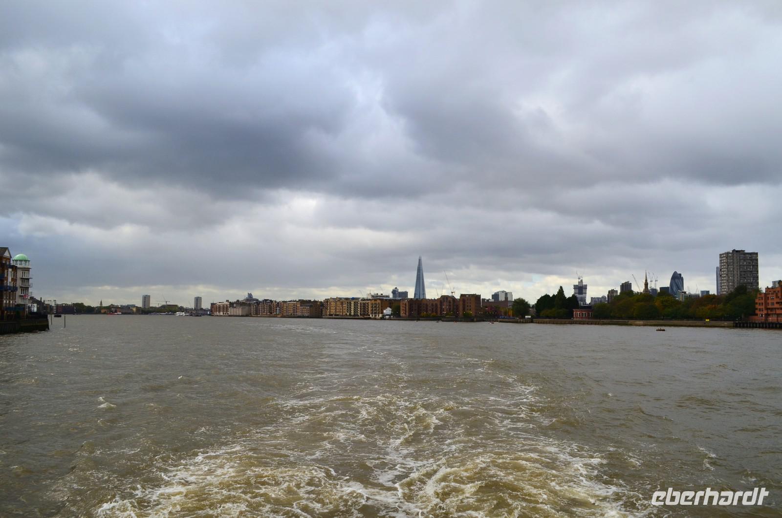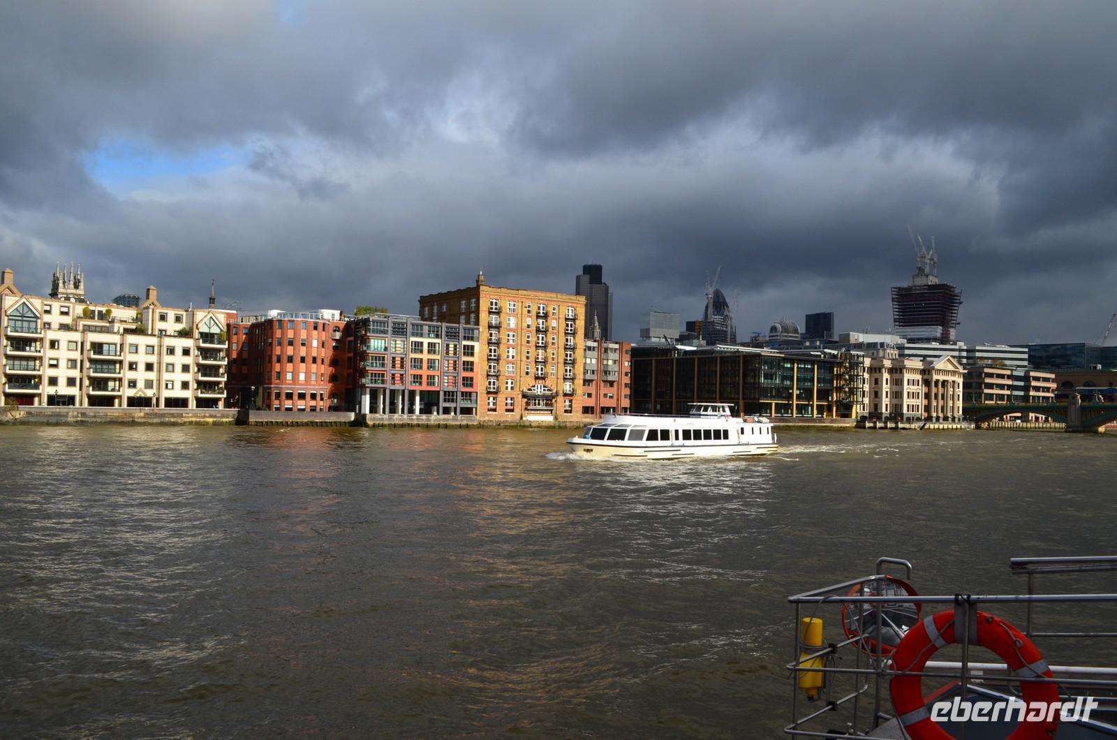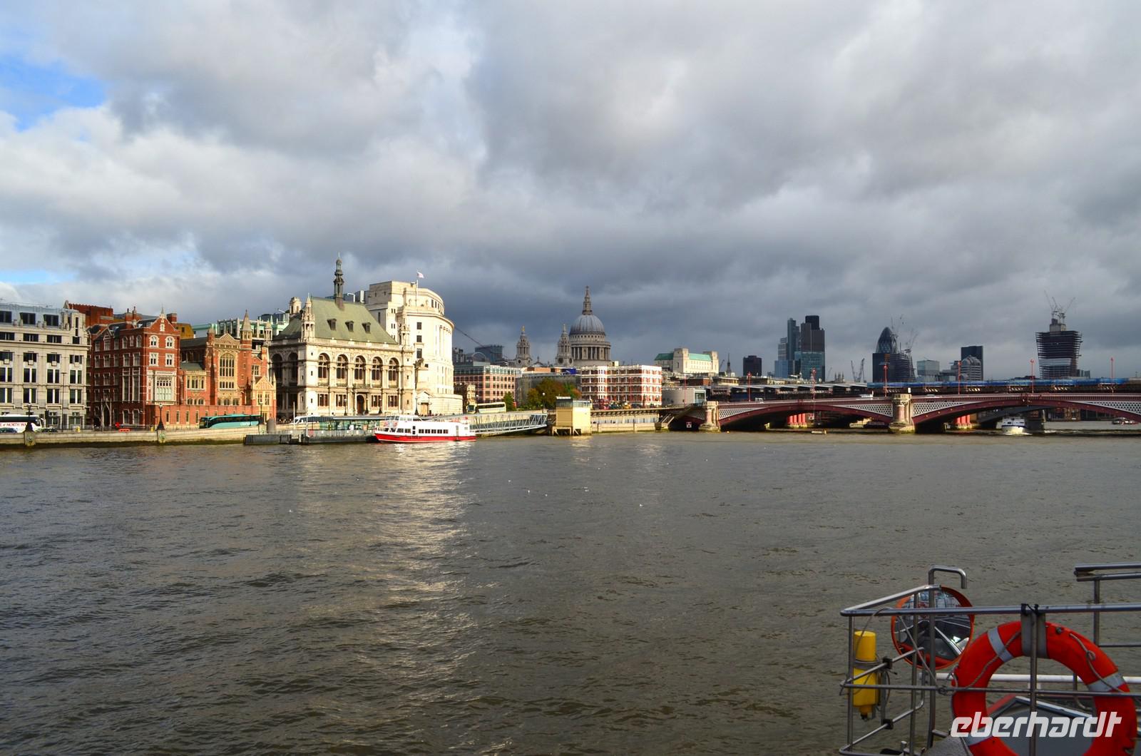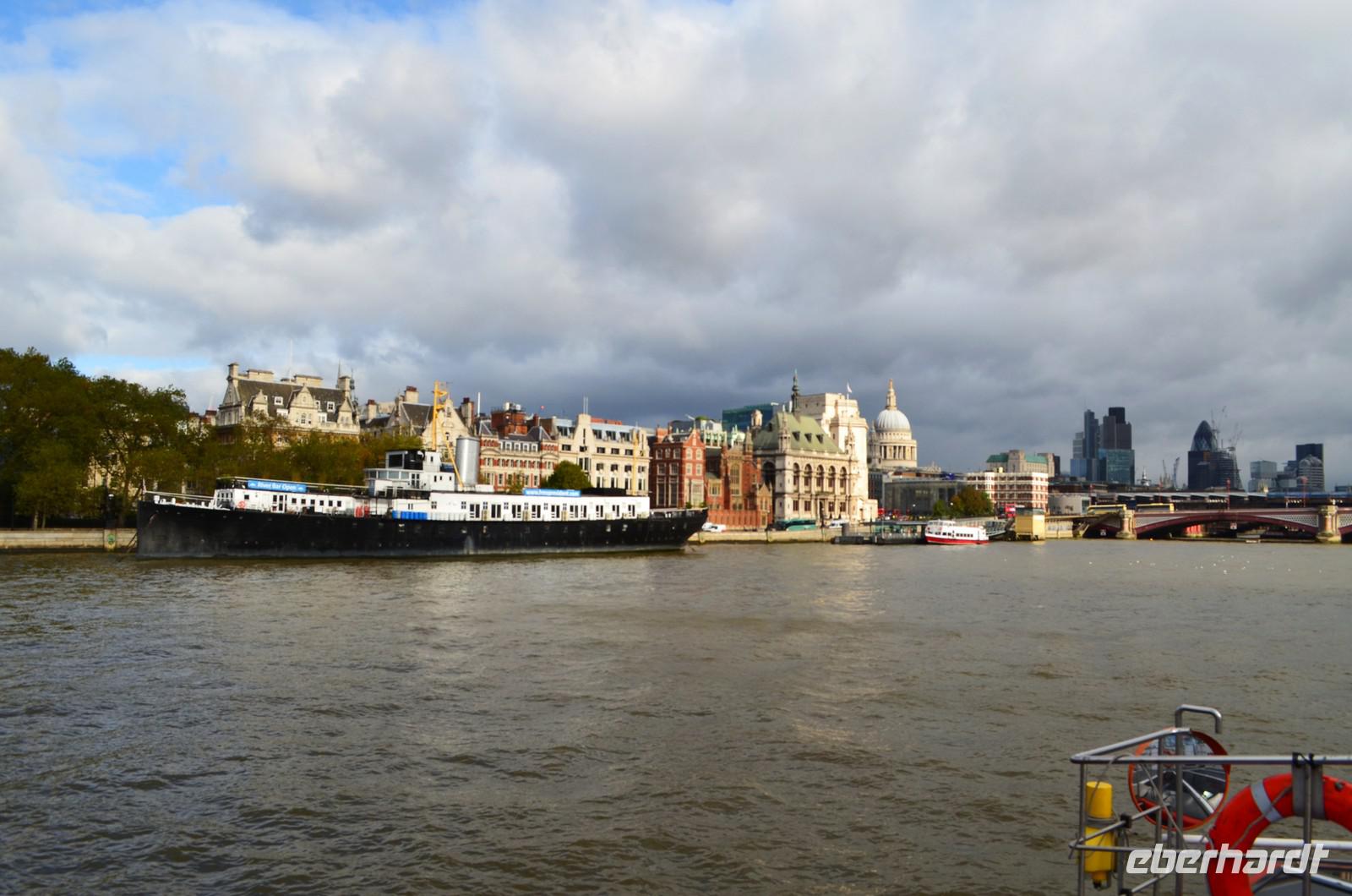 Die Stadtführerin Vicki Bick holt uns im Hotel ab und wir spazieren gemeinsam mit ihren Erklärungen hinüber zum Coachpark. Mit dem Reisebus starten wir zur Stadtrundfahrt durch London - mit Halts auf der Queen Victoria Street, zwischen St. Pauls Cathedral und Millennium Bridge, an Royal Albert Memorial und Albert Hall und schließlich enden wir am Westminster Pier. Von hier fahren wir mit dem City-Cruise-Schiff themseabwärts, mit spektakulären Ausblicken auf die Stadt, die sich gerade am Flussufer total gewandelt hat - die alten Speicher und Werften sind zu modernen Wohn- und Arbeitsorten umgebaut.