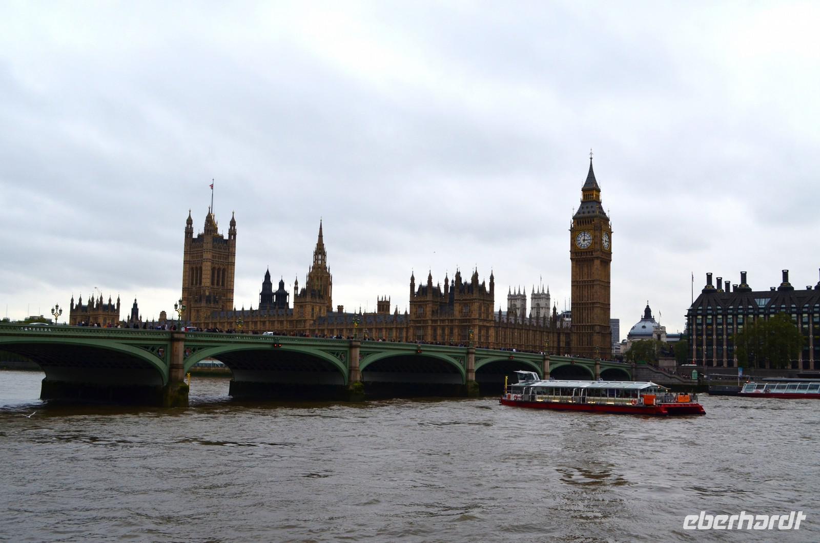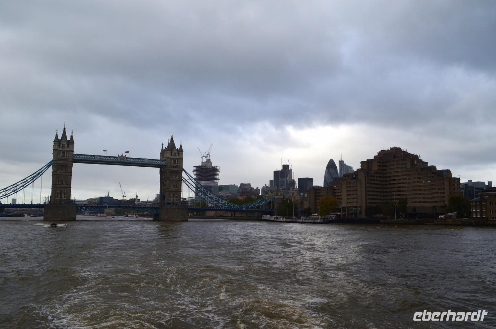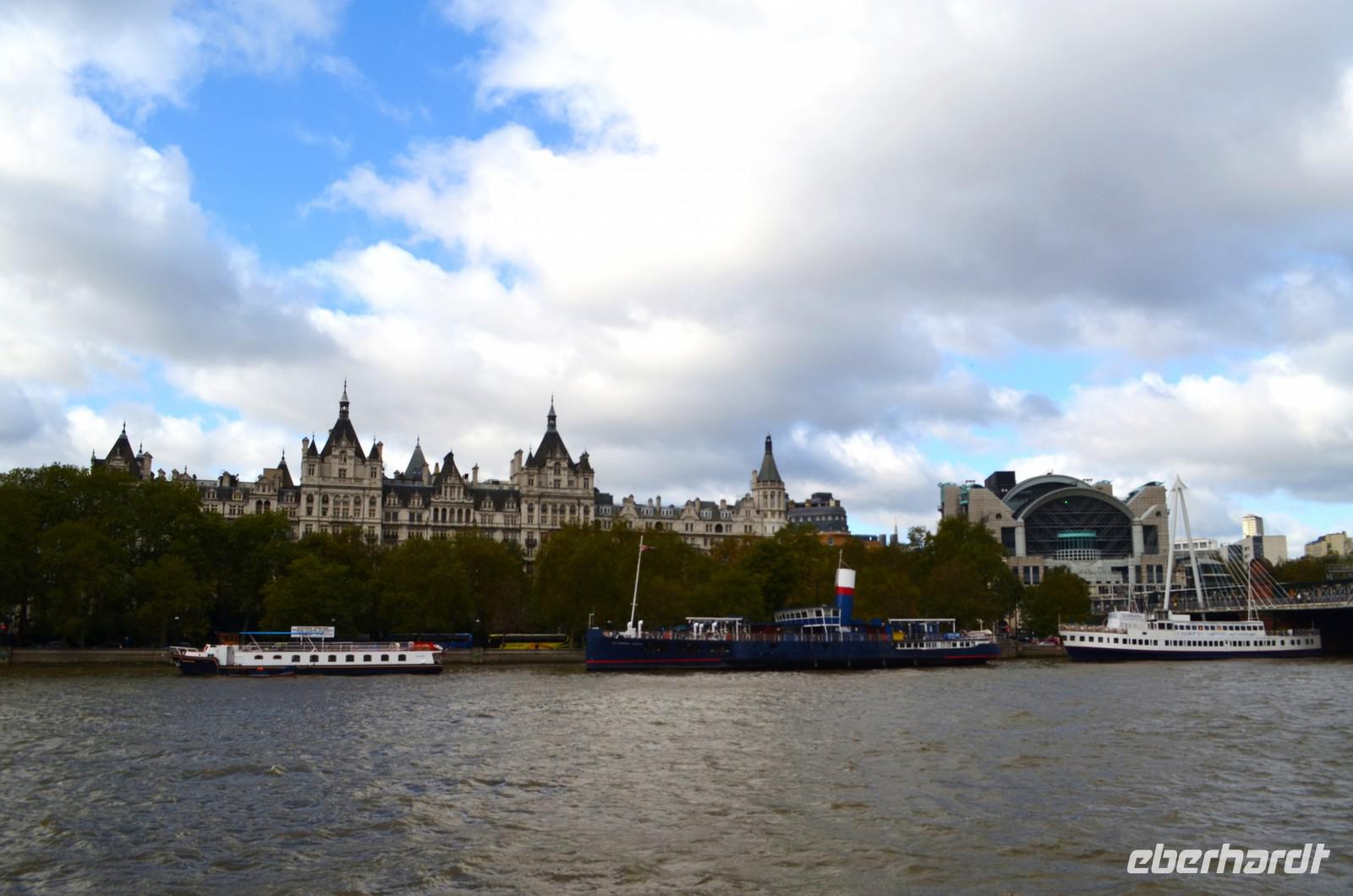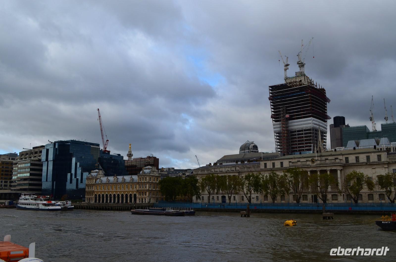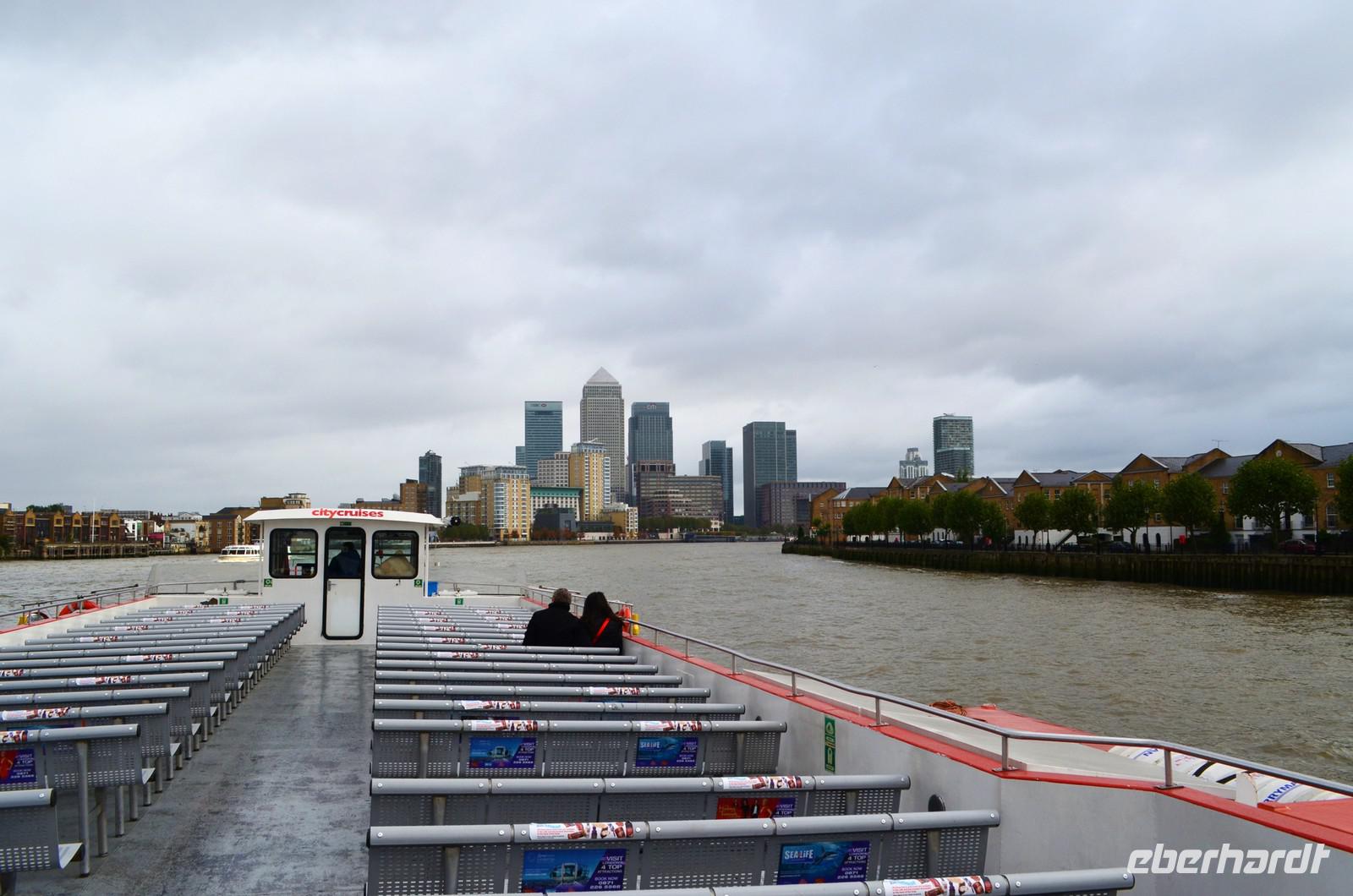 Die Stadtführerin Vicki Bick holt uns im Hotel ab und wir spazieren gemeinsam mit ihren Erklärungen hinüber zum Coachpark. Mit dem Reisebus starten wir zur Stadtrundfahrt durch London - mit Halts auf der Queen Victoria Street, zwischen St. Pauls Cathedral und Millennium Bridge, an Royal Albert Memorial und Albert Hall und schließlich enden wir am Westminster Pier. Von hier fahren wir mit dem City-Cruise-Schiff themseabwärts, mit spektakulären Ausblicken auf die Stadt, die sich gerade am Flussufer total gewandelt hat - die alten Speicher und Werften sind zu modernen Wohn- und Arbeitsorten umgebaut.