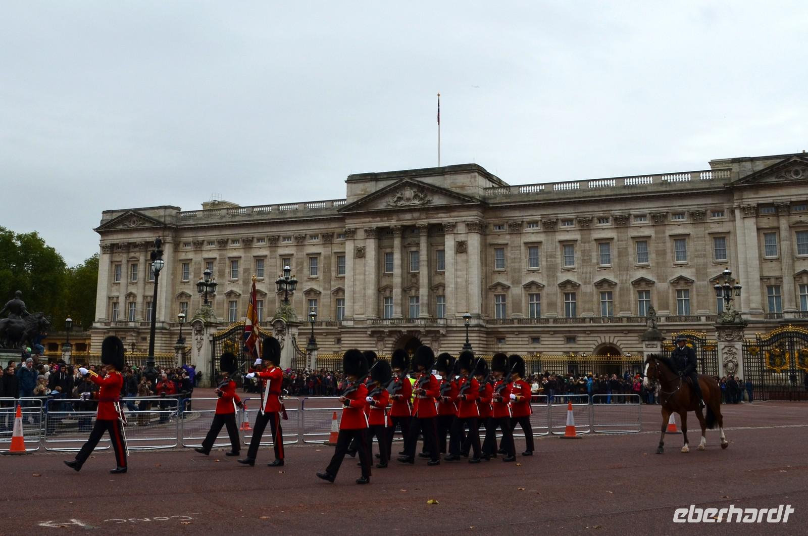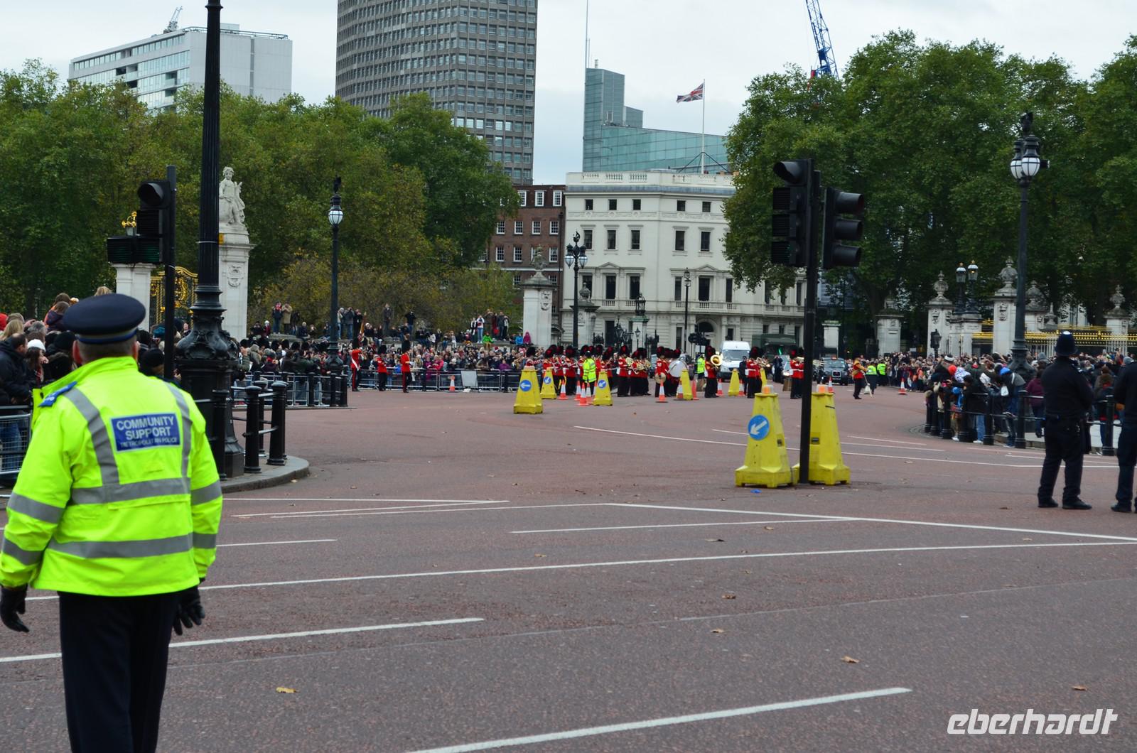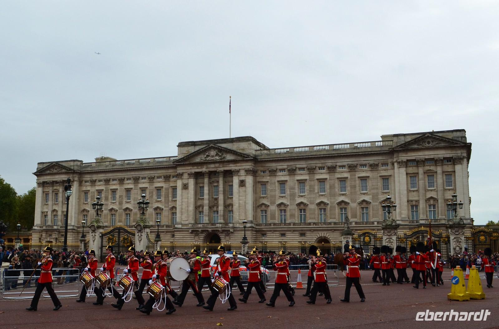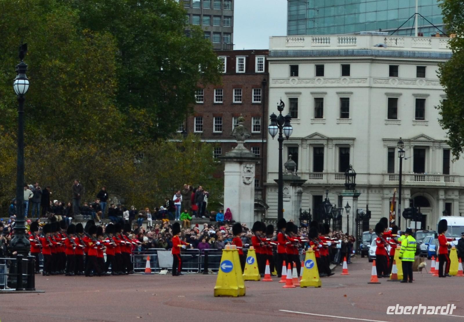 Das, Wetter ist teils heiter, teils bewölkt als wir zum Trafalgar Square fahren und dort aussteigen. Von hier führt uns der gemeinsame Fußweg über den Trafalgar Square hin zu The Mall und weiter zum St. James Park. Dabei können wir die angetretenen Horse Guards beim Morgenapell beobachten. Am See des St. James Parks entlang spazieren wir weiter zum Buckingham Palace, wo wir die große Wachablösung besuchen.