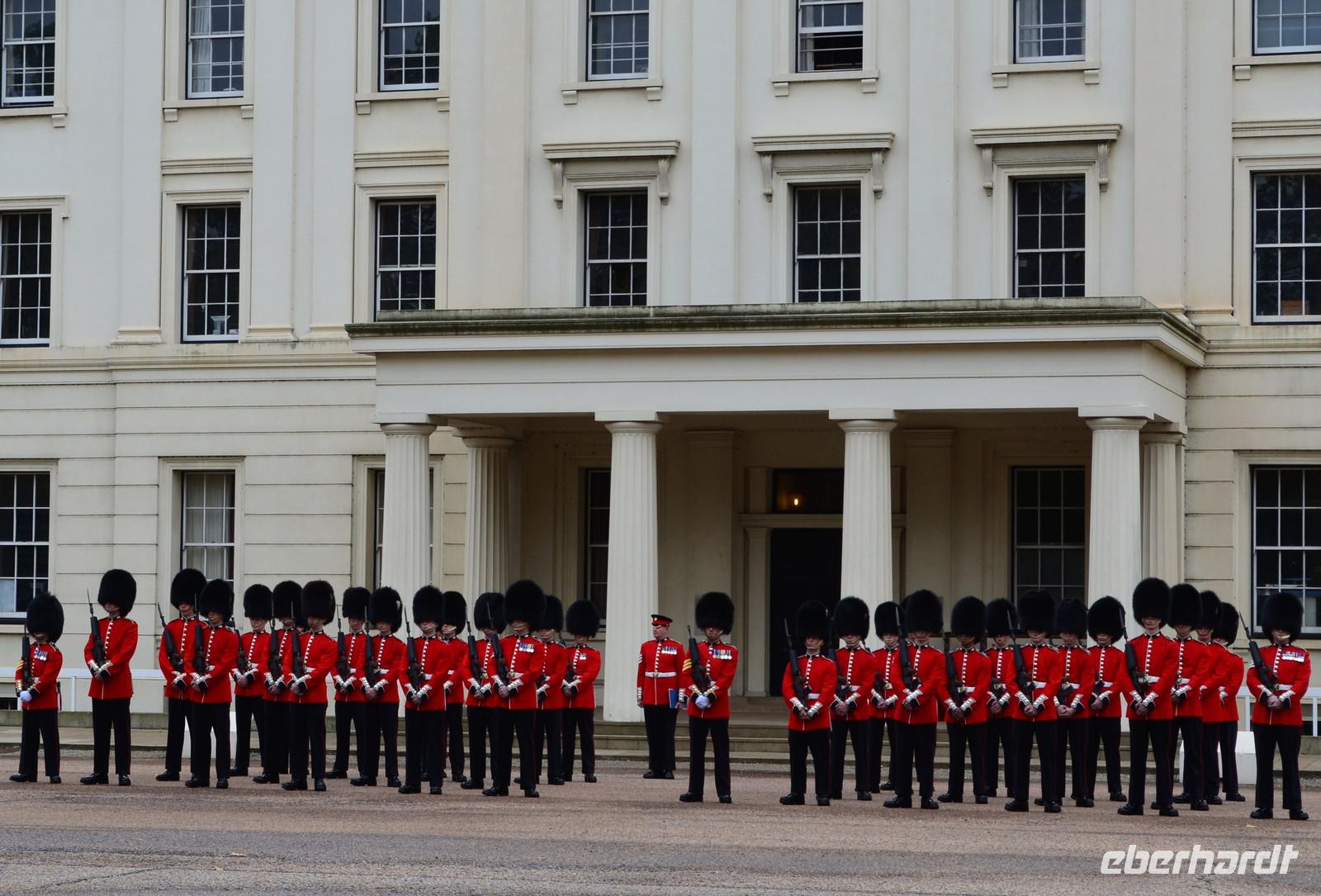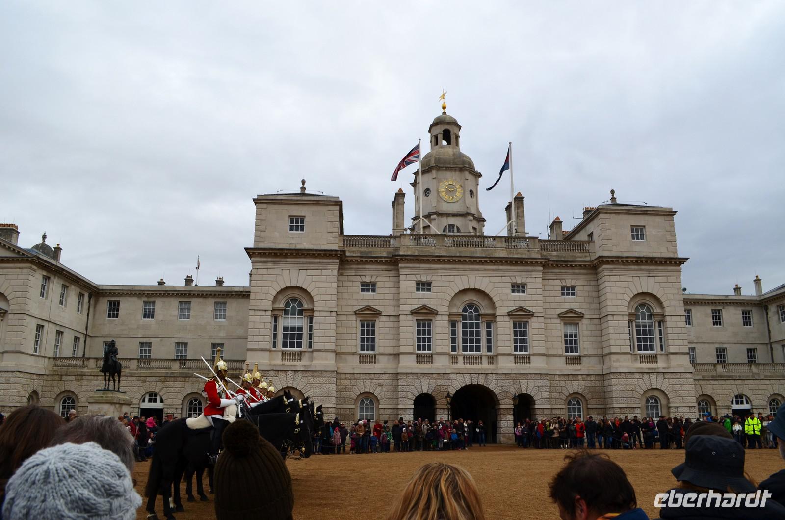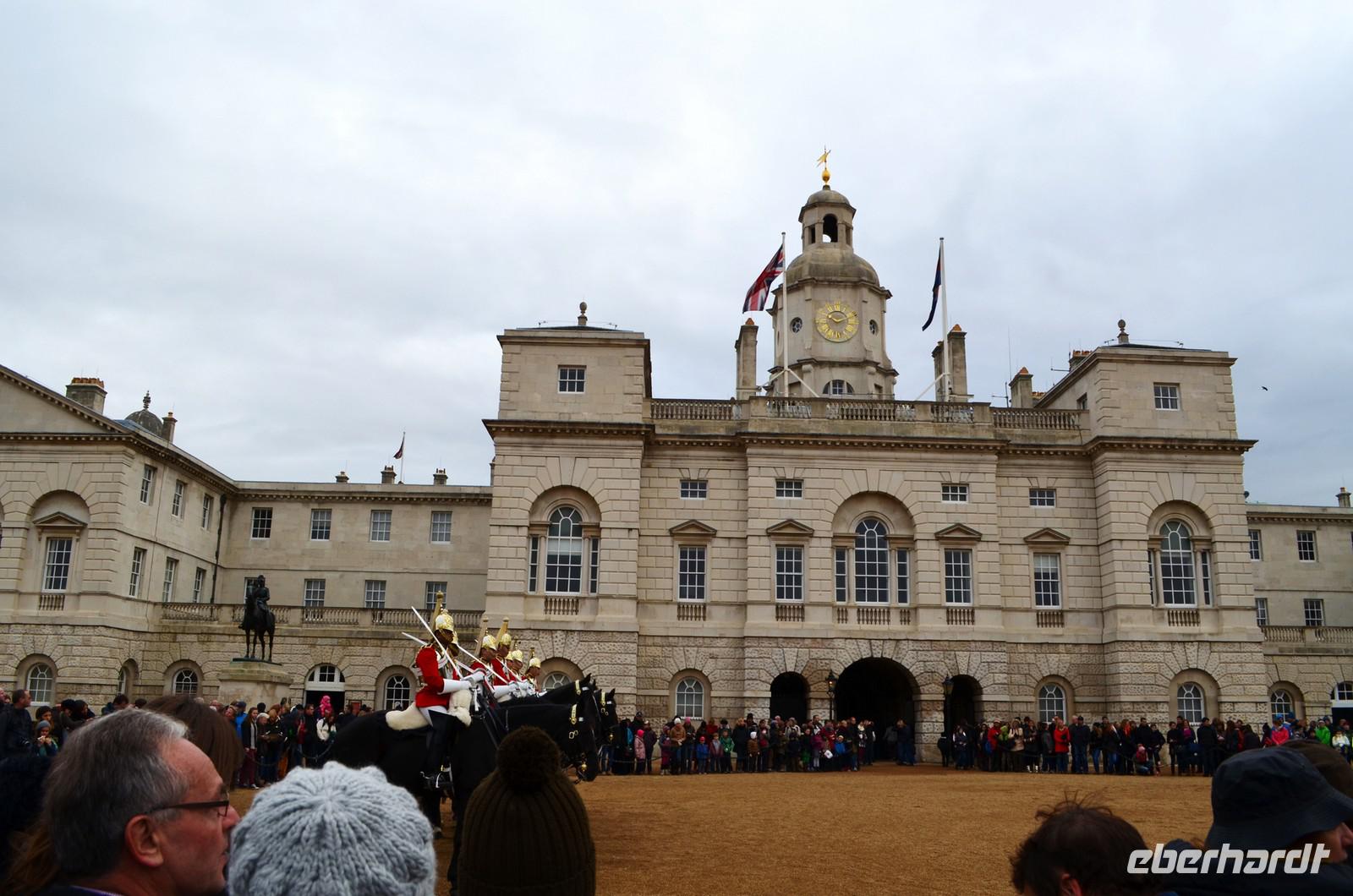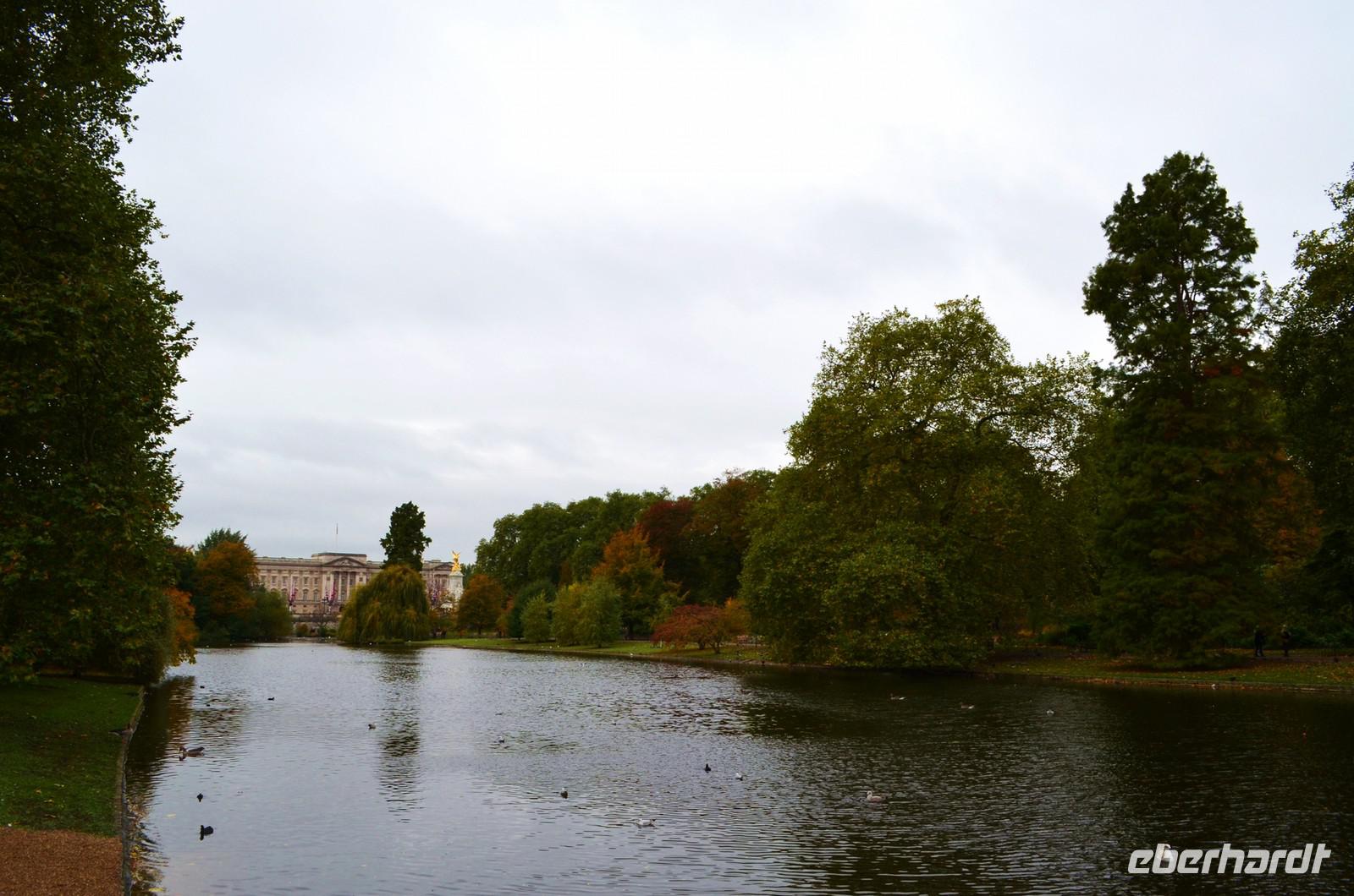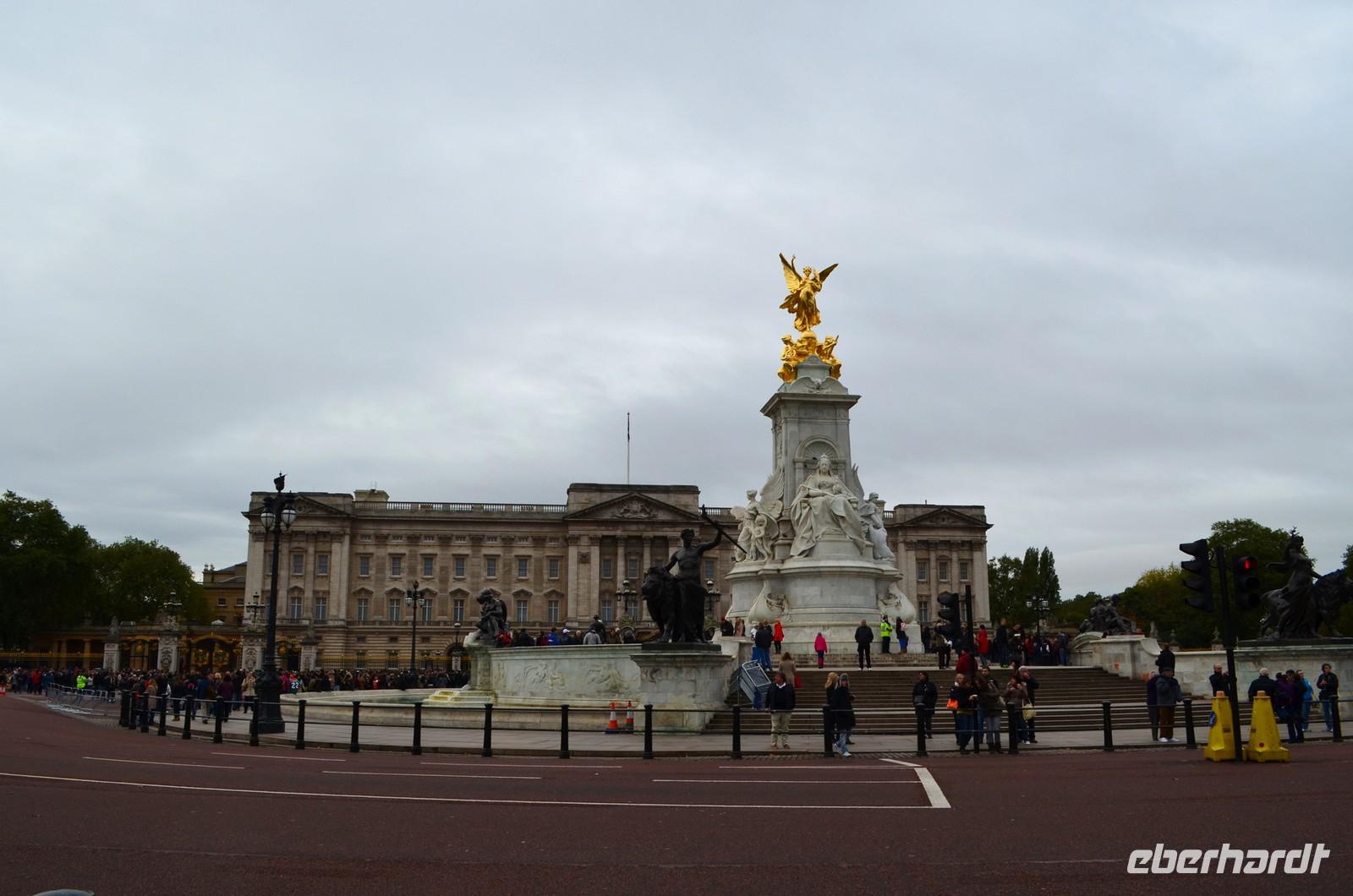 Das, Wetter ist teils heiter, teils bewölkt als wir zum Trafalgar Square fahren und dort aussteigen. Von hier führt uns der gemeinsame Fußweg über den Trafalgar Square hin zu The Mall und weiter zum St. James Park. Dabei können wir die angetretenen Horse Guards beim Morgenapell beobachten. Am See des St. James Parks entlang spazieren wir weiter zum Buckingham Palace, wo wir die große Wachablösung besuchen.