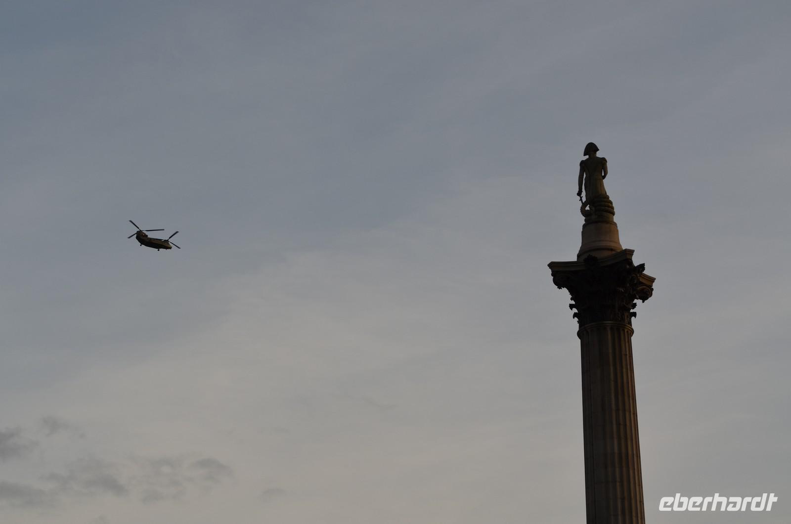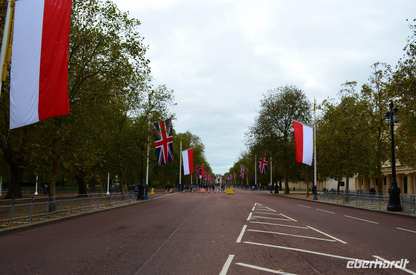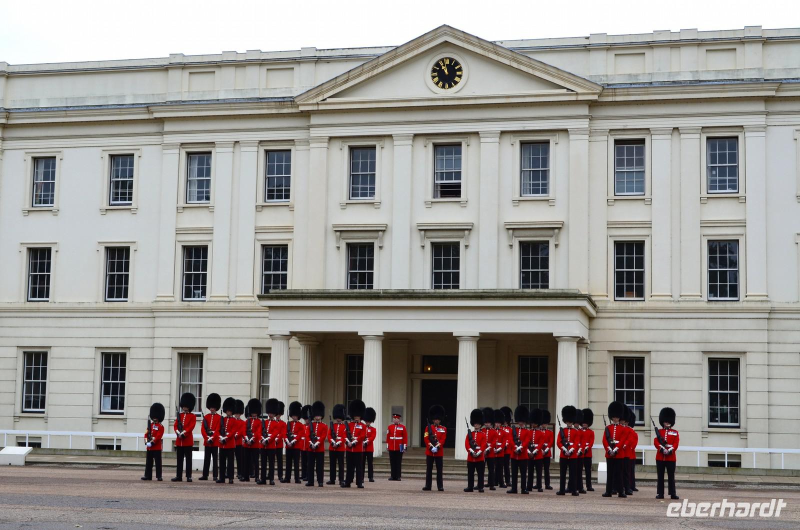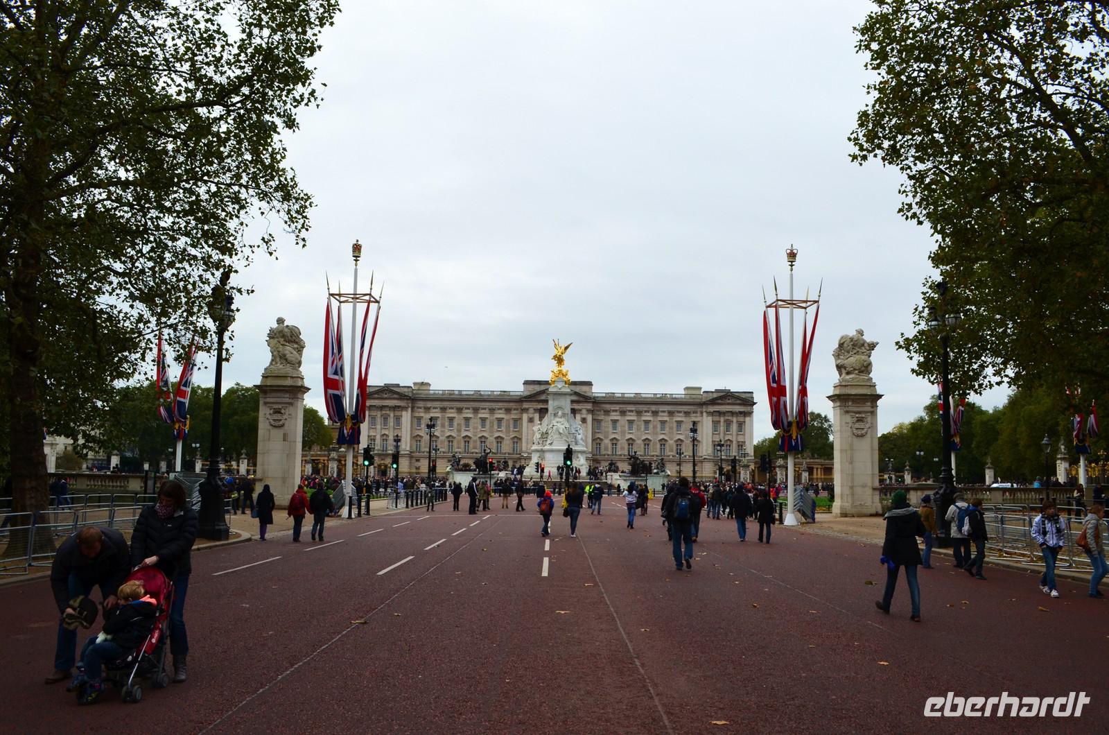 Das, Wetter ist teils heiter, teils bewölkt als wir zum Trafalgar Square fahren und dort aussteigen. Von hier führt uns der gemeinsame Fußweg über den Trafalgar Square hin zu The Mall und weiter zum St. James Park. Dabei können wir die angetretenen Horse Guards beim Morgenapell beobachten. Am See des St. James Parks entlang spazieren wir weiter zum Buckingham Palace, wo wir die große Wachablösung besuchen.