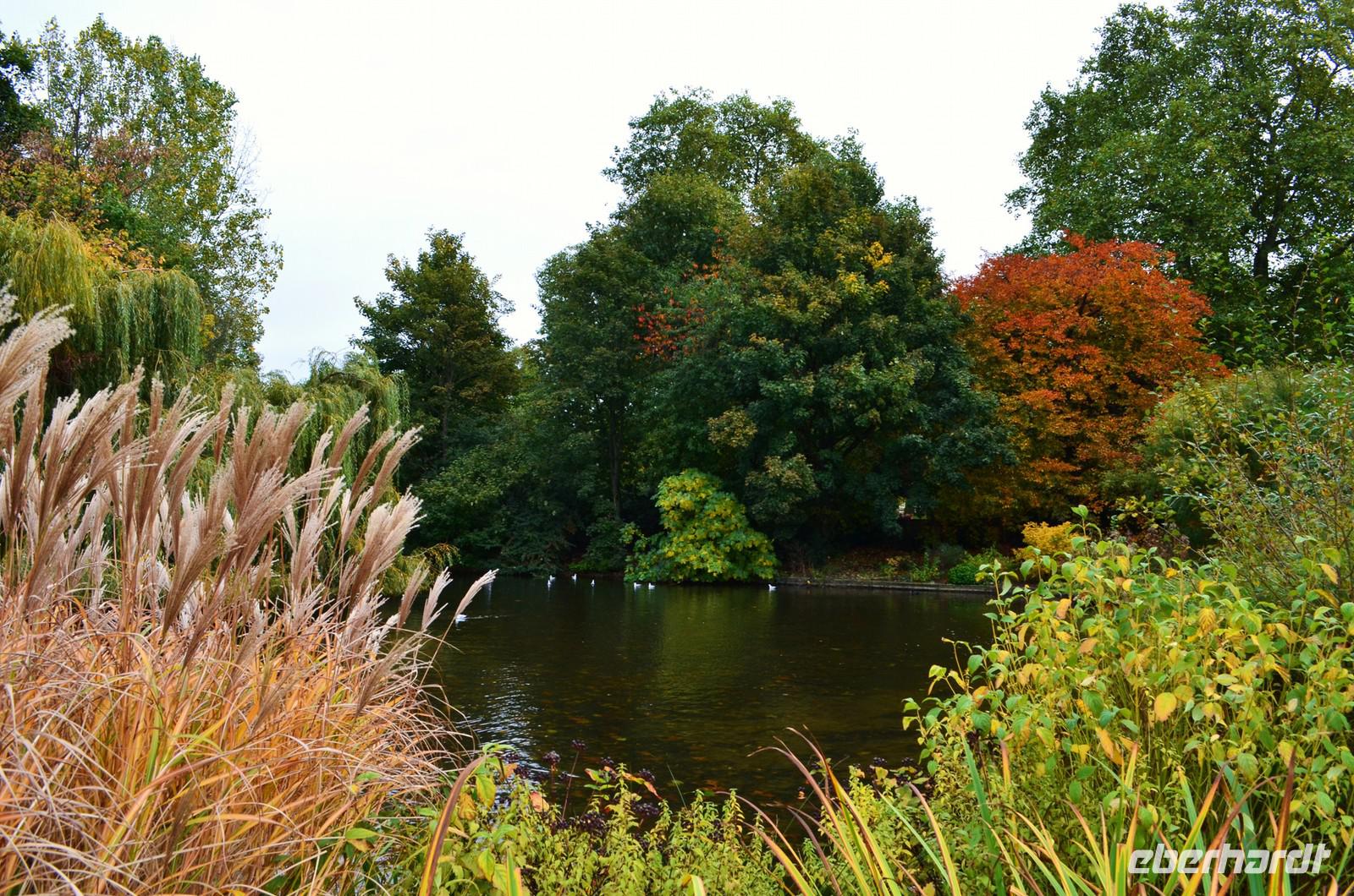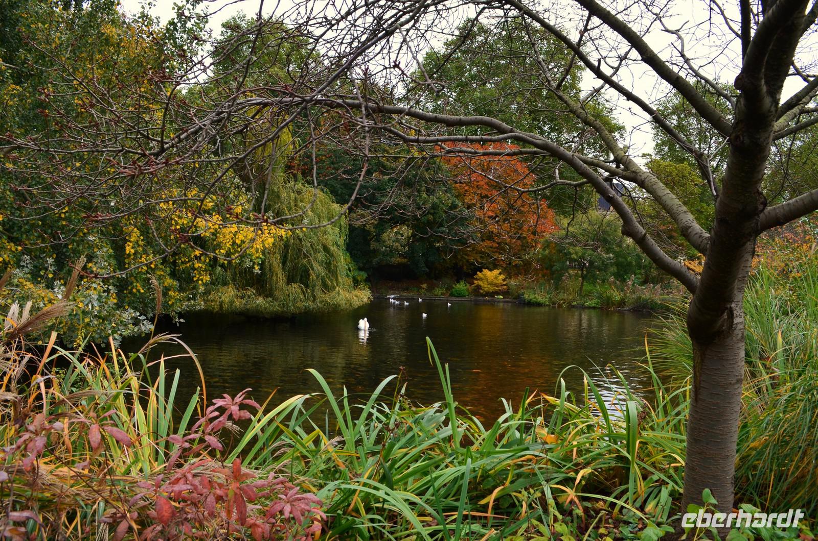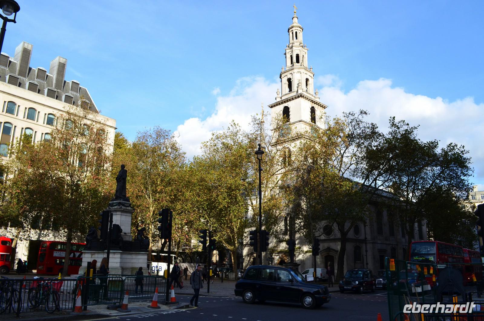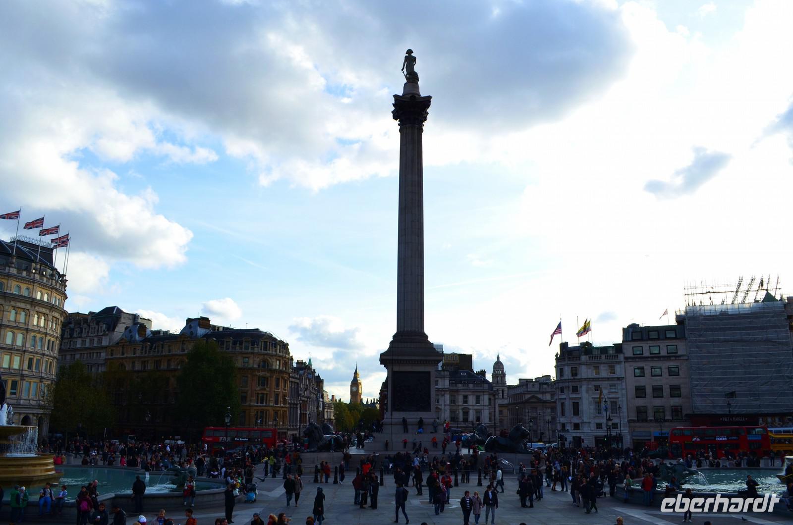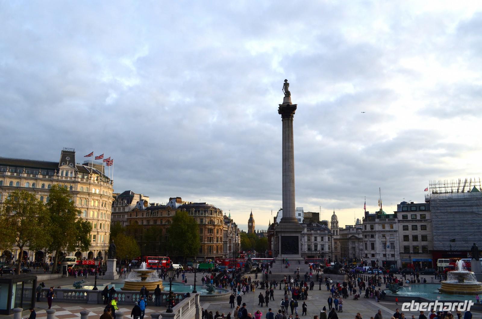 Das, Wetter ist teils heiter, teils bewölkt als wir zum Trafalgar Square fahren und dort aussteigen. Von hier führt uns der gemeinsame Fußweg über den Trafalgar Square hin zu The Mall und weiter zum St. James Park. Dabei können wir die angetretenen Horse Guards beim Morgenapell beobachten. Am See des St. James Parks entlang spazieren wir weiter zum Buckingham Palace, wo wir die große Wachablösung besuchen.