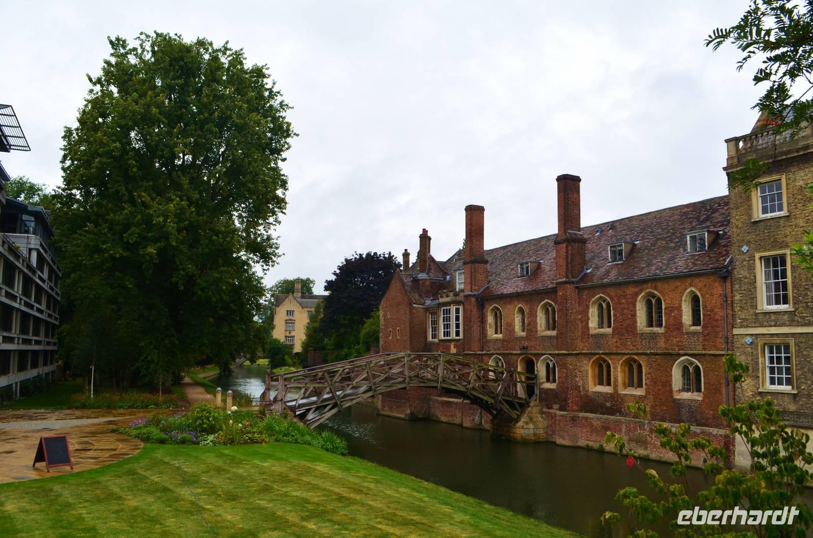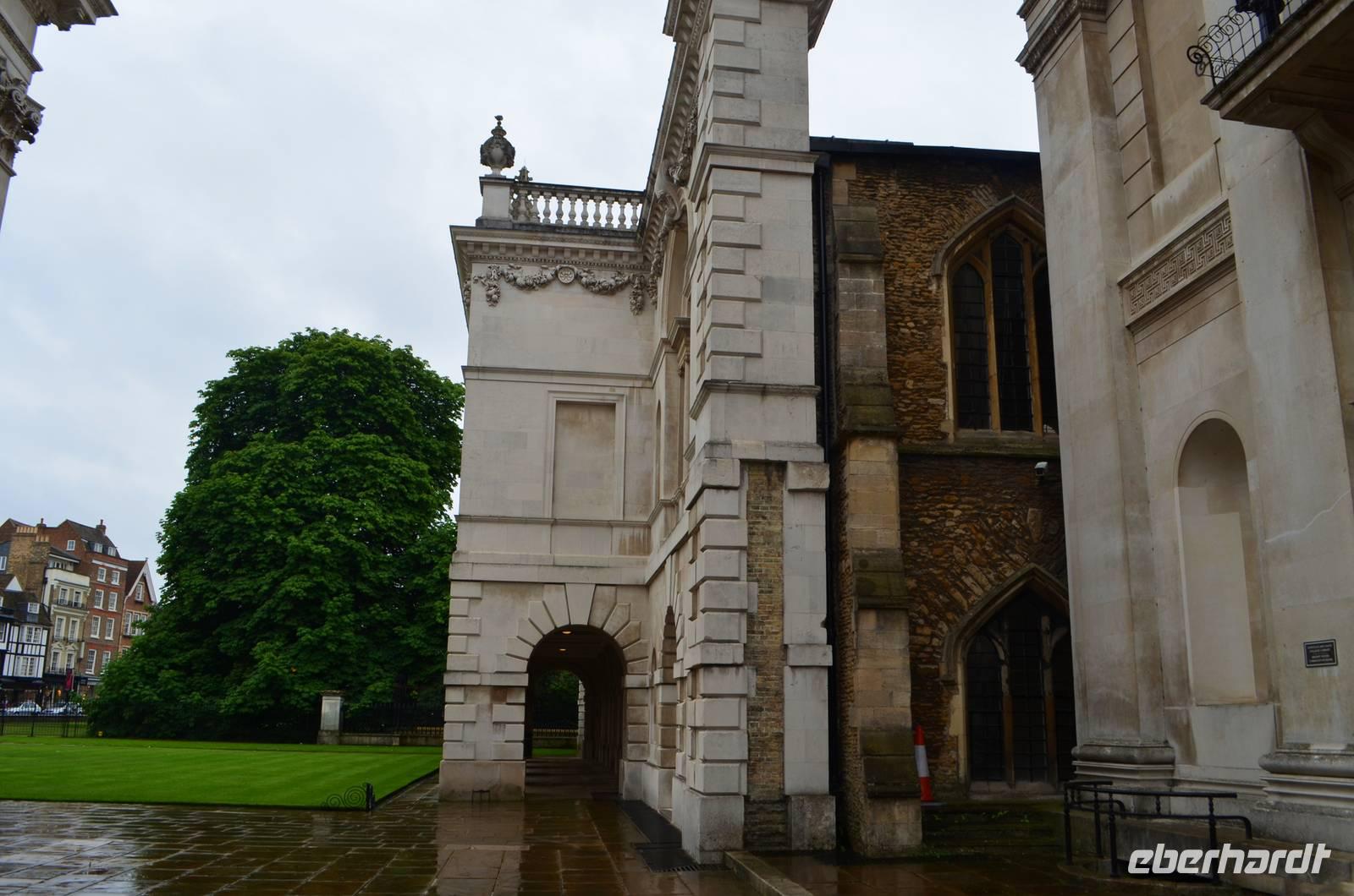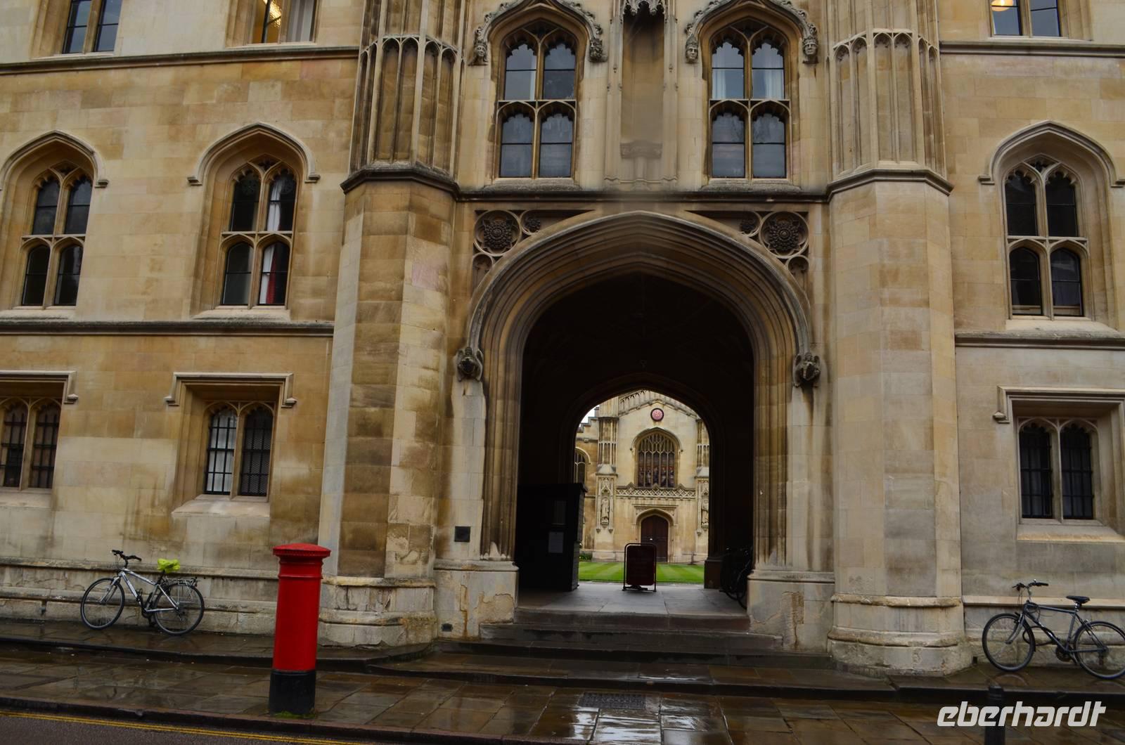 Nach der Einreisekontrolle an der Grenze zum Vereinigten Königreich fahren wir Richtung Cambridge, der Universitätsstadt am Flüsschen Cam. Dort, an unserem ersten Tagesziel, erwartet uns unsere Gästeführerin Catherine Hall, die uns schon freudig winkend begrüßt. Sie hat noch eine Kollegin mitgebracht und so teilen wir uns in zwei kleinere Gruppen für die Besichtigung. Leider regnet es ein bisschen.