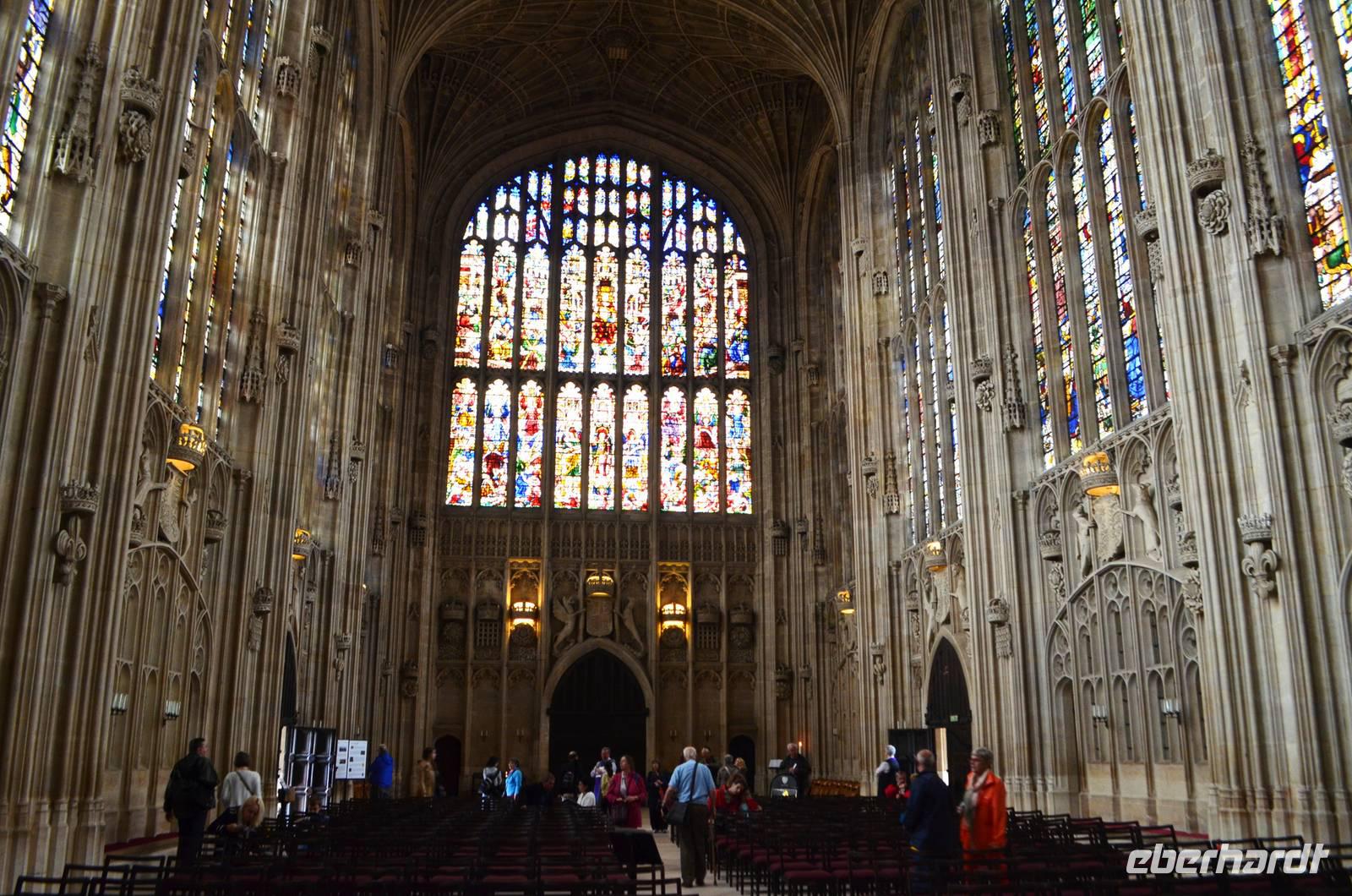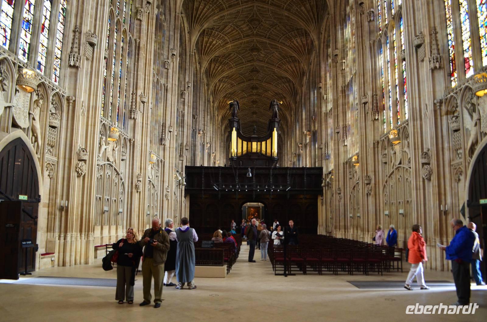 Unser gemeinsamer Spaziergang führt uns hinein und durch das Zentrum von Cambridge. Cathy, bzw. ihre Freundin, erklären uns die Gebäude der zahlreichen Colleges, die Geschichte und die Bräuche im Schulbetrieb sowie deren Integration in die berühmte Universität der Stadt. Den Höhepunkt des Rundganges bildet zweifellos die Besichtigung der wunderschönen Kapelle des 1441 gegründeten King´s College. Unvergleichlich hier die wunderschöne englische Spätgotik.