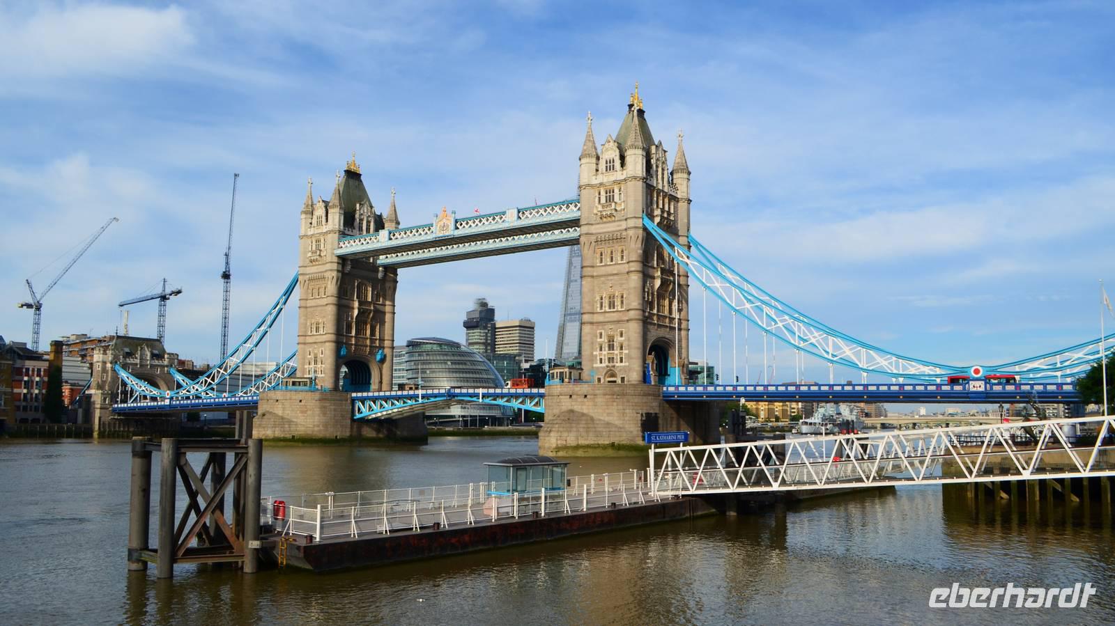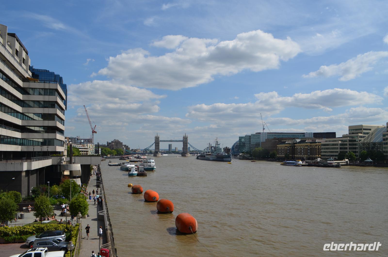 Das so schön an der Tower Bridge gelegen Hotel bietet zahlreiche Frühstücks-möglichkeiten in verschiedenen Restaurants. Dazu wagt sich die Sonne zögerlich durch die etwas grauen Wolken.