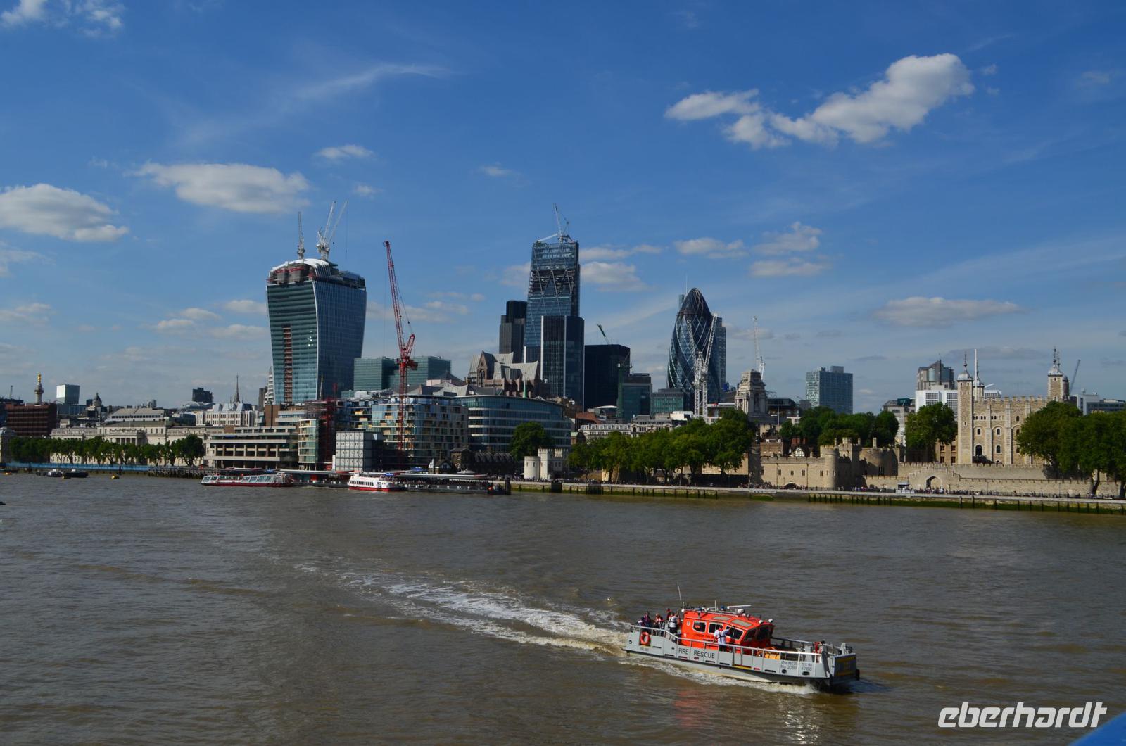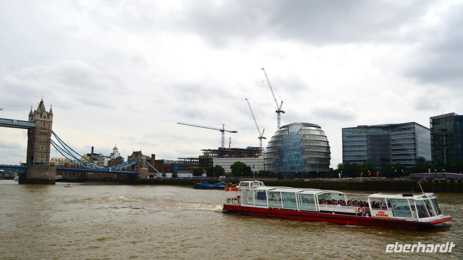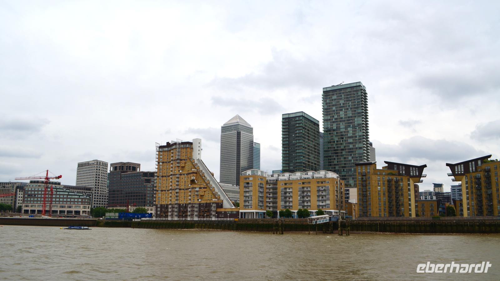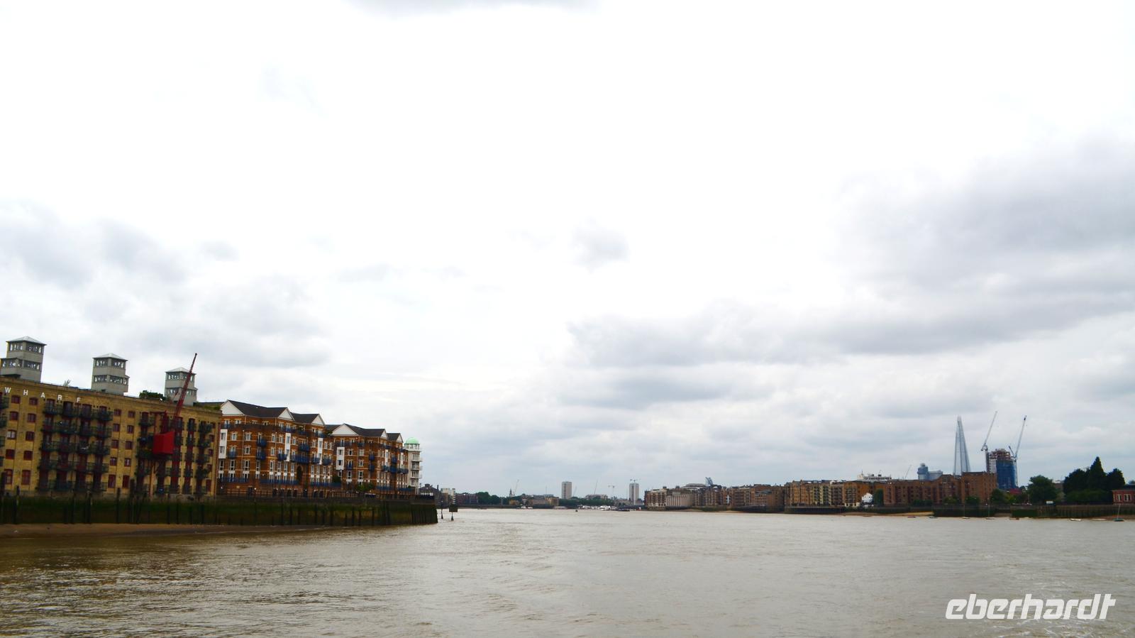 Tony hat alles wunderbar erklärt und so erkennen wir vieles auf unserer anschließenden Fahrt mit dem City-Cruise-Schiff themseabwärts wieder. Spektakuläre Ausblicke auf die Stadt eröffnen sich vom Fluss aus. Gerade an den Flussufern hat sich die Stadt in den letzen Jahren und im Zuge der olympischen Spiele total gewandelt. Die alten Speicher und Werften sind zu modernen Wohn- und Arbeitsorten umgebaut worden und bilden attraktive Ensemble.